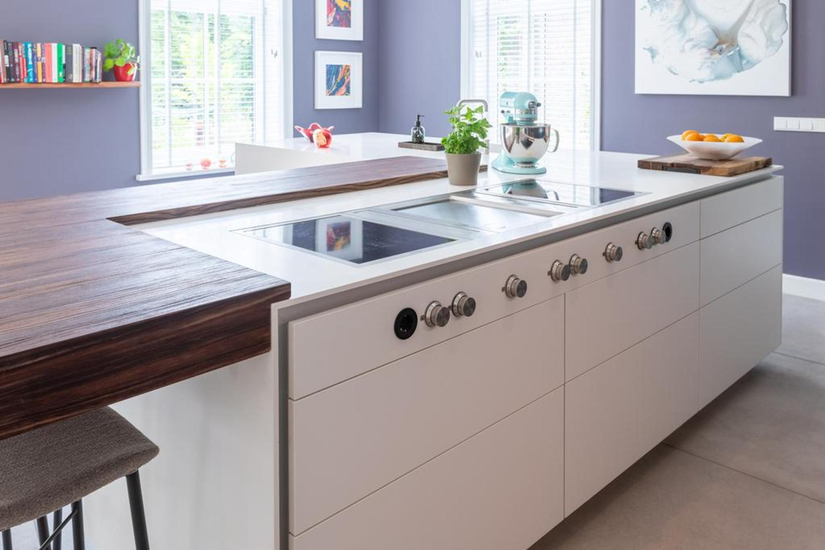 Leefkeuken: De keuken staat in directe verbinding met de living en serre, de opstelling is maatwerk en uitgevoerd met een vloer van keramische vloertegels met vloerverwarming, luxe inbouwapparatuur van Gaggenau en een L-vormig kook- en spoeleiland, alsmede eetbar. Het eiland is voorzien van een spoelgedeelte met Quooker en een zogenaamde vario Gaggenau kookplaat met inductie, teppanyaki plaat, een geïntegreerd afzuigsysteem en bedieningsknoppen op het verticale oppervlak van het keukenmeubel. Heel praktisch zijn er twee vaatwassers. Tevens vindt u hier een ruime kastenwand met een ingebouwde televisie, wijn klimaat koelkast, koelkast, stoomoven, oven en warmhoudlade. Bijkeuken: Achter de kastenwand van de keuken, is heel verassend de bijkeuken gesitueerd. Hier staat eveneens de hybride warmtepomp, WTW installatie en opstelplaats wasapparatuur.