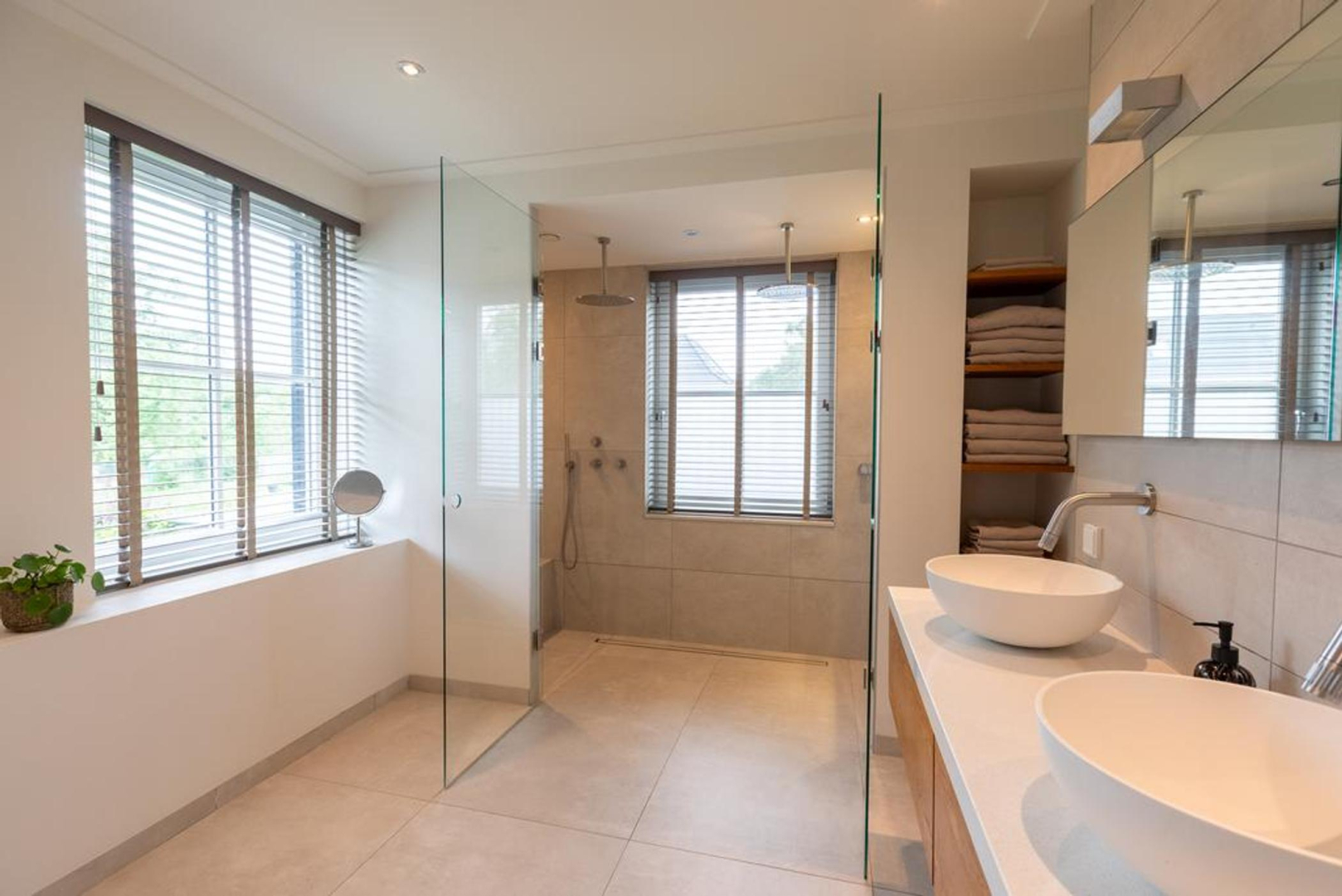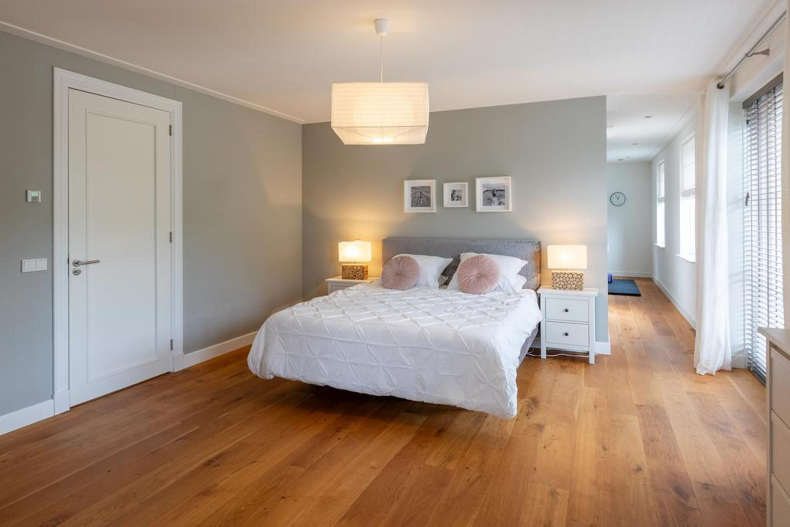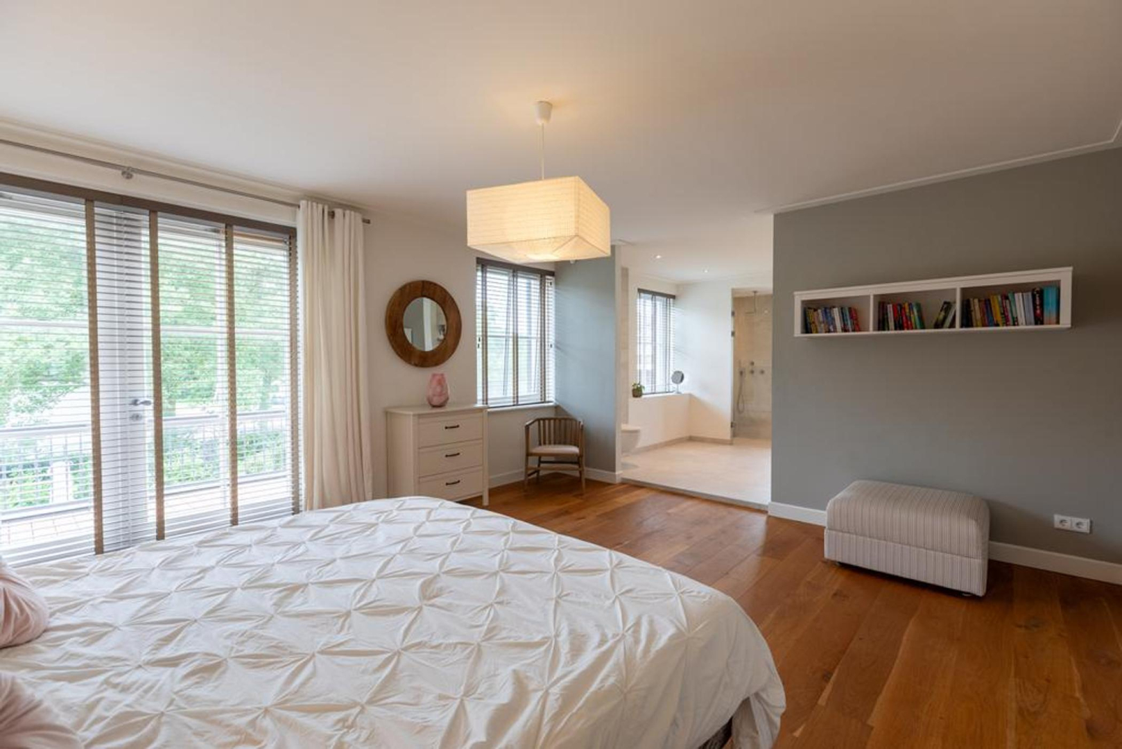 1st floor: On the 1st floor you will find the spacious master bedroom with adjoining balcony of approx. 28 m² and with a view over the sunny garden. The open bathroom has a double rain shower and side shower jets, closed off by glass doors, an oak wall hung washing unit with 2 separate basins and toilet. The finish is high level. There is also a large walk-in closet with lighting and drawers. In addition, this master bedroom has its own fitness / yoga room, which can also be used as an office. On this floor there are two more large and bright bedrooms and a 2nd bathroom.