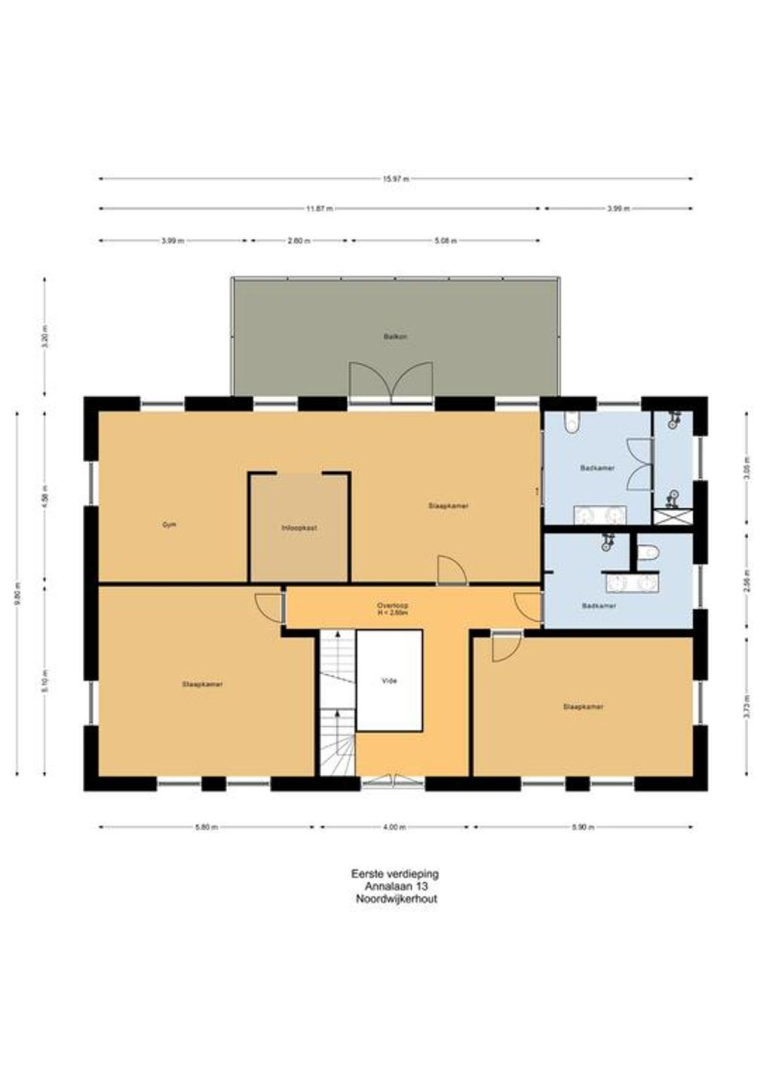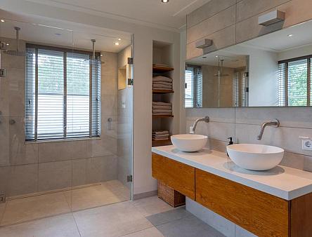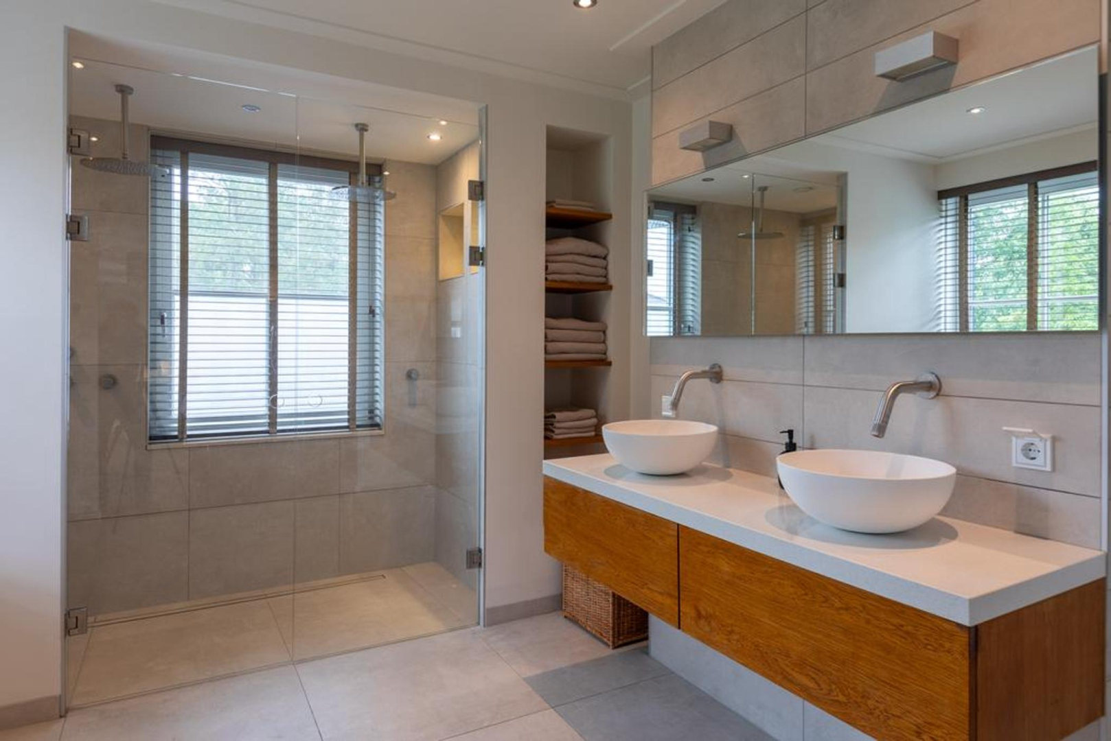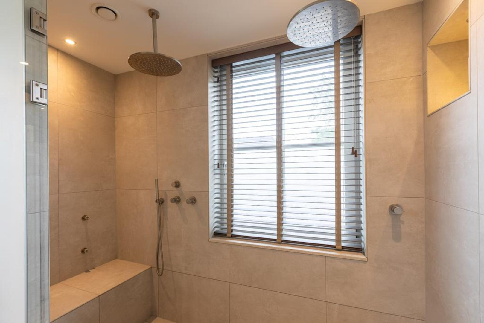 1st floor: On the 1st floor you will find the spacious master bedroom with adjoining balcony of approx. 28 m² and with a view over the sunny garden. The open bathroom has a double rain shower and side shower jets, closed off by glass doors, an oak wall hung washing unit with 2 separate basins and toilet. The finish is high level. There is also a large walk-in closet with lighting and drawers. In addition, this master bedroom has its own fitness / yoga room, which can also be used as an office. On this floor there are two more large and bright bedrooms and a 2nd bathroom.