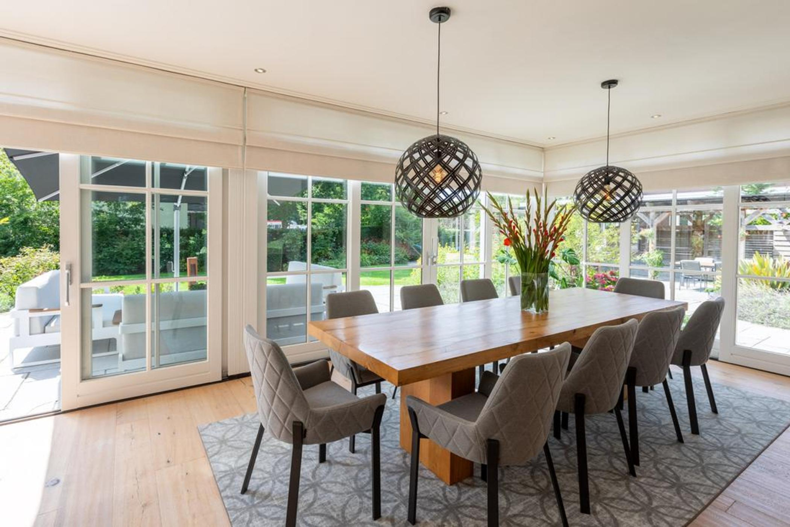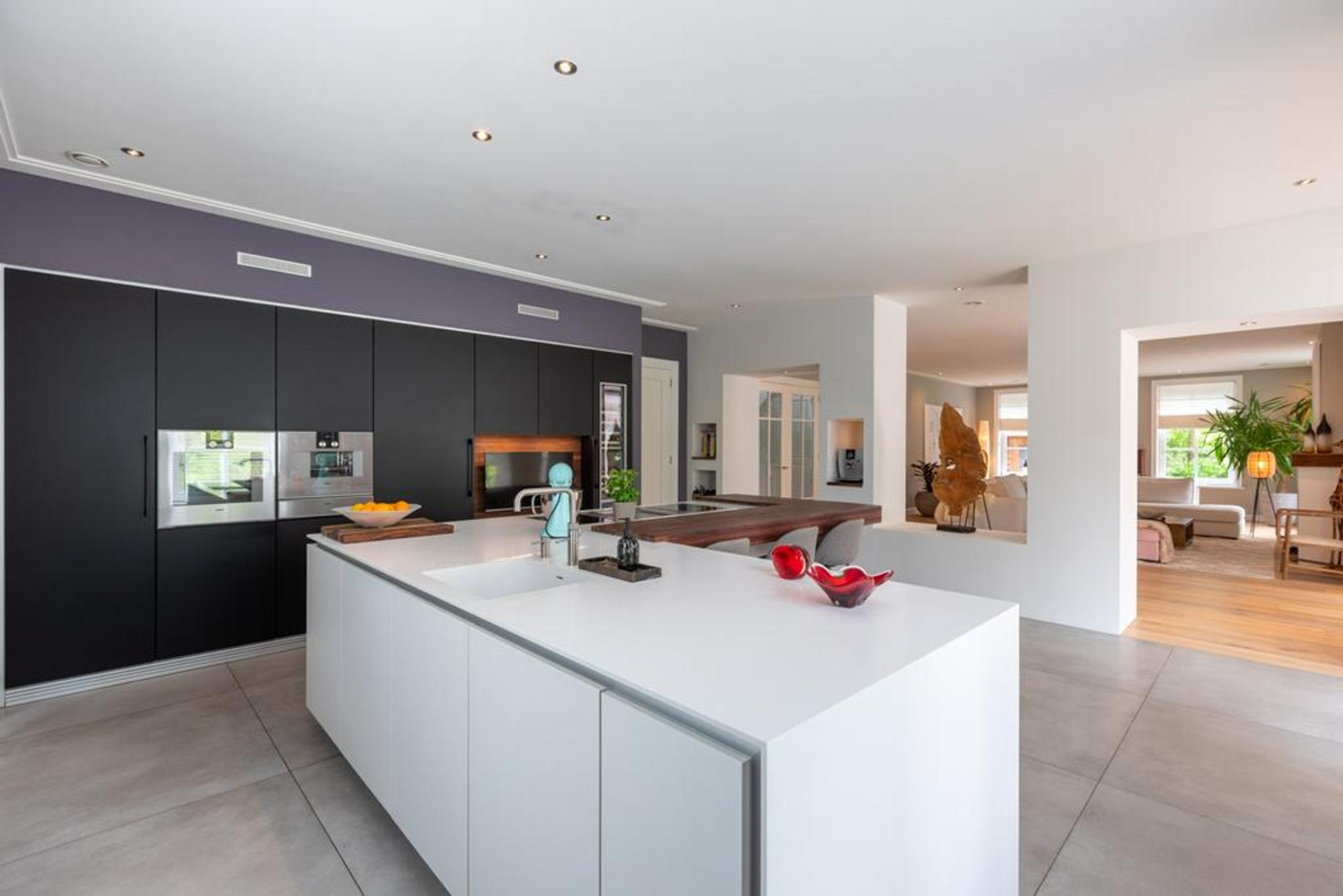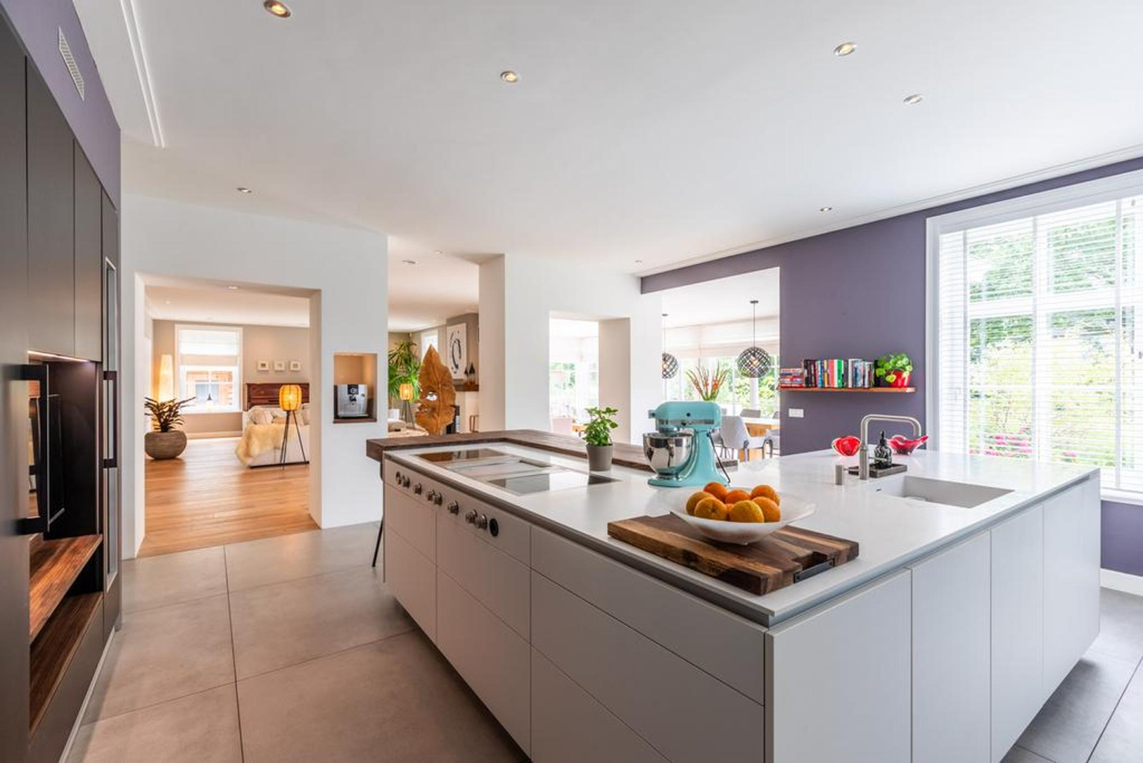Kitchen: The custom-made kitchen is directly connected to the living room and conservatory. There are ceramic floor tiles with underfloor heating. The layout is L-shaped and practical. It is fully-equipped with luxury built-in appliances from Gaggenau. It has a cooking and rinsing island, as well as a breakfast bar. The island is equipped with a Quooker and vario Gaggenau hob with induction, teppanyaki plate, an integrated extractor system with control buttons on the vertical surface of the kitchen furniture. For practical reasons, there are two dishwashers. You will also find a spacious cupboard wall with a built-in television, wine climate refrigerator, refrigerator, steam oven, oven and warming drawer. Utility room: This is adjacent to the kitchen and ideally located. Here you will find the hybrid heat pump, WTW installation and location for both washing machine and dryer. The space offers room for extra storage/freezer etc.