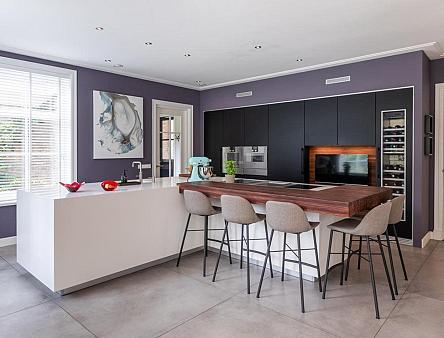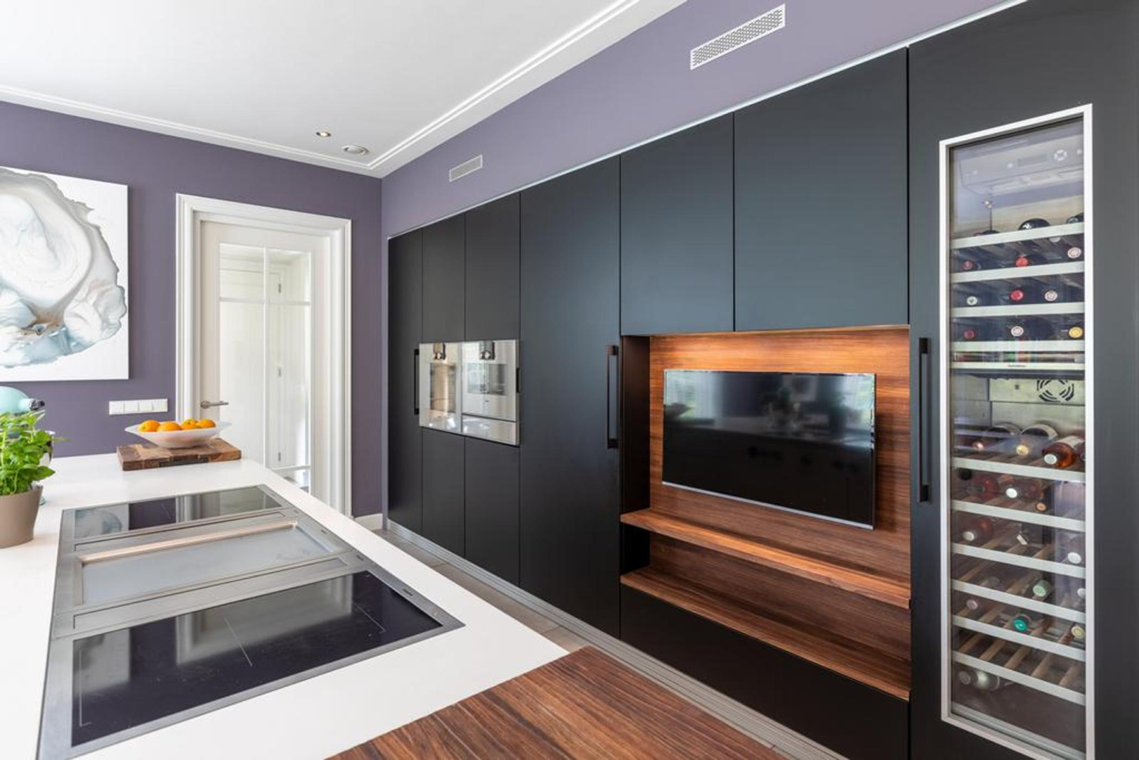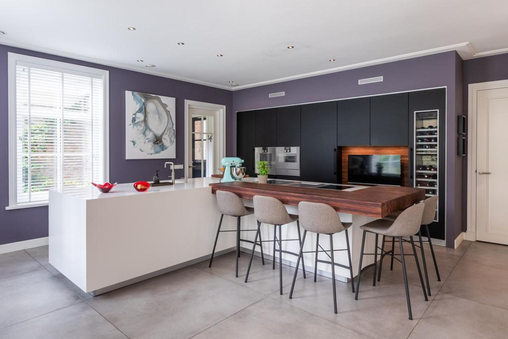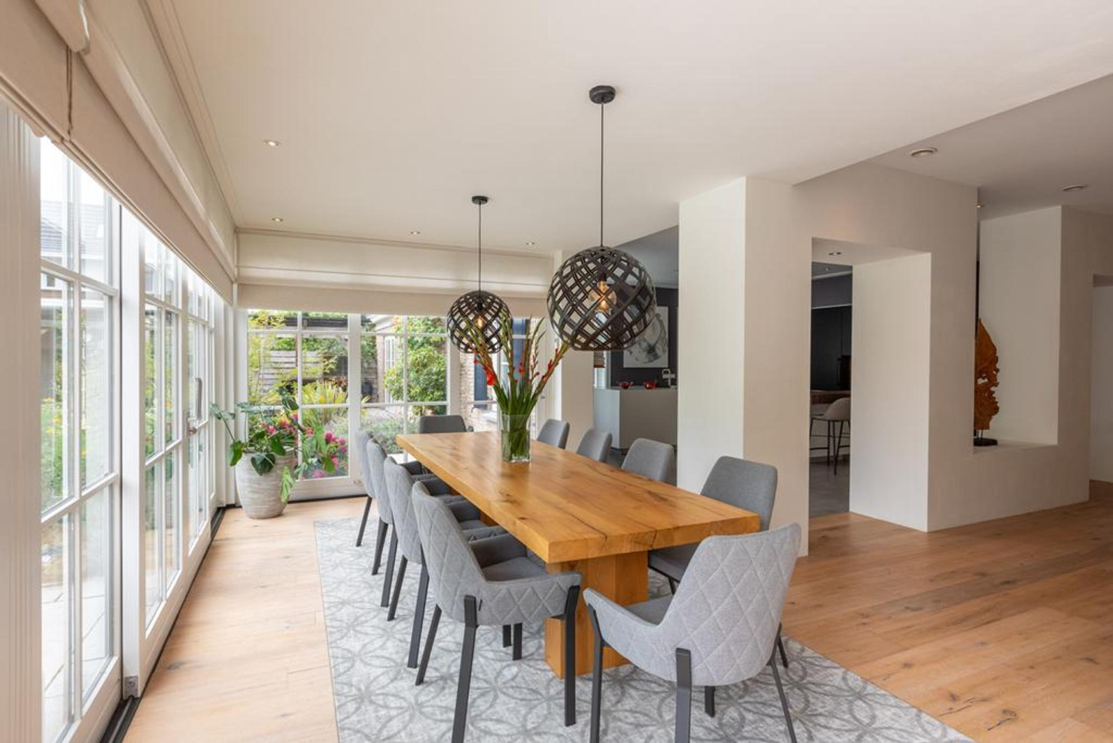 Kitchen: The custom-made kitchen is directly connected to the living room and conservatory. There are ceramic floor tiles with underfloor heating. The layout is L-shaped and practical. It is fully-equipped with luxury built-in appliances from Gaggenau. It has a cooking and rinsing island, as well as a breakfast bar. The island is equipped with a Quooker and vario Gaggenau hob with induction, teppanyaki plate, an integrated extractor system with control buttons on the vertical surface of the kitchen furniture. For practical reasons, there are two dishwashers. You will also find a spacious cupboard wall with a built-in television, wine climate refrigerator, refrigerator, steam oven, oven and warming drawer. Utility room: This is adjacent to the kitchen and ideally located. Here you will find the hybrid heat pump, WTW installation and location for both washing machine and dryer. The space offers room for extra storage/freezer etc.