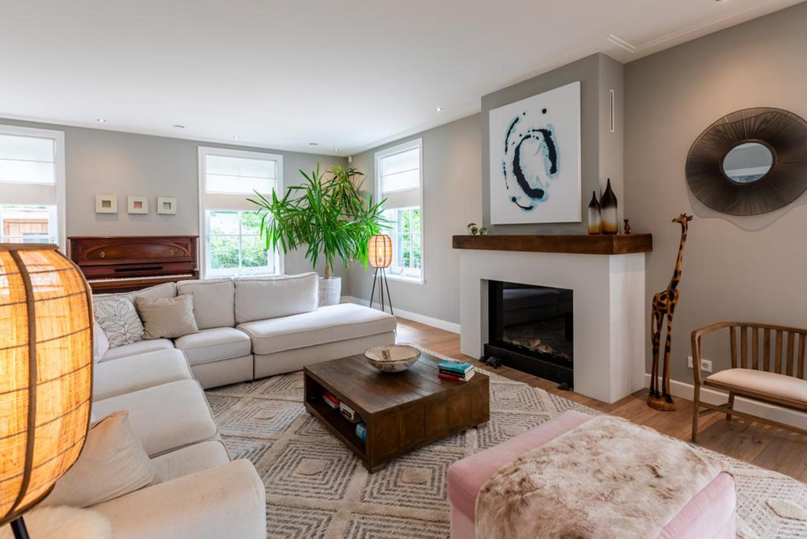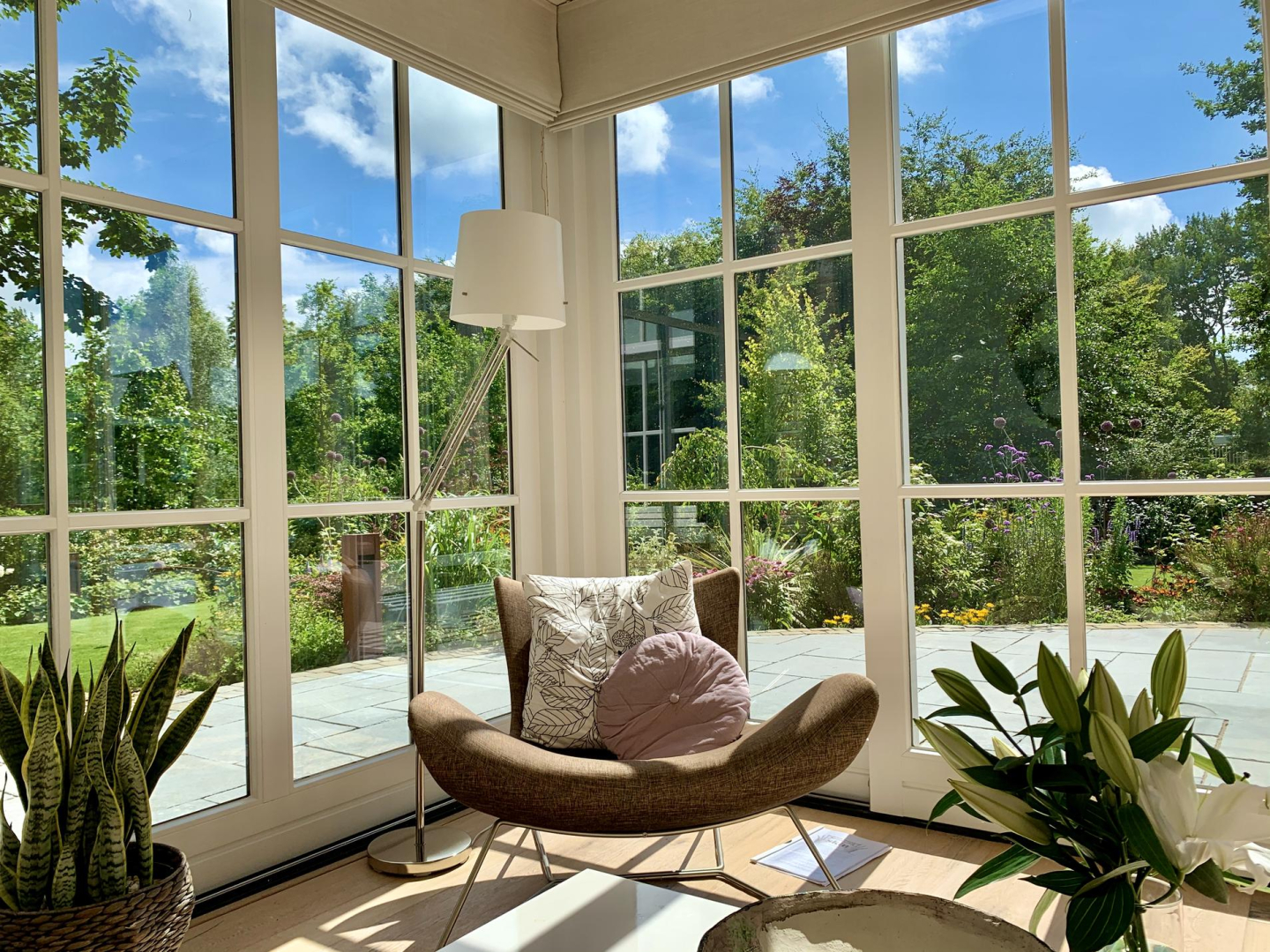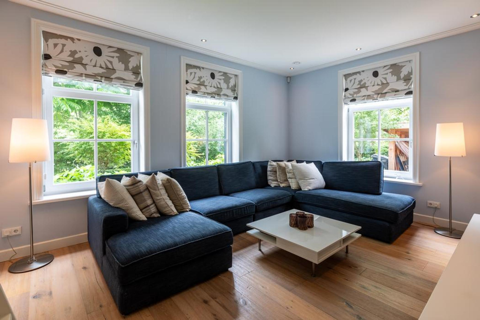 Living room: Through double patio doors, you enter the spacious and yet cosy living room. It has a gas-fired hearth. The sitting area is situated around this. A separate room off the living room allows you the option to read or watch TV in peace. There is a large light-filled conservatory also off the living room with access to the lovely garden which is well -stocked and maintained. Green and flower-filled, it’s a haven for birds. Enjoy a meal, have a drink, a barbeque outside, it’s the perfect place to relax. The conservatory seamlessly connects with the garden, the inside becomes outside and vice versa. The high ceilings (2.85 meters) are equipped with recessed spotlights and give a feeling of space while the windows ensure optimum light. The beautiful oak brushed parquet floor with underfloor heating, the high level of finishing and the open space, evokes an atmosphere of luxury and warmth.