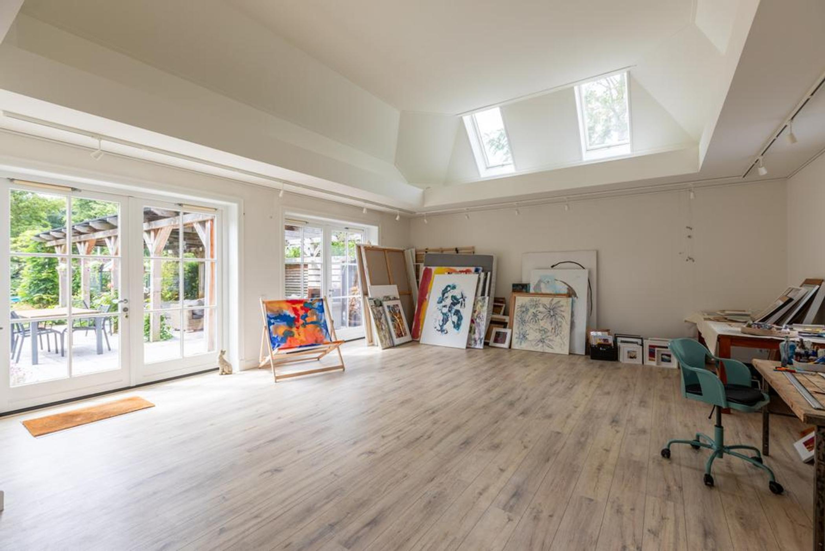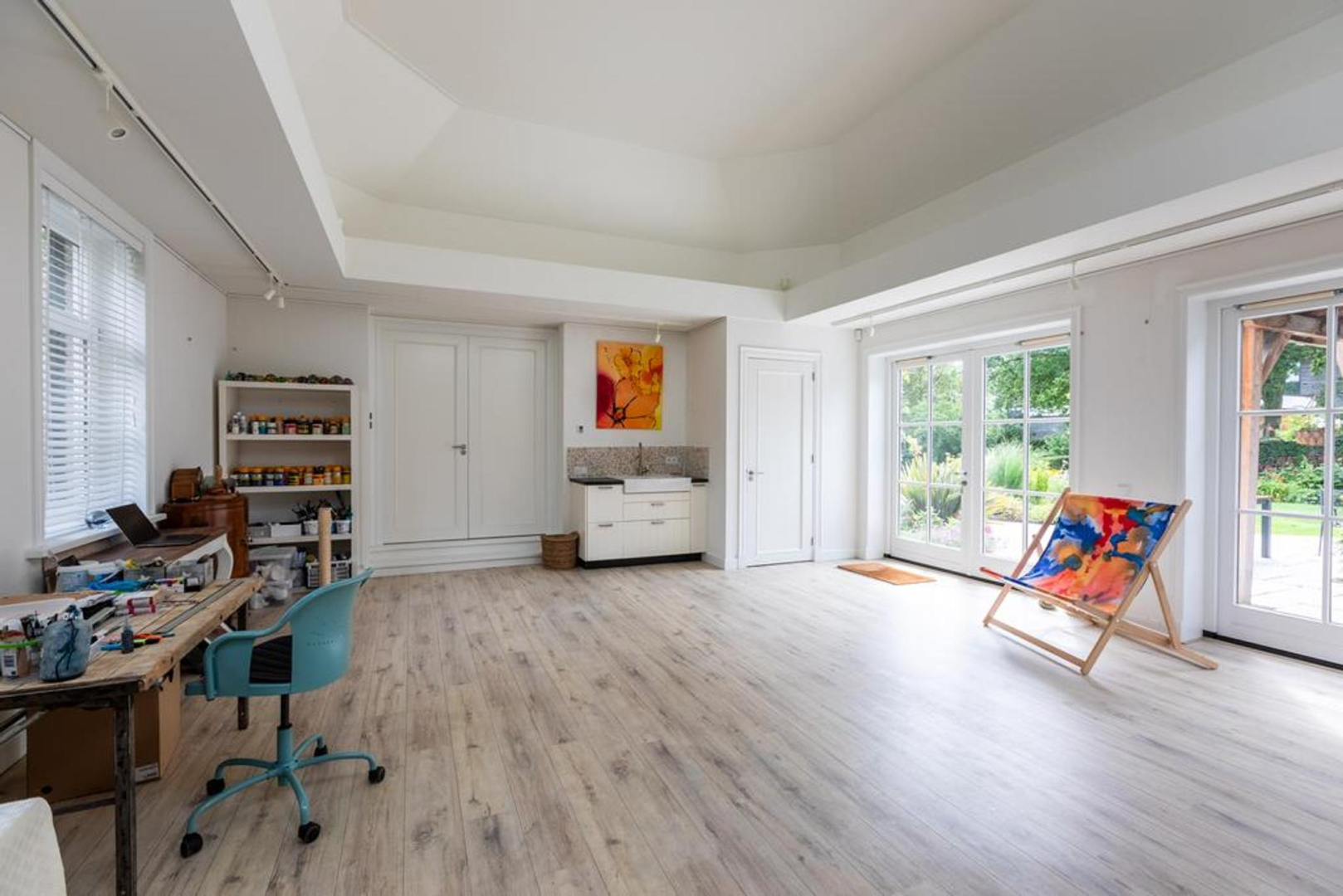 Atelier: Via een kleine hal met toegangsdeur naar zowel de voor- als achtertuin, bereikt u het atelier oftewel een prachtige multifunctionele ruimte, te gebruiken zoals het beste bij uw wensen past. Volledig geïsoleerd en v.v. laminaatvloer met vloerverwarming. Tevens is er een apart toilet met wandcloset, fontein en een wastafelmeubel. Er zijn tweemaal openslaande deuren naar de achtertuin, 2 ramen aan de voorzijde en voor nog meer lichtinval zijn er twee extra dakramen geplaatst.