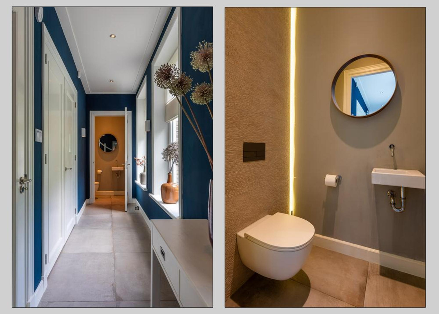 Hal: Binnenkomend, staat u in de imposante hal met prachtig trappenhuis. Hier vindt u ook een garderobe met dubbele deuren en een grote praktische trapkast. Tevens bevindt zich hier de meterkast en het toilet met wandcloset en fontein. De hal heeft grote keramische vloertegels met vloerverwarming.