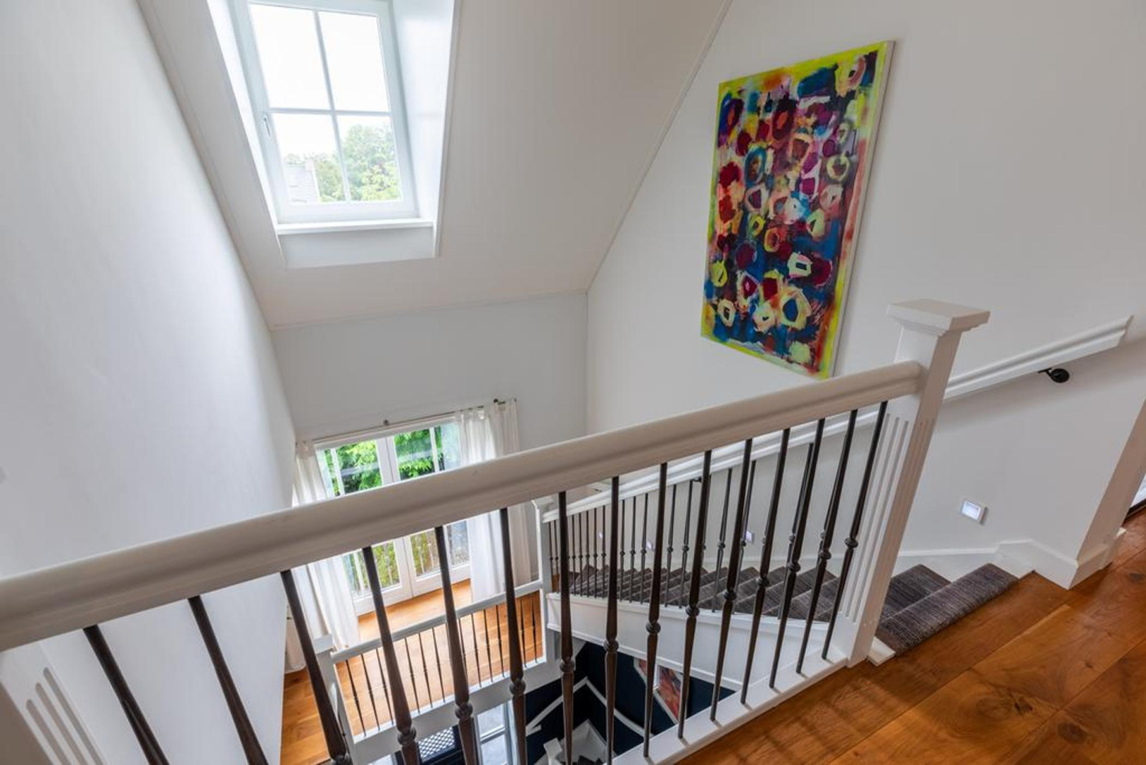 1e verdieping: Het prachtige trappenhuis met bordestrap, Franse balkon en mooie traplopers, zijn geheel in de stijl van dit schitterende herenhuis. Gecombineerd met de brick in wall verlichting heeft het geheel een luxe uitstraling. Op de 1e verdieping vindt u de ruim bemeten master bedroom met aansluitend het balkon van ca. 28 m² en met uitzicht over de zonnige tuin. De open badkamer voorziet in een dubbele regendouche en zij-douches, afgesloten middels glazen deuren, een prachtig wastafelmeubel met waskommen en een wandcloset. De kranen zijn luxueus ingebouwd. Ook is er een grote inloopkast met verlichting en lades. Daarnaast heeft deze master bedroom een eigen fitness-/ yogaruimte, die ook heel goed als kantoor te gebruiken is. Op deze verdieping zijn er nog twee grote en lichte slaapkamers en een 2e badkamer met inloopdouche, wastafelmeubel met twee waskommen en een wandcloset. Ook hier is het afwerkingsniveau hoog met ingebouwde kranen. De verdieping is voorzien van een warme eikenhouten parketvloer met vloerverwarming.