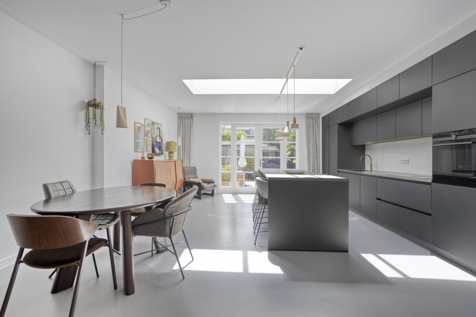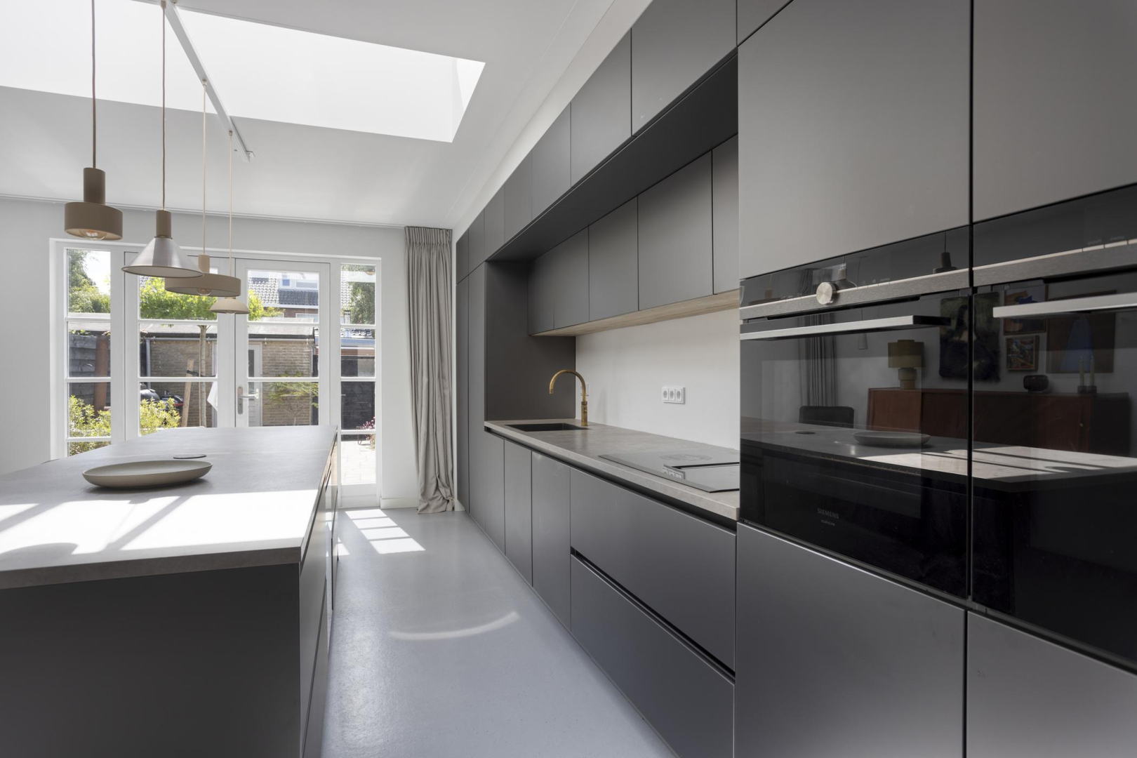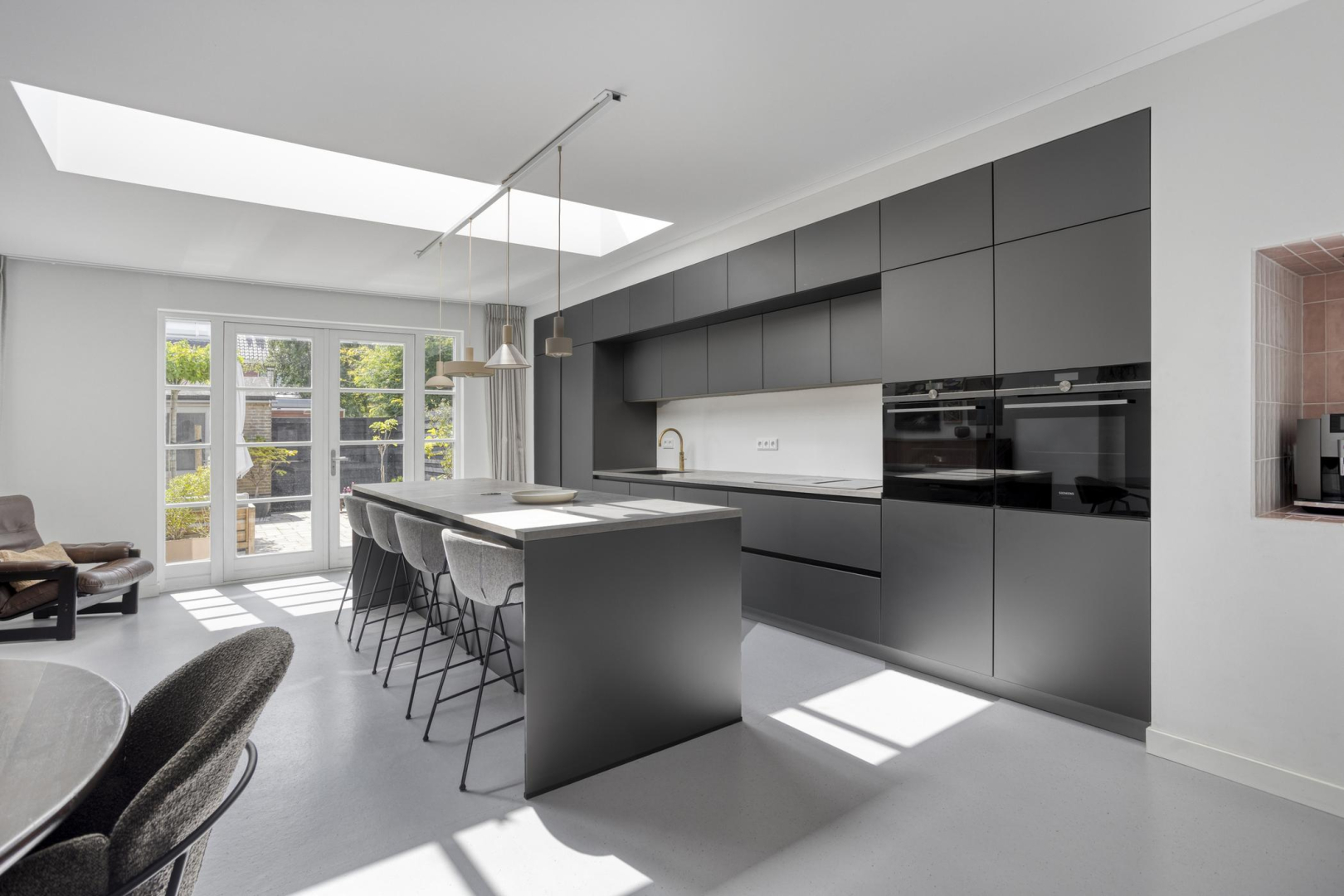 Via de nette hal met toilet met wandcloset en een praktische bergkast onder de trap, komt u de woning binnen. Een schuifdeur geeft toegang tot de ruime, uitgebouwde woonkamer met betonnen vloer en glad gestucte wanden waar direct de lichte en open sfeer opvalt. De gehele begane grond is afgewerkt met een mooie, onderhoudsarme marmoleum vloer en voorzien van comfortabele vloerverwarming. De moderne open keuken is een echte eyecatcher en van alle gemakken voorzien. Zo beschikt de keuken over een luxe eetbar met wijnklimaatkast, veel bergruimte, een inductiekookplaat met geïntegreerde afzuiging, een oven en stoomoven, een vaatwasser, een Quooker en een grote koelkast en een grote vriezer. Alle keukenapparatuur is van het merk Siemens. De prachtige lichtkoepel en de dubbele openslaande deuren naar de tuin zorgen voor extra daglicht in de keuken.