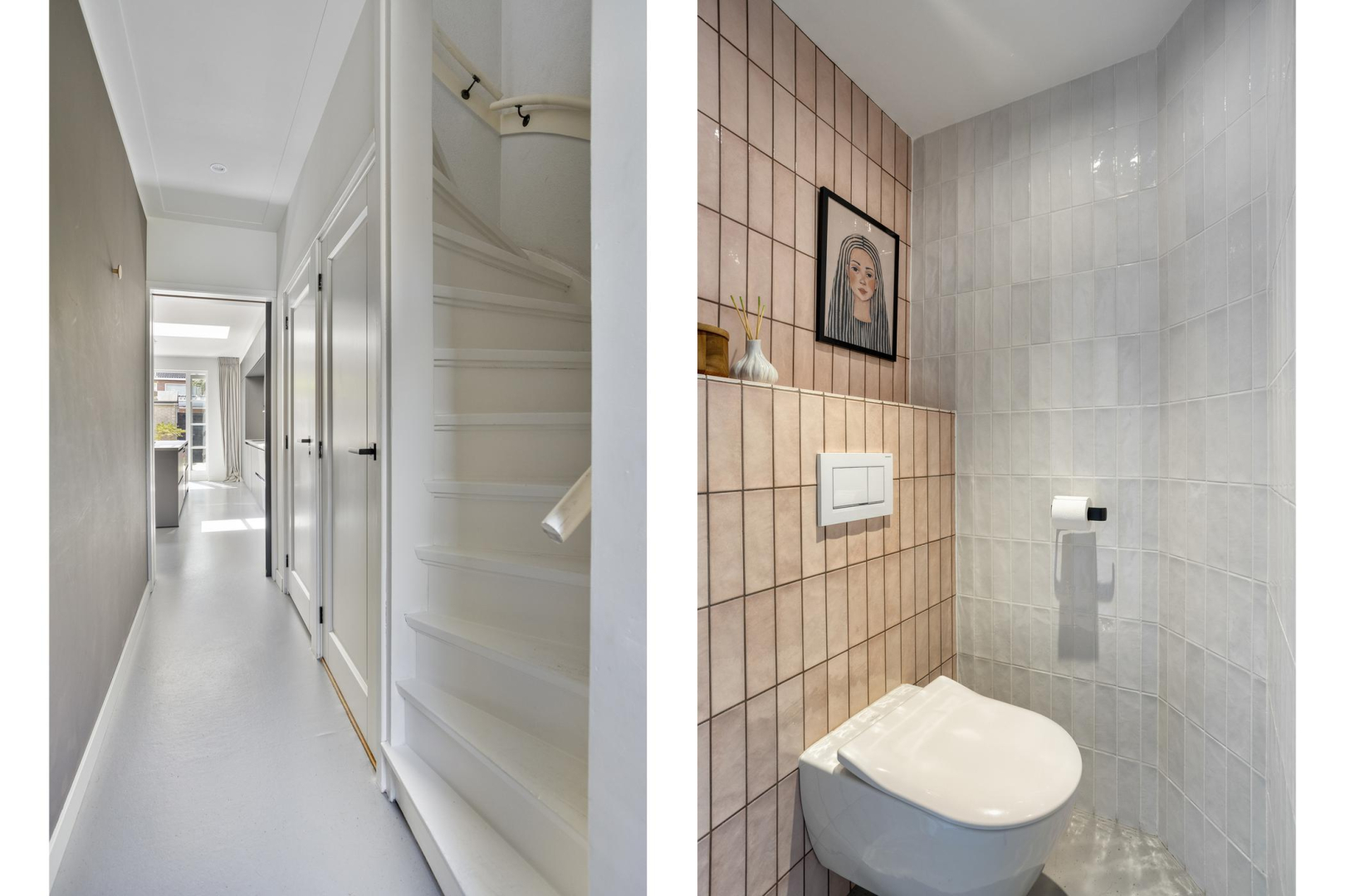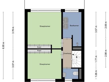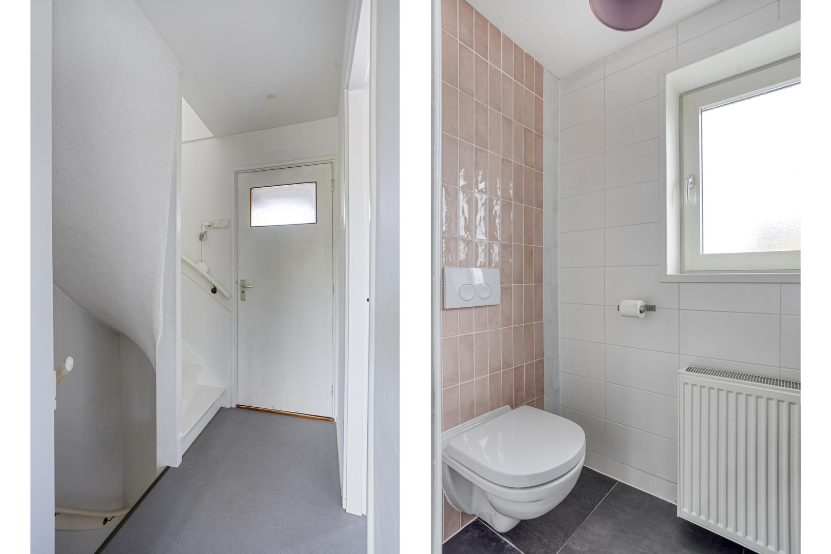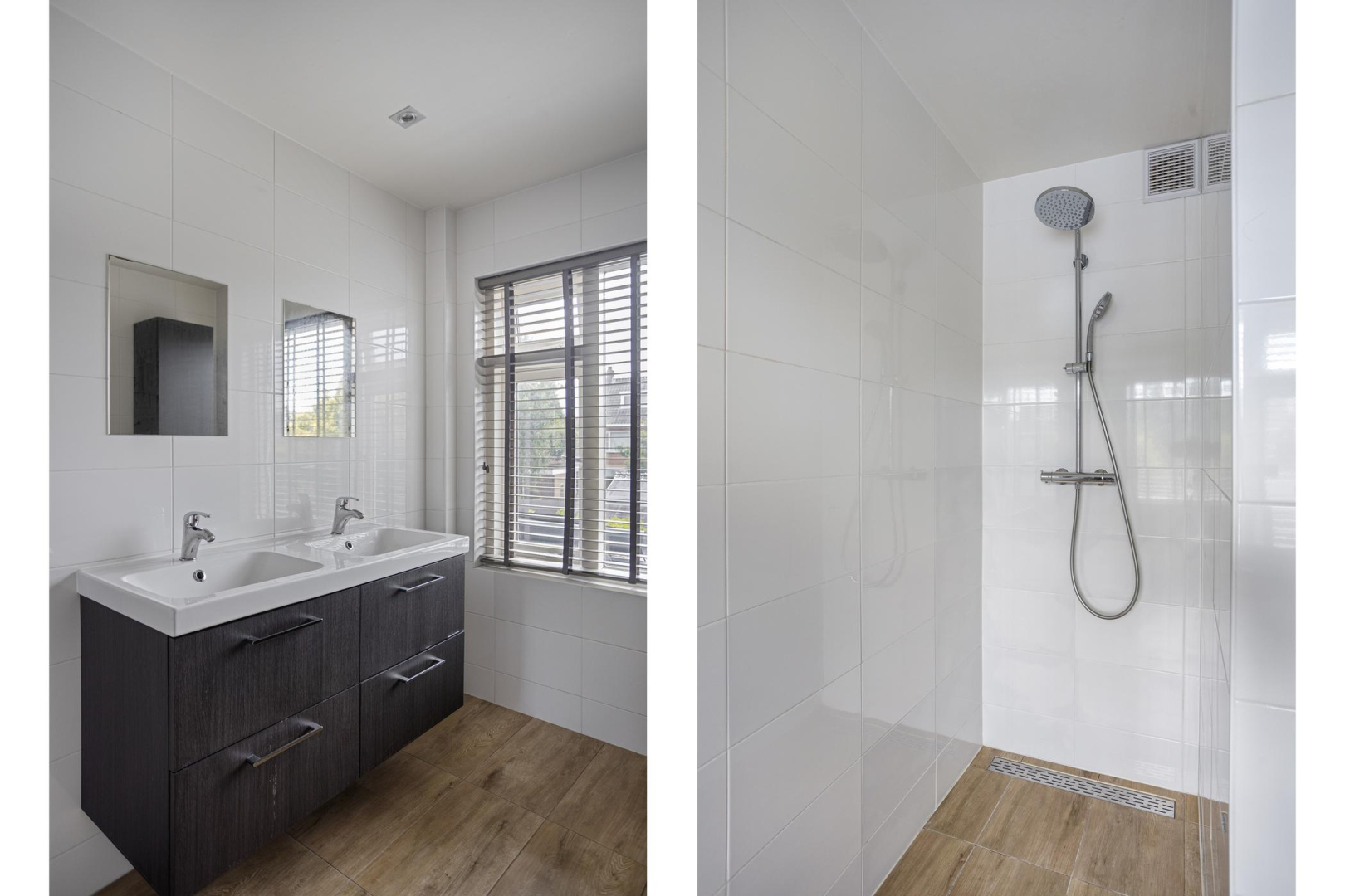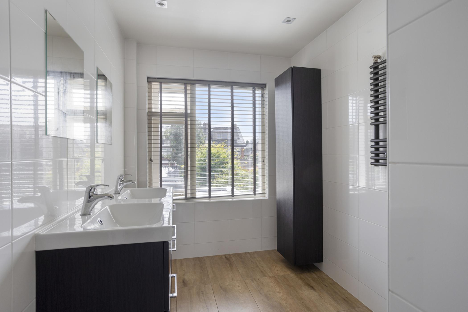 Overloop met toegang tot twee ruime slaapkamers, beide met vaste kastenwand, een moderne en volledig betegelde badkamer voorzien van inloopdouche (hand- en stortdouche), dubbele wastafel, vaste kast en een handdoekradiator. Ook de eerste verdieping heeft een marmoleum vloer en er is een apart toilet aanwezig.