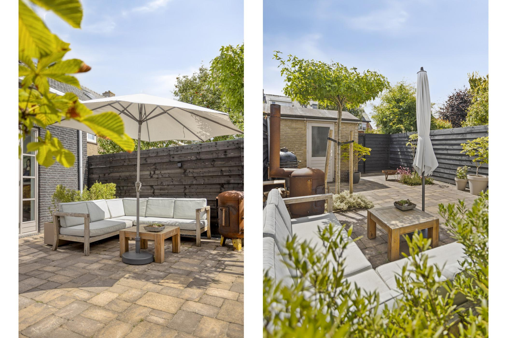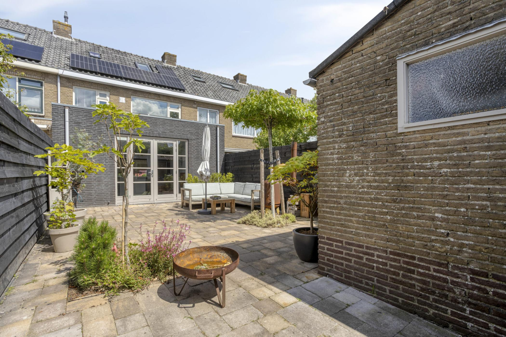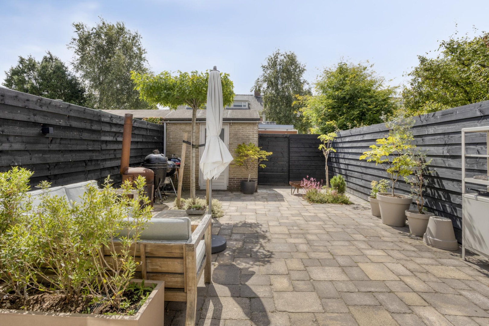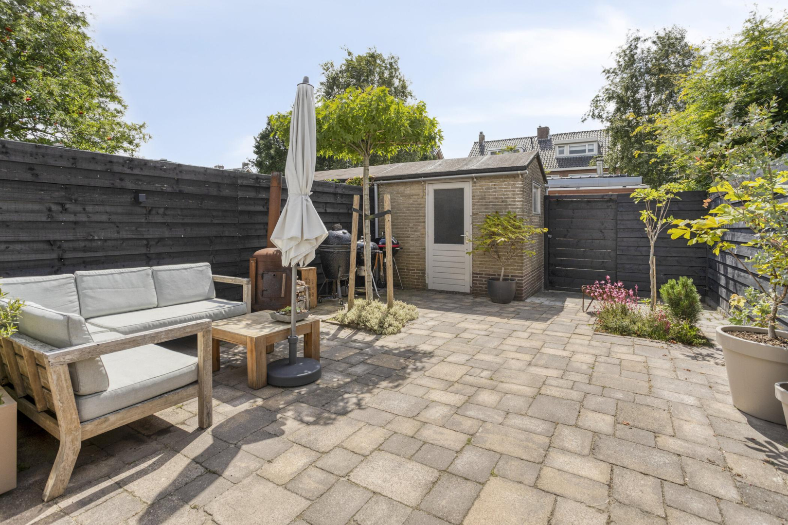 De heerlijke op het zuidwesten gelegen achtertuin is volledig betegeld, heeft een achterom met schuifdeur, een buitenkraantje en een vrijstaande stenen berging.