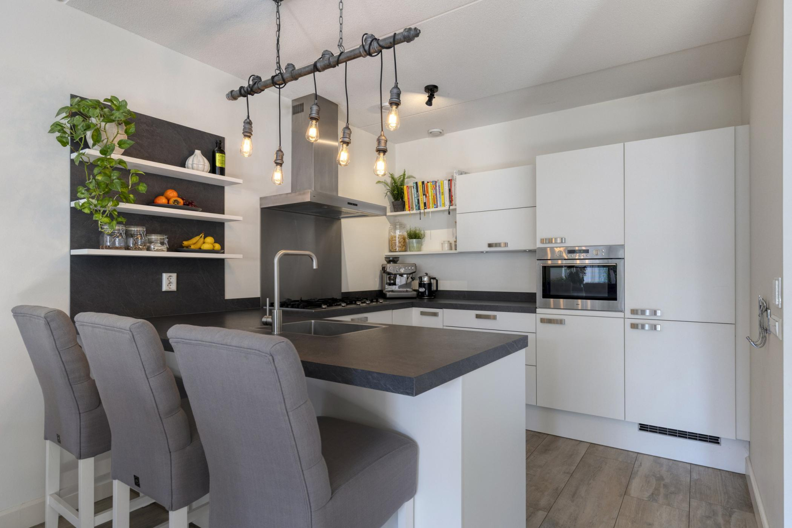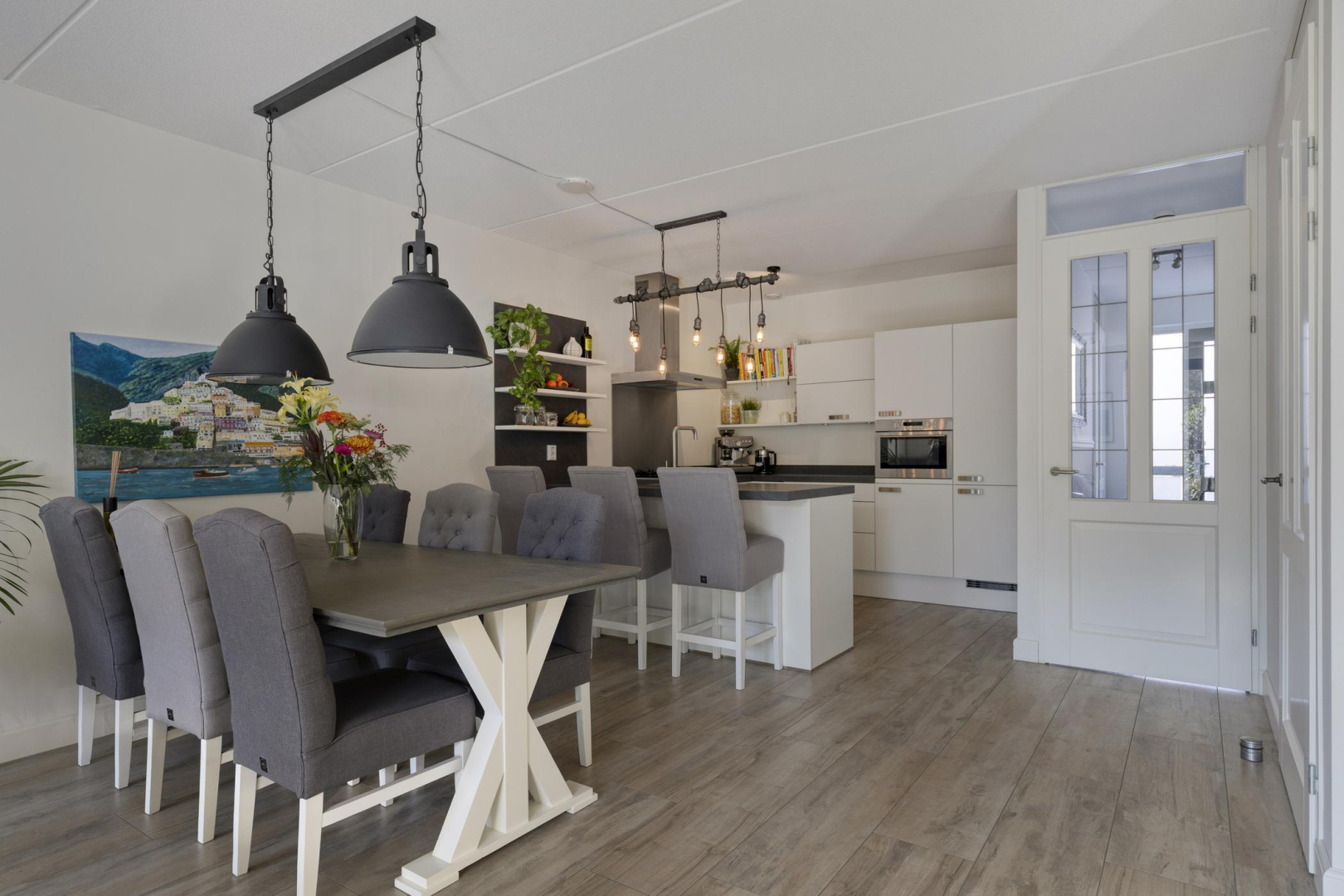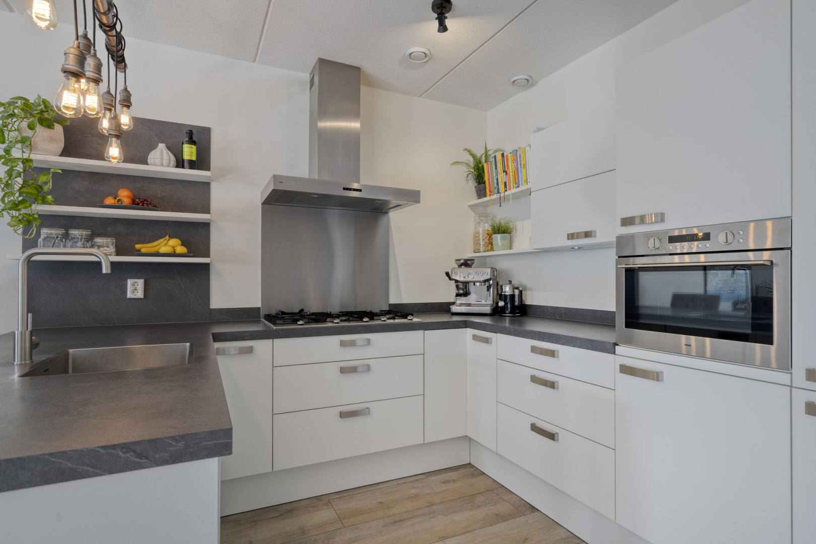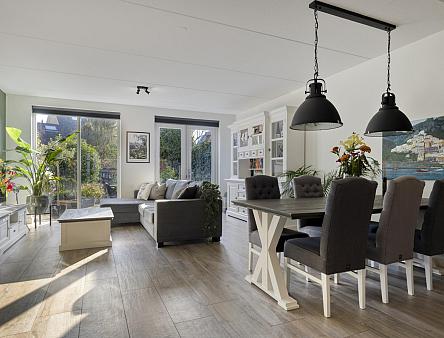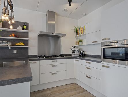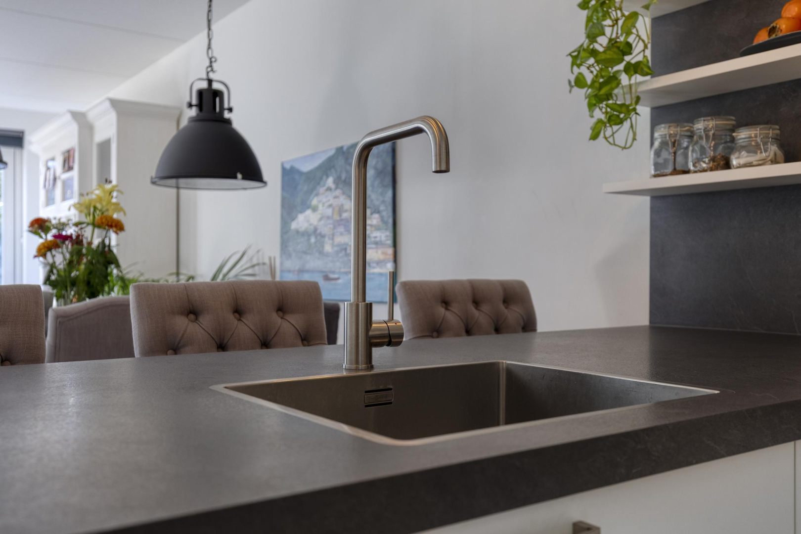 Entree, hal met meterkast, toiletruimte met wandcloset en fontein. Vanuit de hal is er toegang tot de praktische berging. Deze berging beschikt over voldoende bergruimte en heeft een directe deur naar de straat, ideaal voor bijvoorbeeld het stallen van fietsen, kinderwagens of hobbyspullen. De hal loopt naadloos over in de sfeervolle en lichte woonkamer, waarbij de keramische tegelvloer in houtlook zorgt voor een warme en eigentijdse uitstraling. Dankzij de grote raampartijen en de openslaande deuren naar de achtertuin is de woonkamer aangenaam licht en uitnodigend. De trapkast biedt extra opbergruimte. De open keuken met een gezellige eetbar is uitgevoerd in een moderne, neutrale kleurstelling en is voorzien van een donker werkblad. Uiteraard is er aan comfort gedacht, de keuken beschikt over diverse inbouwapparatuur, waaronder een vaatwasser, een kokend waterkraan met plintboiler, 5-pits gaskookplaat, oven en koel-/vriescombinatie. Een fijne plek om te koken én samen te komen. De begane grondvloer is voorzien van vloerverwarming met uitzondering van de berging.