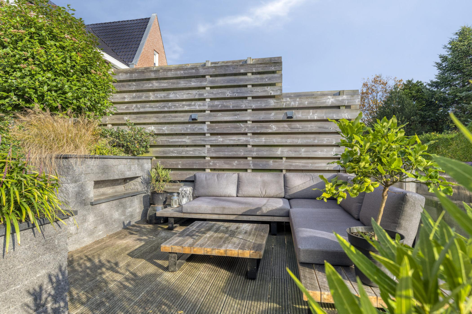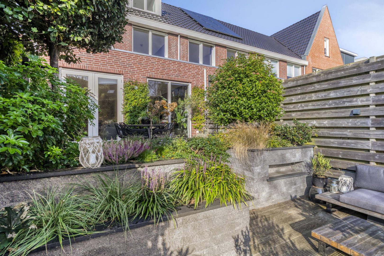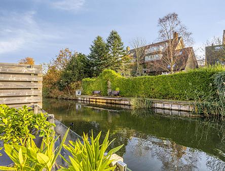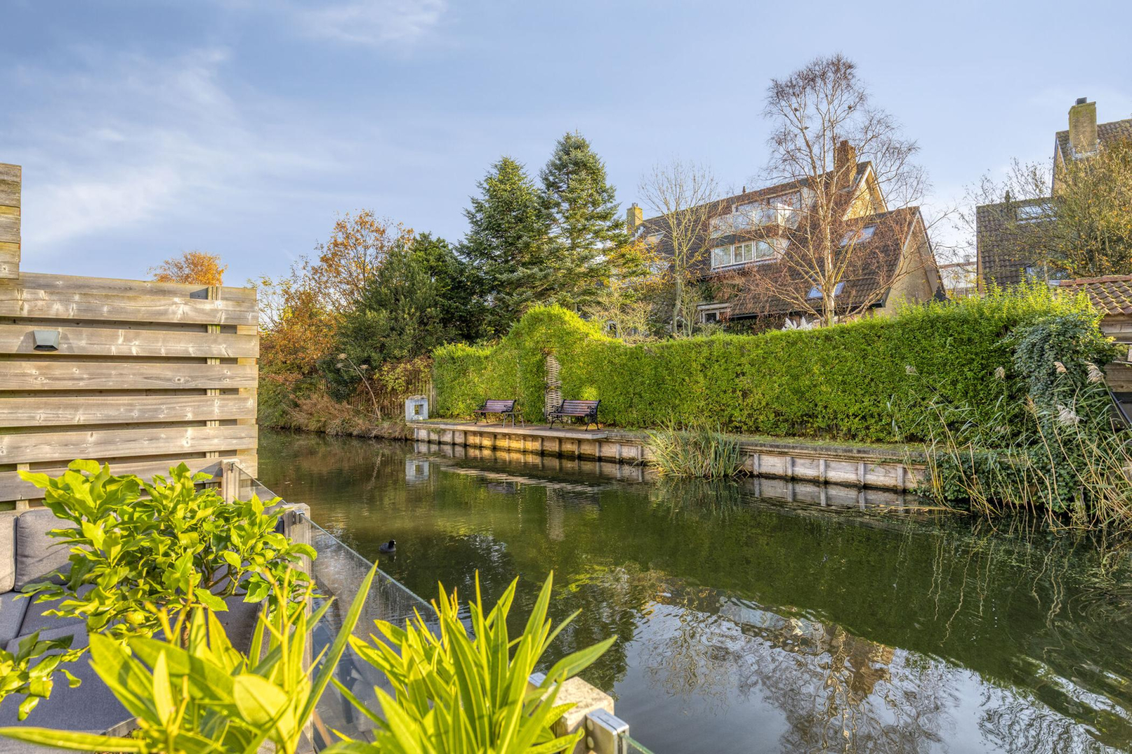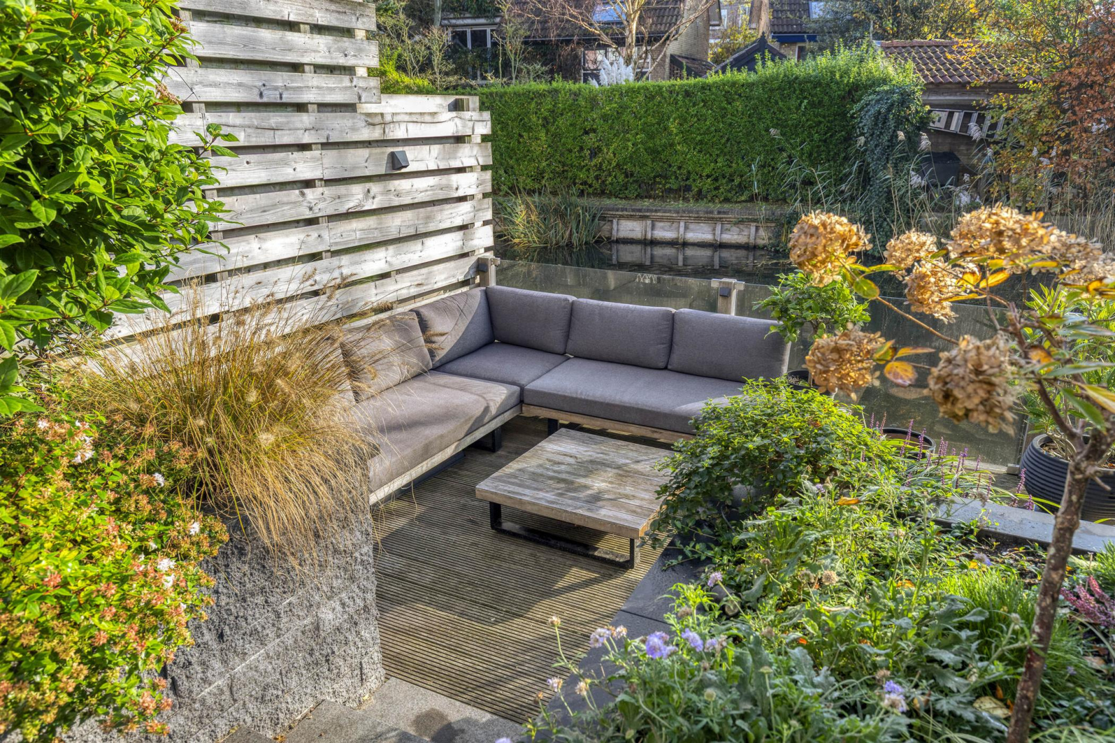 De heerlijk zonnige achtertuin is toegankelijk via de openslaande deuren vanuit de woonkamer. De tuin is fraai aangelegd met een ruim terras waardoor binnen met buiten wordt verbonden, groene borders en een groot, lager gelegen vlonderterras aan het water. Op het vlonderterras is een gashaard mooi verwerkt in de stenen border waardoor de loungehoek een heerlijke plek is om te ontspannen, te borrelen of te genieten van het uitzicht over het water. Een unieke tuin waar zon, rust en uitzicht samenkomen.