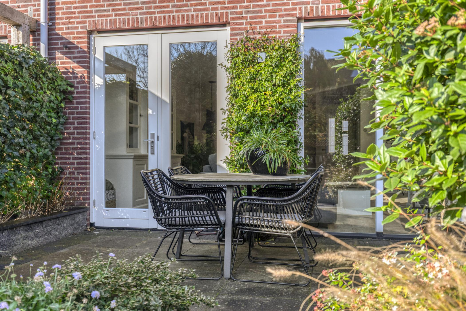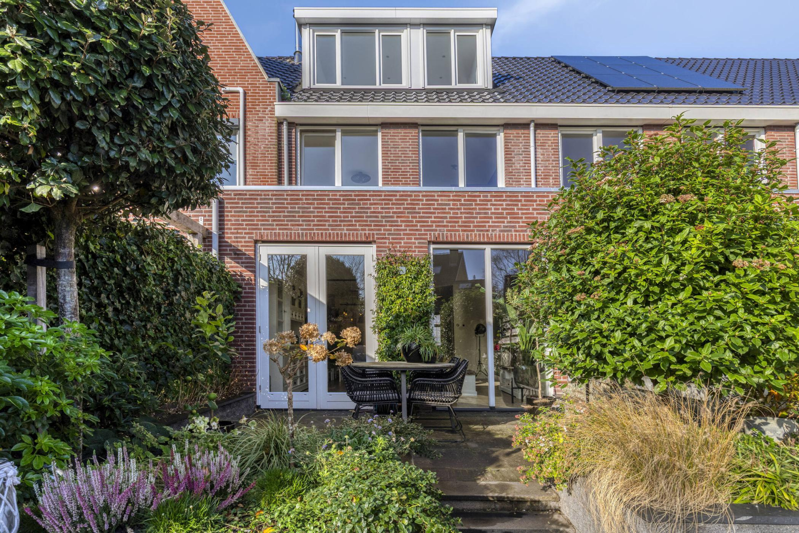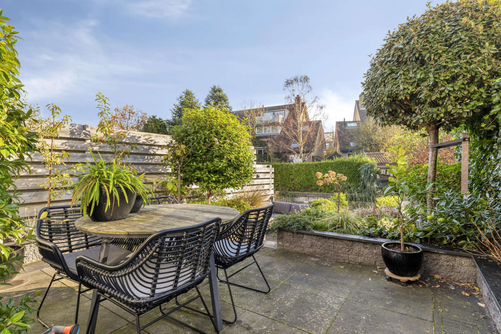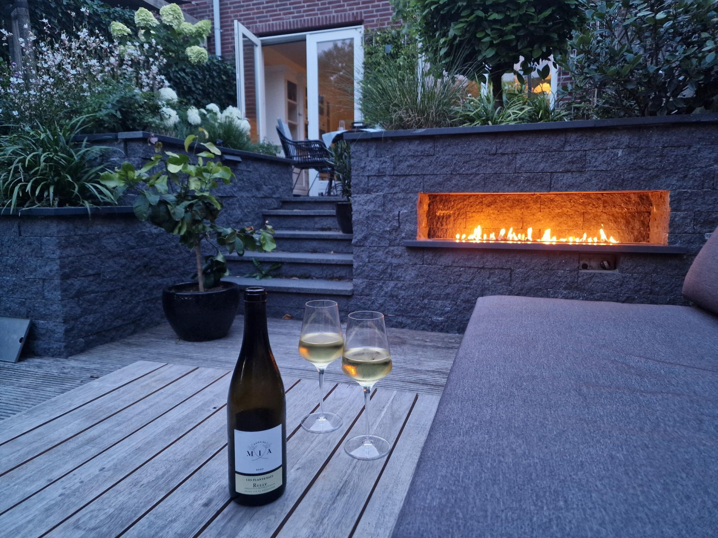 De heerlijk zonnige achtertuin is toegankelijk via de openslaande deuren vanuit de woonkamer. De tuin is fraai aangelegd met een ruim terras waardoor binnen met buiten wordt verbonden, groene borders en een groot, lager gelegen vlonderterras aan het water. Op het vlonderterras is een gashaard mooi verwerkt in de stenen border waardoor de loungehoek een heerlijke plek is om te ontspannen, te borrelen of te genieten van het uitzicht over het water. Een unieke tuin waar zon, rust en uitzicht samenkomen.