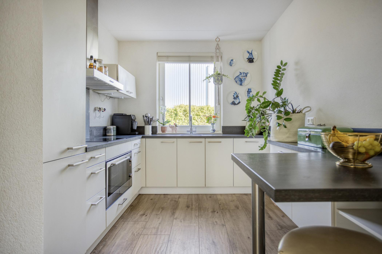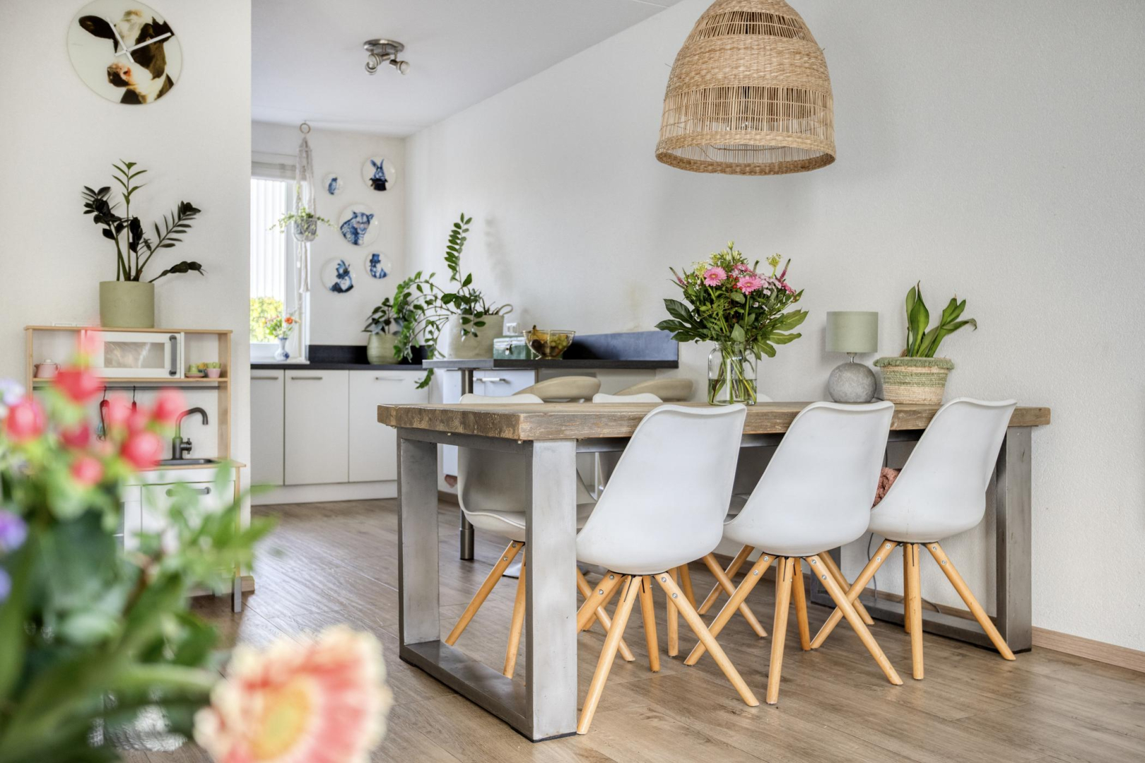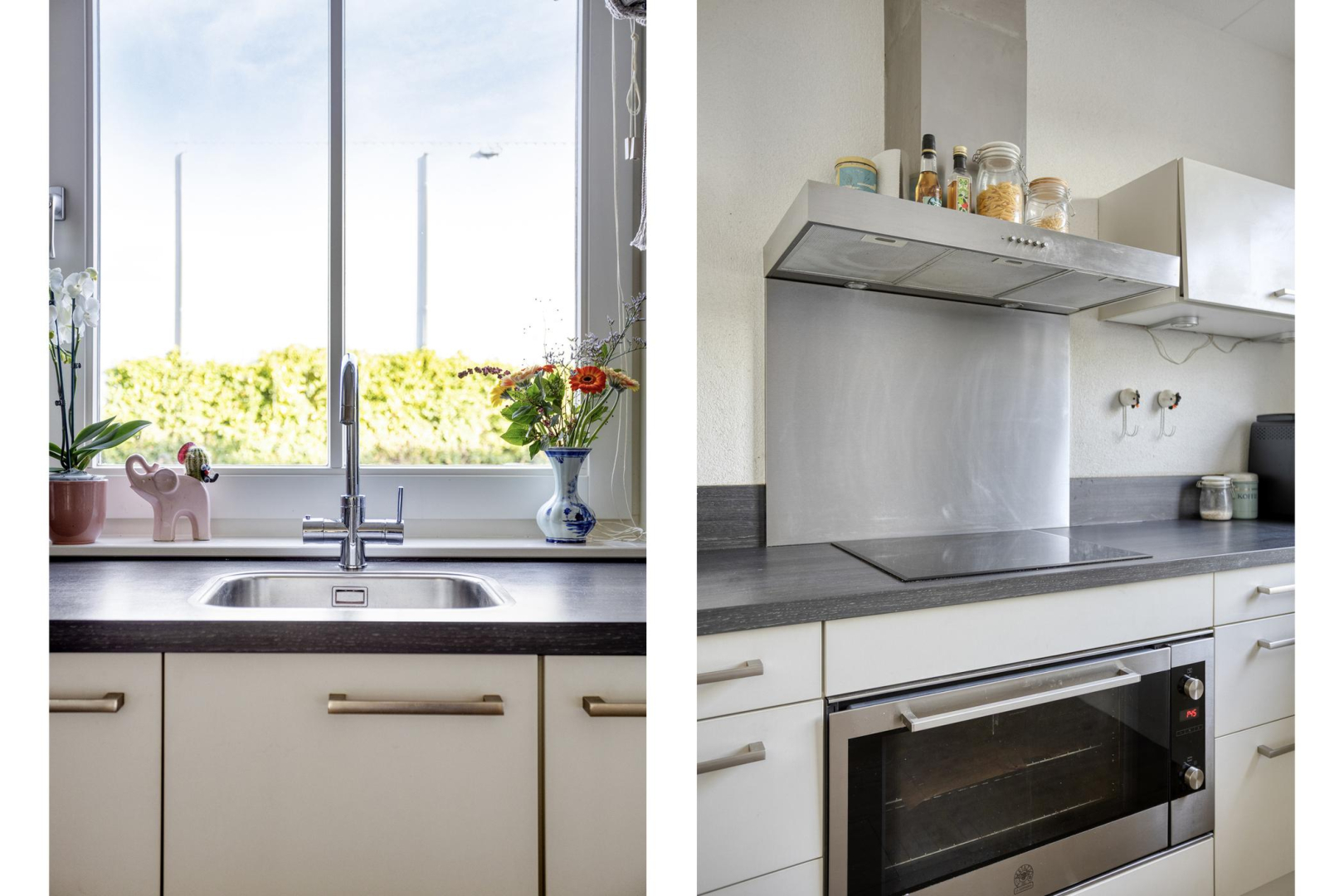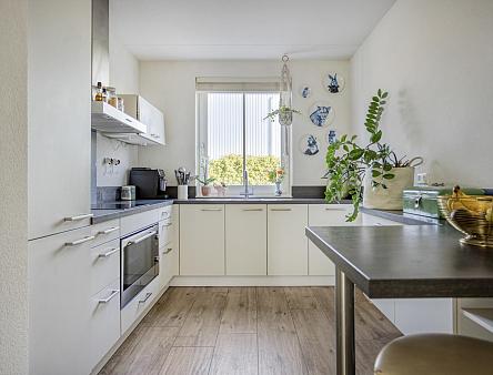 Entree, hal met meterkast, toiletruimte met wandcloset en fontein. Vanuit de hal loop je direct door naar de aangenaam lichte woonkamer. De keramische Marazzi-tegelvloer geven de ruimte een warme, moderne sfeer, terwijl de vloerverwarming op de gehele begane grond zorgt voor extra comfort. De woonkamer is dankzij de grote ramen en de openslaande deuren naar de achtertuin heerlijk licht. In de praktische trapkast is extra bergruimte aanwezig. Aan de voorzijde van de woning ligt de open keuken, uitgevoerd in een moderne, rustige kleurstelling met een donker werkblad. Tegenover het werkgedeelte is een extra blad geplaatst dat tevens dient als gezellige bar voor twee personen. De keuken is van alle gemakken voorzien, zoals een inductiekookplaat, vaatwasser, grote oven en koel-/vriescombinatie. Een fijne, functionele plek waar koken en samenzijn centraal staan.
