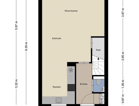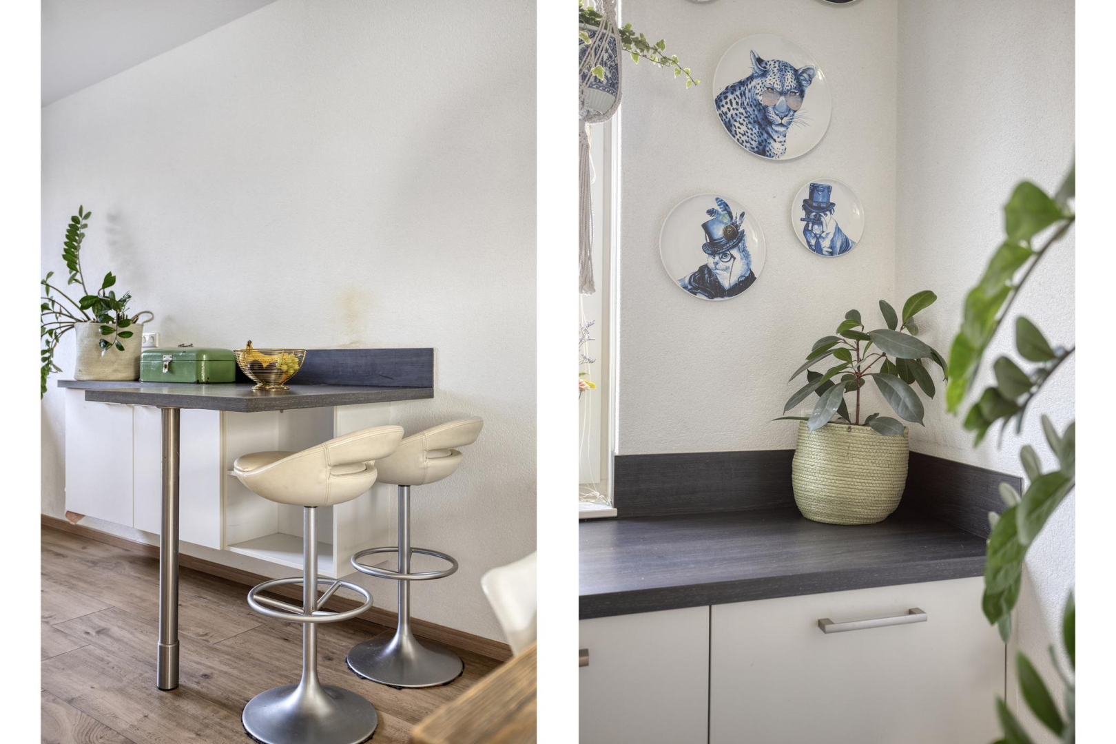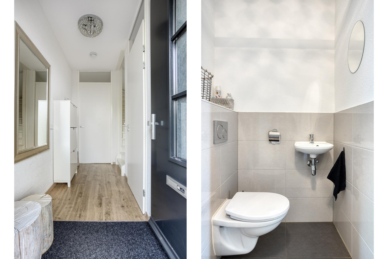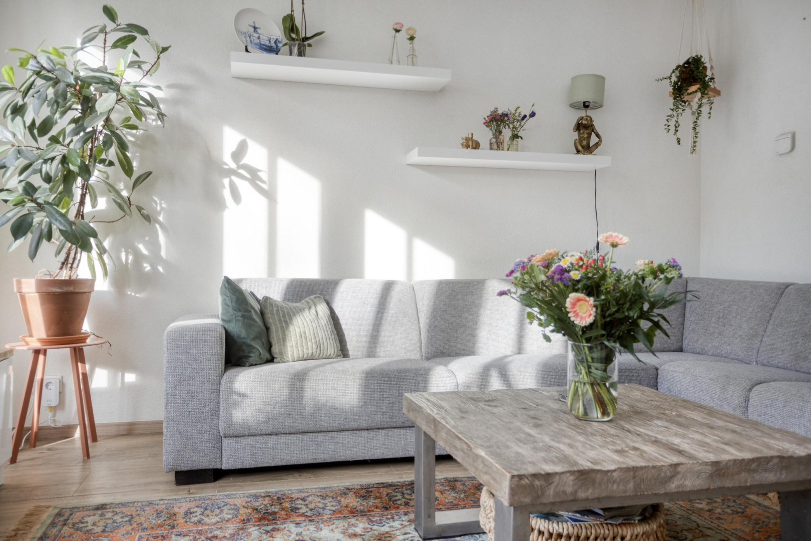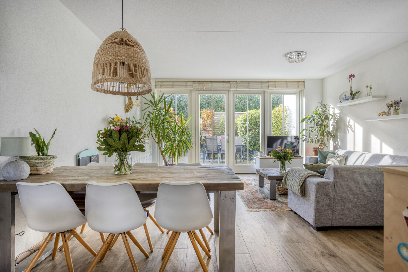 Entree, hal met meterkast, toiletruimte met wandcloset en fontein. Vanuit de hal loop je direct door naar de aangenaam lichte woonkamer. De keramische Marazzi-tegelvloer geven de ruimte een warme, moderne sfeer, terwijl de vloerverwarming op de gehele begane grond zorgt voor extra comfort. De woonkamer is dankzij de grote ramen en de openslaande deuren naar de achtertuin heerlijk licht. In de praktische trapkast is extra bergruimte aanwezig. Aan de voorzijde van de woning ligt de open keuken, uitgevoerd in een moderne, rustige kleurstelling met een donker werkblad. Tegenover het werkgedeelte is een extra blad geplaatst dat tevens dient als gezellige bar voor twee personen. De keuken is van alle gemakken voorzien, zoals een inductiekookplaat, vaatwasser, grote oven en koel-/vriescombinatie. Een fijne, functionele plek waar koken en samenzijn centraal staan.