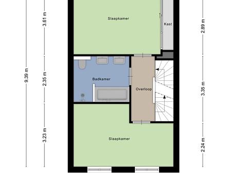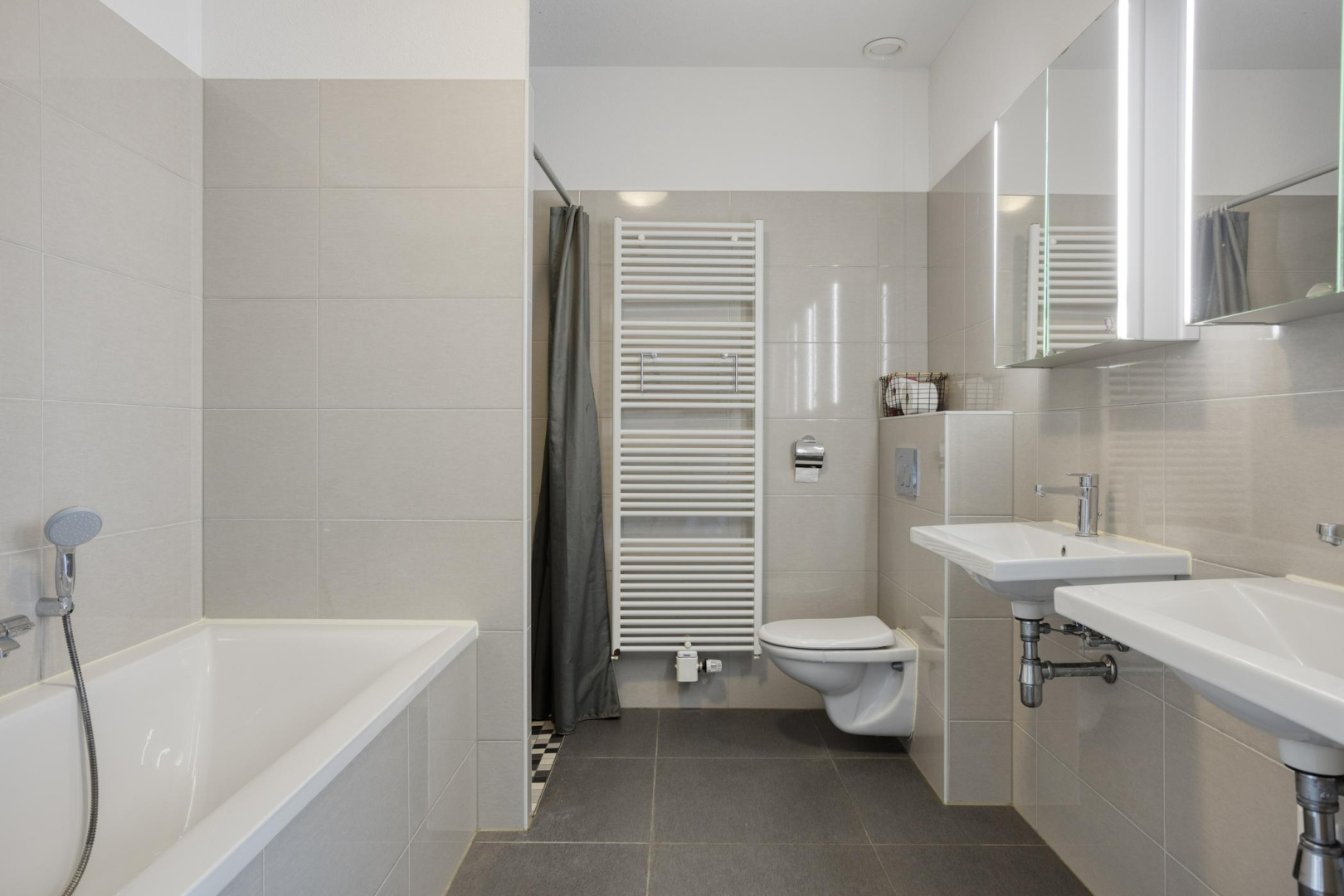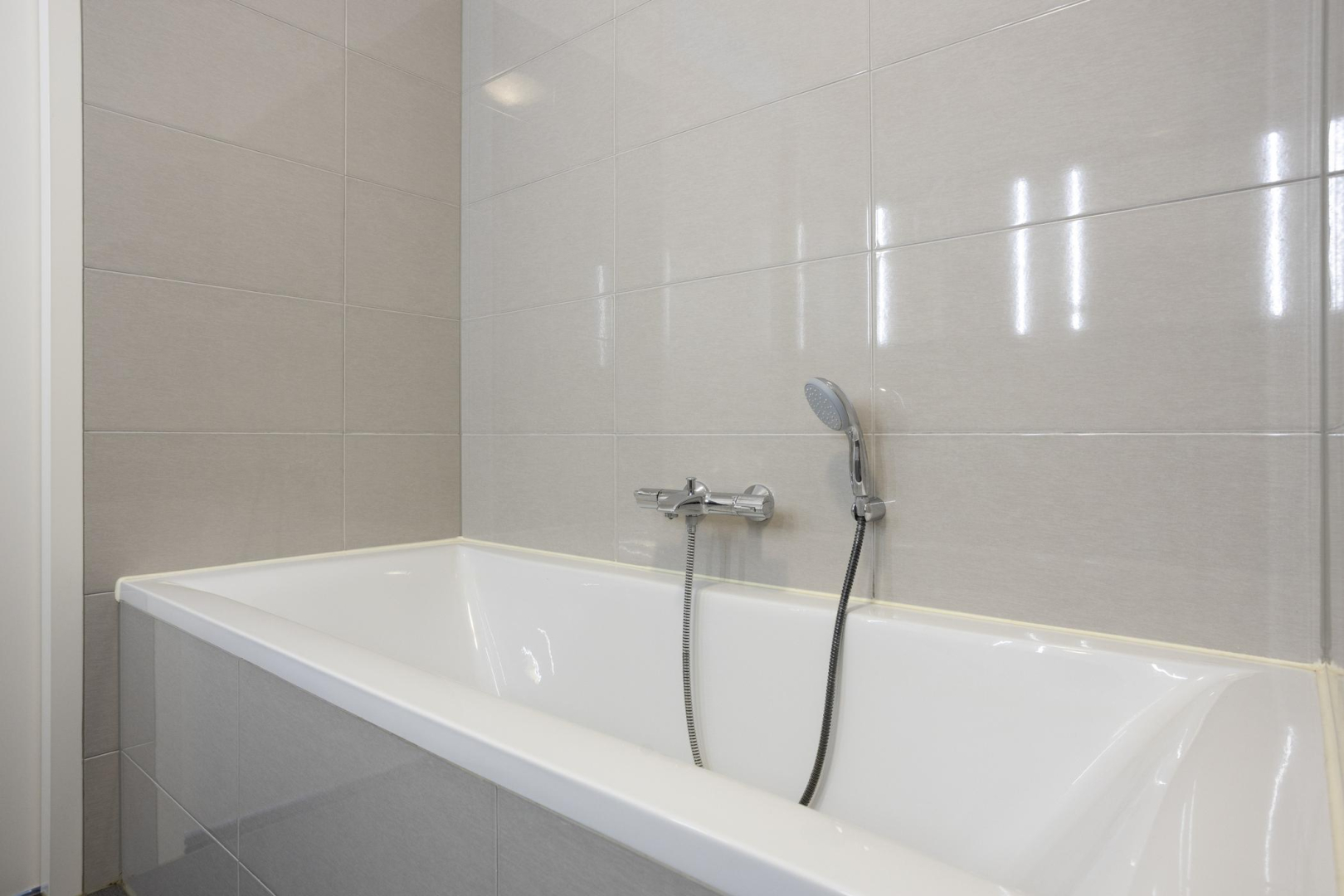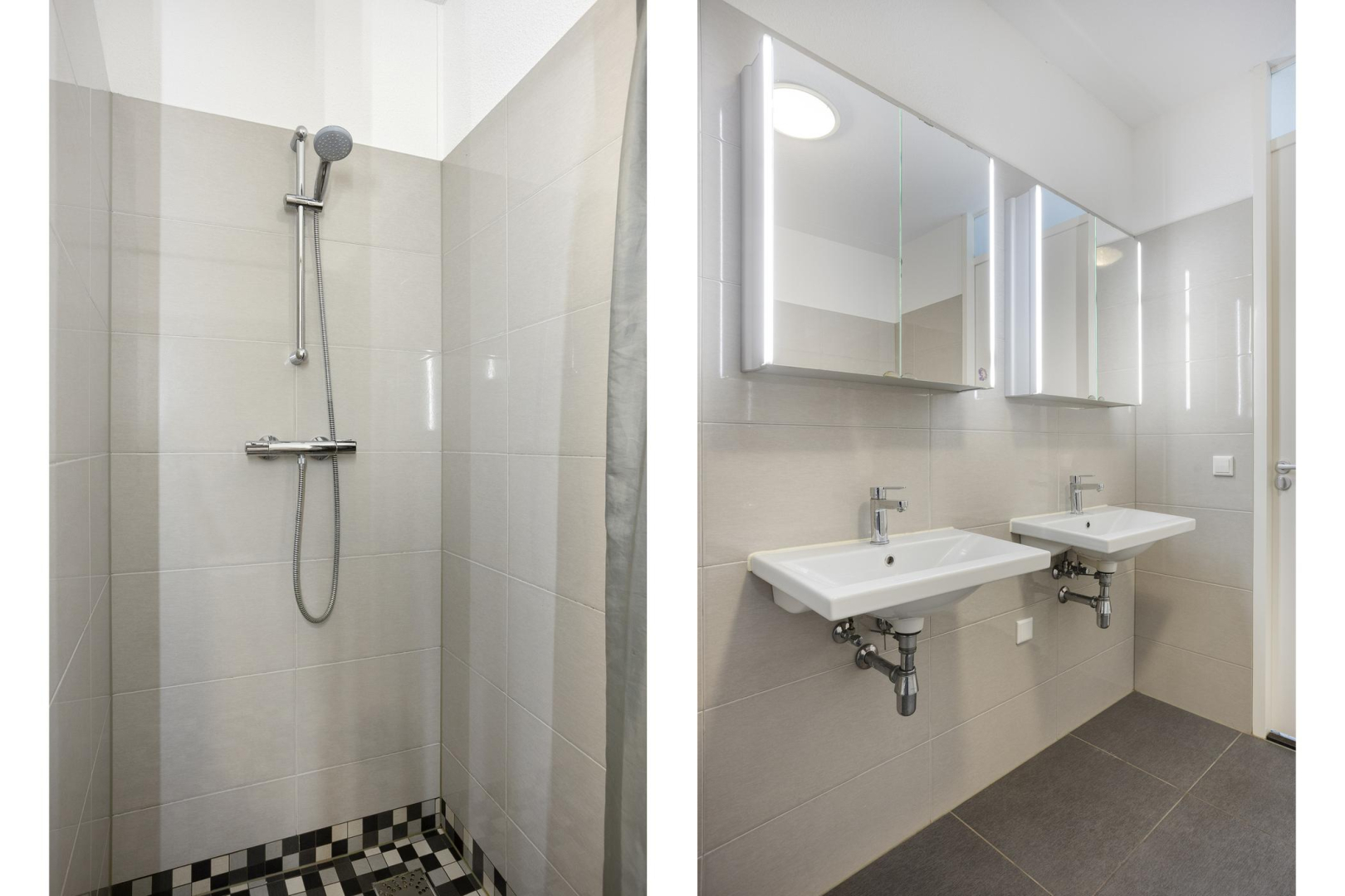 Via de overloop bereikt u de moderne badkamer en twee ruime slaapkamers. De badkamer is stijlvol ingericht en voorzien van een ligbad, inloopdouche, twee wastafels, elk met eigen spiegelkast, een handdoekradiator en een wandcloset. Aan de voorzijde van de woning bevindt zich een ruime slaapkamer die zich uitstrekt over de volledige breedte van de woning. Ook aan de achterzijde ligt een royale slaapkamer over de gehele breedte, voorzien van een vaste kast. De gehele verdieping is voorzien van een laminaatvloer met uitzondering van de badkamer.