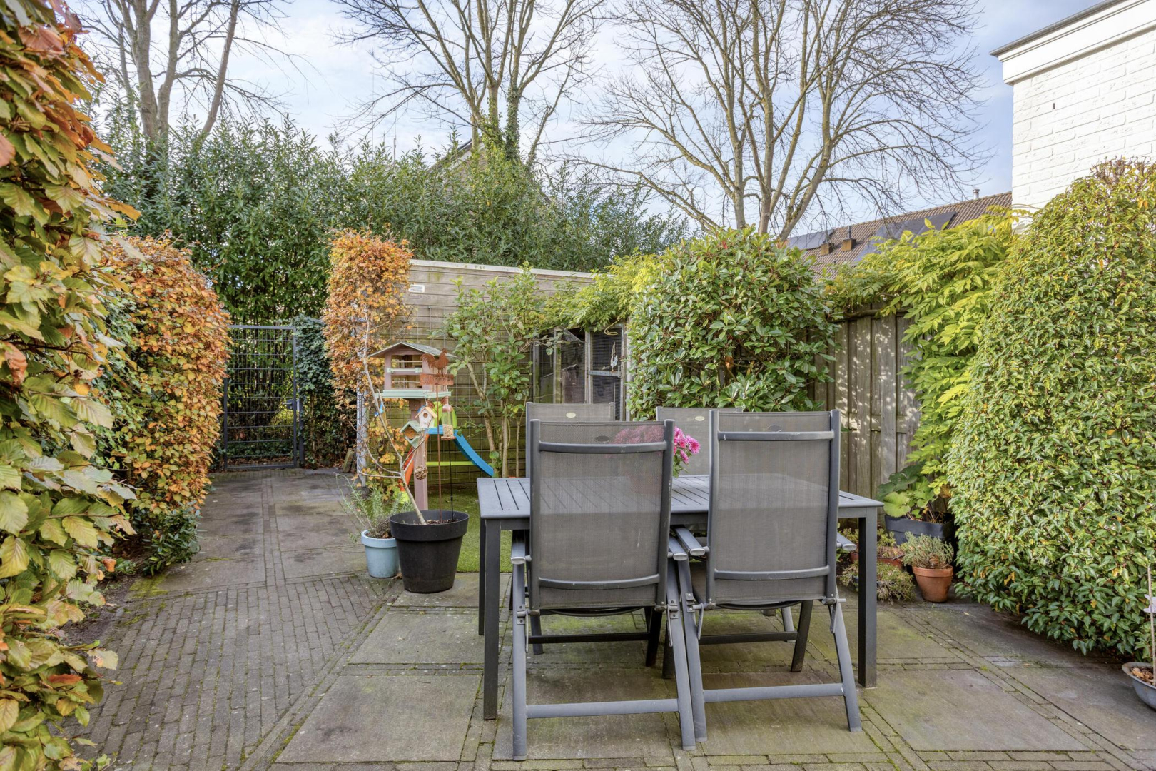Tuin: De onderhoudsvriendelijke achtertuin is een heerlijke plek om te ontspannen en bevindt zich op het zonnige zuidwesten, waardoor je volop kunt genieten van de zon. De tuin is aangelegd met groene borders, het ruime terras grenst direct aan de woning en vormt een ideale plek voor een lounge- of eethoek. Op warme dagen biedt het elektrisch bedienbare zonnescherm comfortabele schaduw, zodat je ook tijdens de heetste uren fijn buiten kunt zitten. Verder is er een vrijstaande houten berging aanwezig, perfect voor het opbergen van fietsen, tuingereedschap en overige spullen. Via de achterom is de tuin eenvoudig bereikbaar.