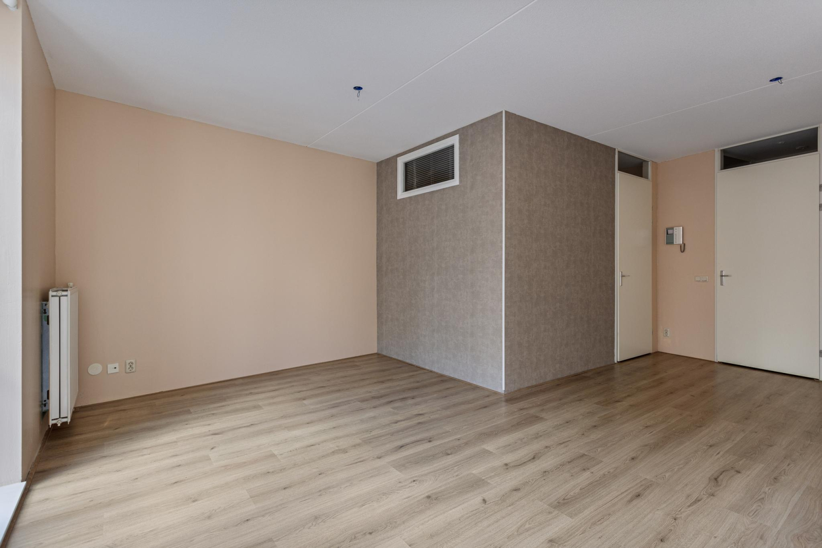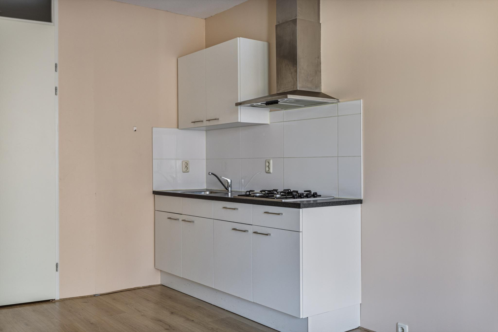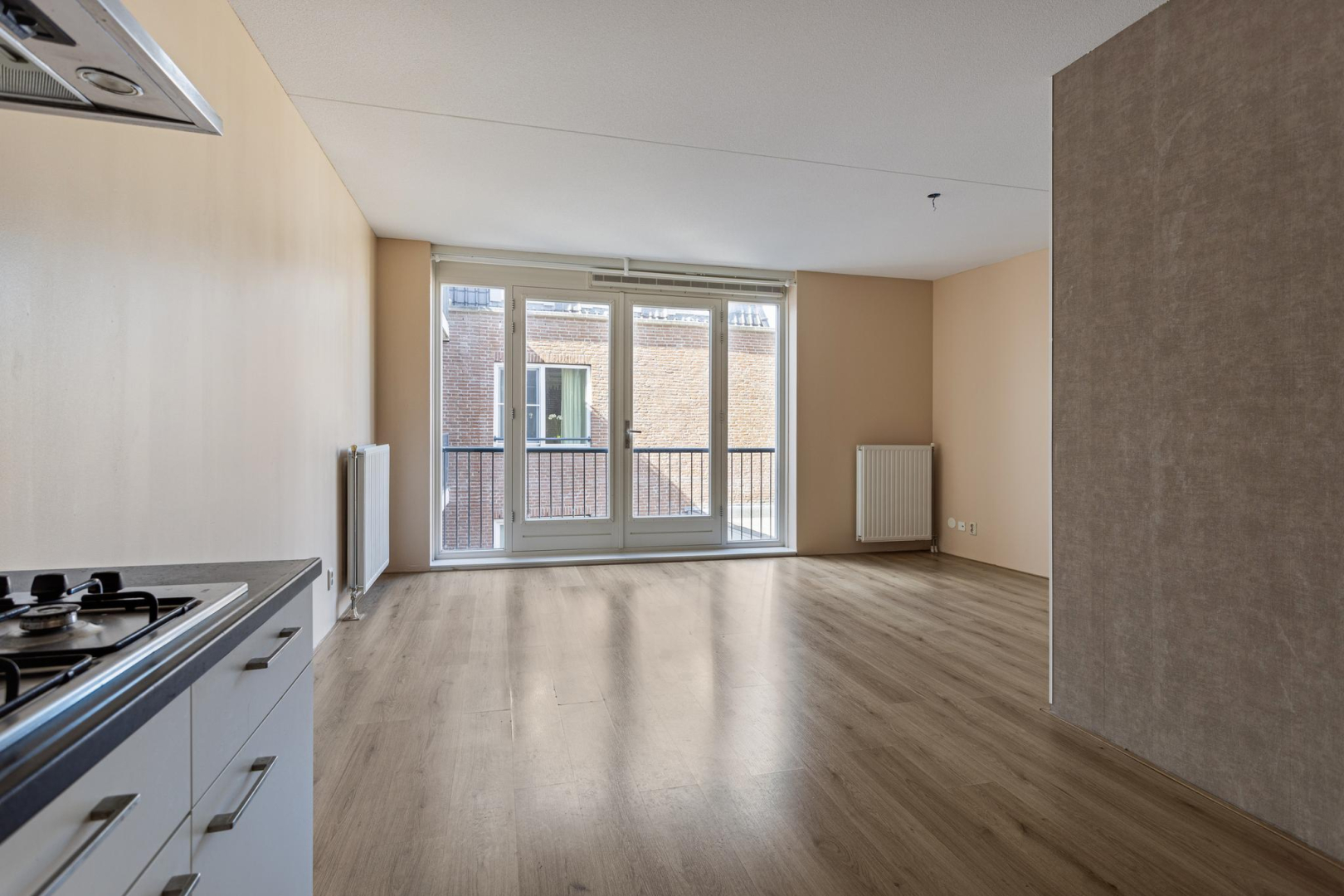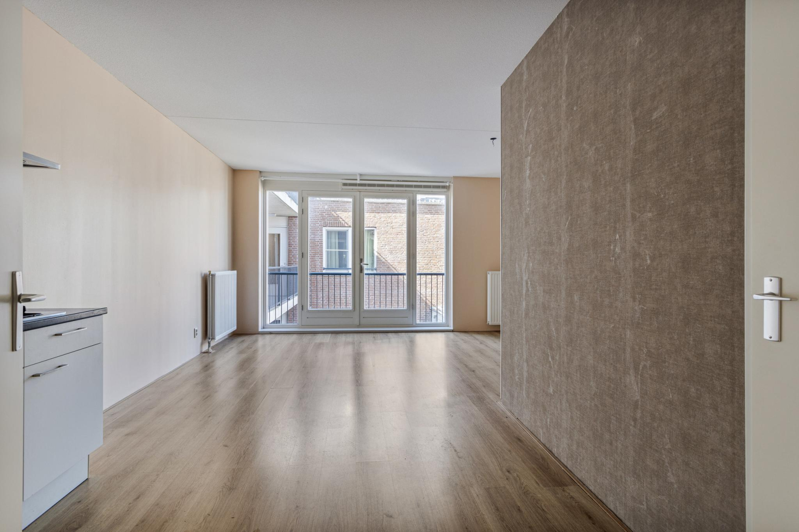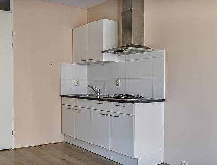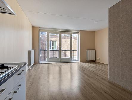 Entree, wandcloset met fonteintje, hal met bergkast waar zich de opstelplaats van de CV combiketel bevindt. Open keuken met 4-pits gaskookplaat, een RVS afzuigkap en kastruimte. De ruime woonkamer beschikt over een zit- en eetgedeelte en heeft een dubbele deur naar het Frans balkon, dat uitkijkt op een rustige binnenplaats. Via de slaapruimte heeft u toegang tot de ruime badkamer die voorzien is van douchecabine, wastafelmeubel en aansluitingen voor wasmachine en droger. De woonkamer, keuken en het slaapgedeelte zijn voorzien van een laminaatvloer.