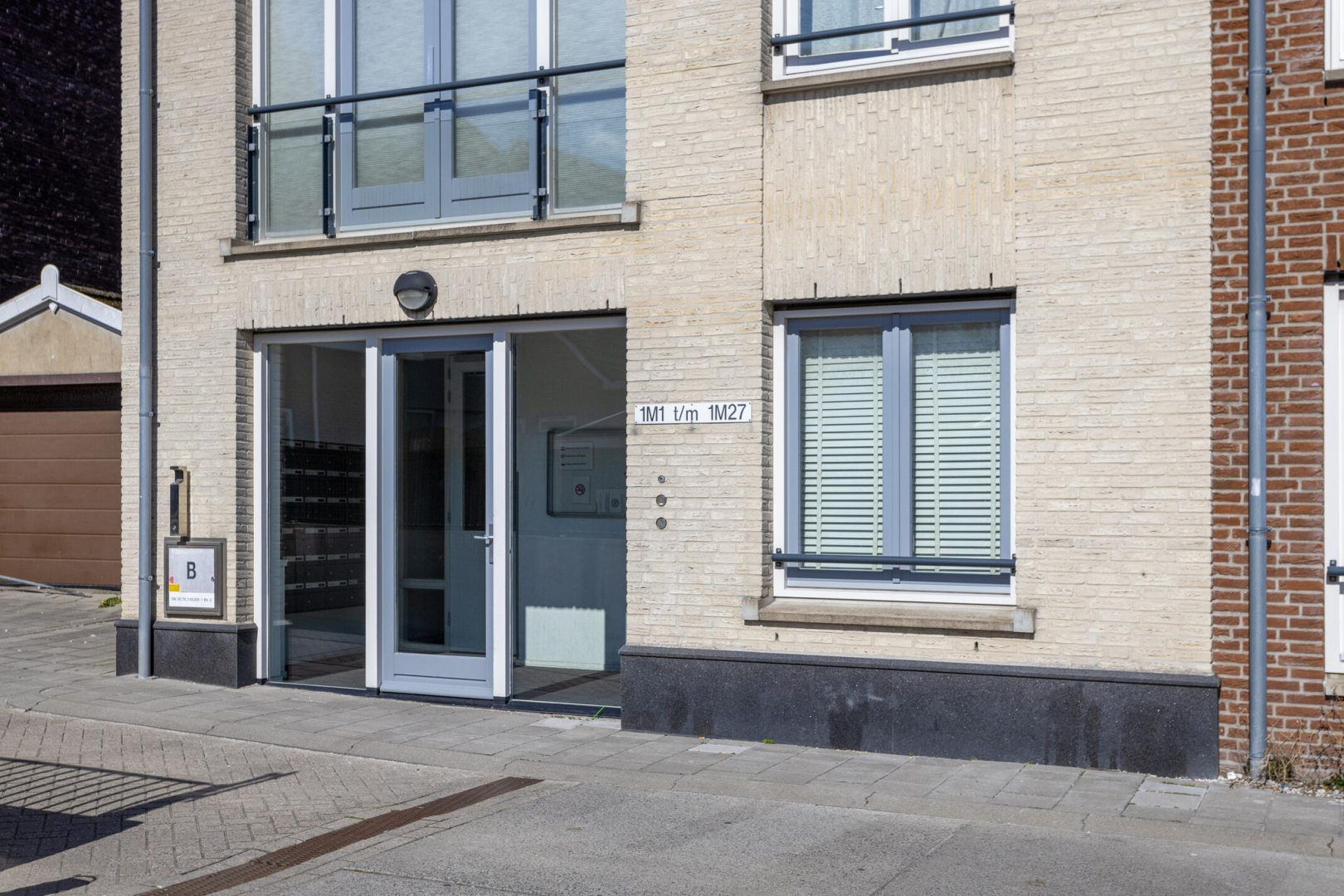 Afgesloten entree met brievenbussen, bellentableau, trappenhuis, lift.
