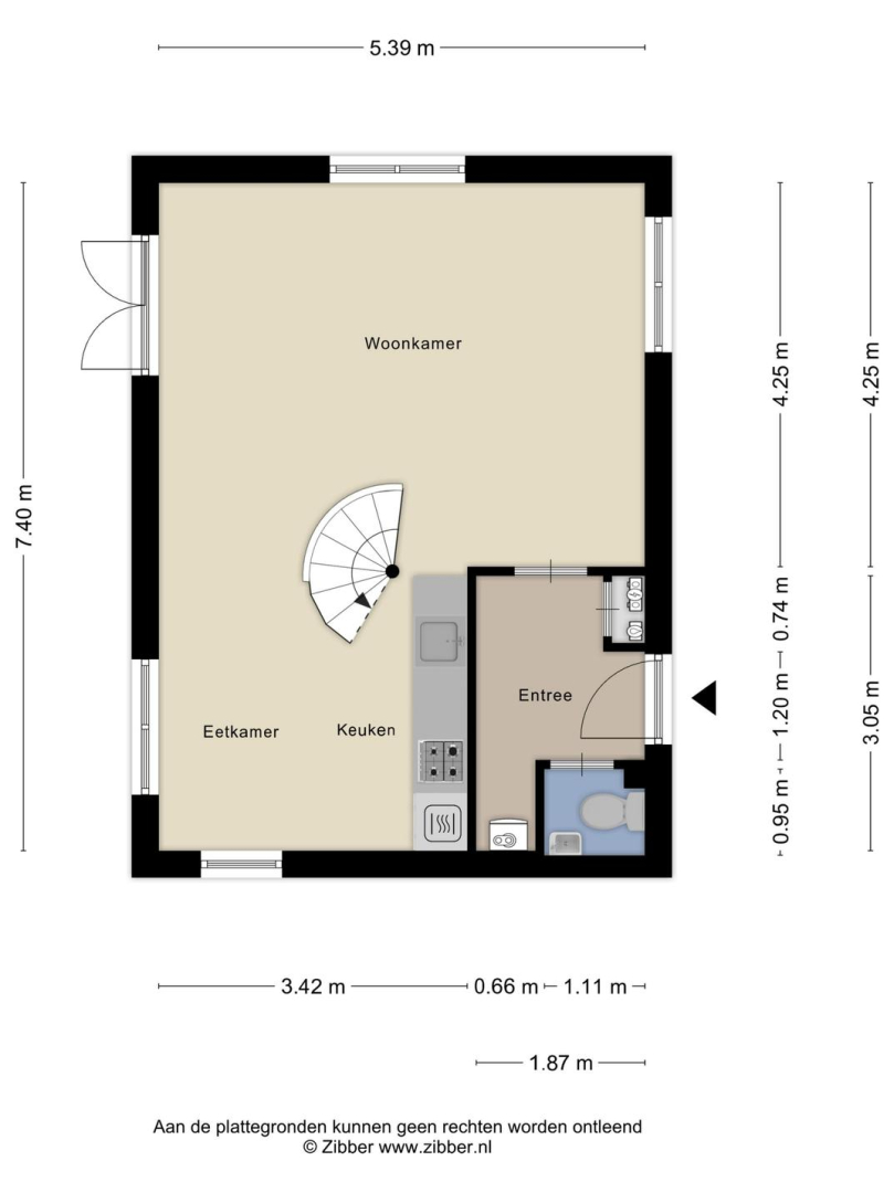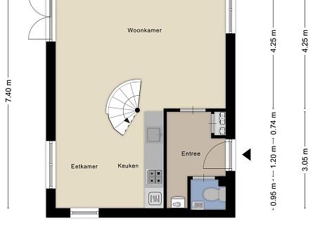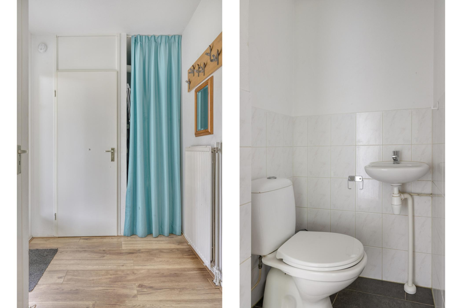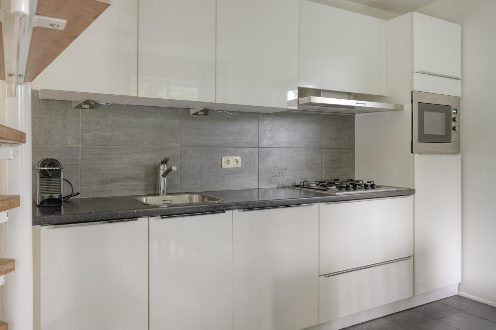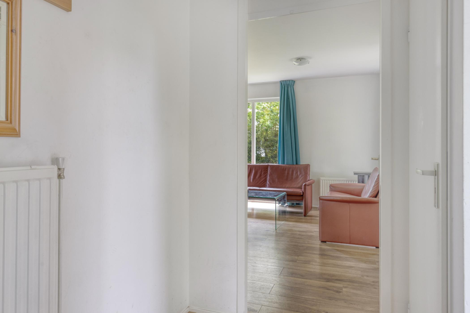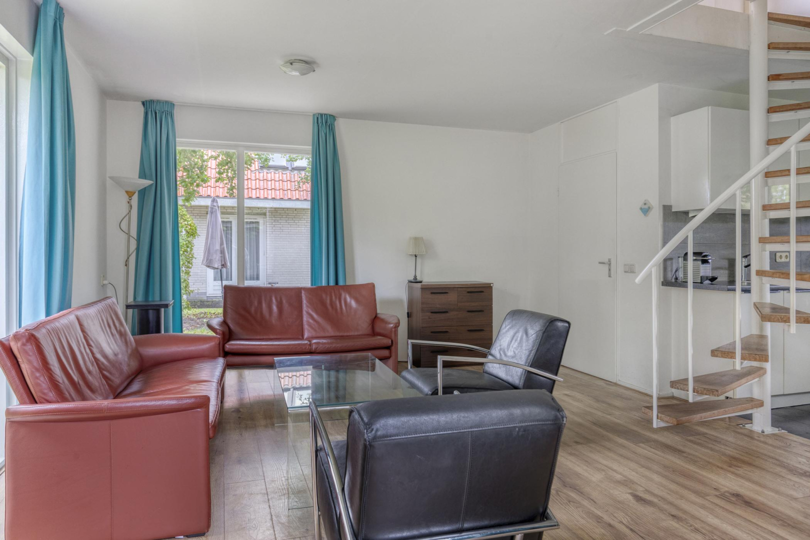 Entree, meterkast, toilet met fonteintje en bergkast met opstelplaats voor de Cv-ketel en wasmachine. De woonkamer met openslaande deuren naar de tuin is heerlijk licht en voorzien van een houtlook laminaatvloer. De modern gerenoveerde open keuken (2021), uitgevoerd in een rechte opstelling met eetgedeelte is voorzien van een 4-pits gaskookplaat, afzuigkap, combi-oven, vaatwasser en koelkast met vriesvak. Op de vloer bij de eettafel en keuken liggen vloertegels in een antraciet kleur. De wanden zijn strak en glad afgewerkt.