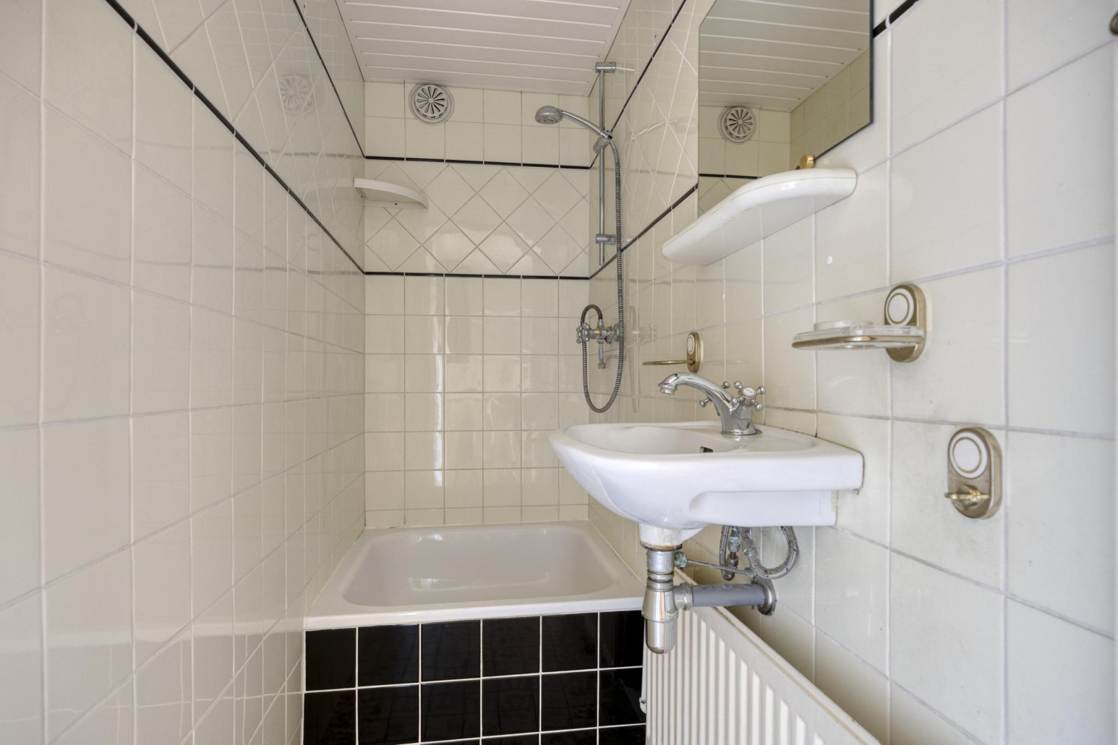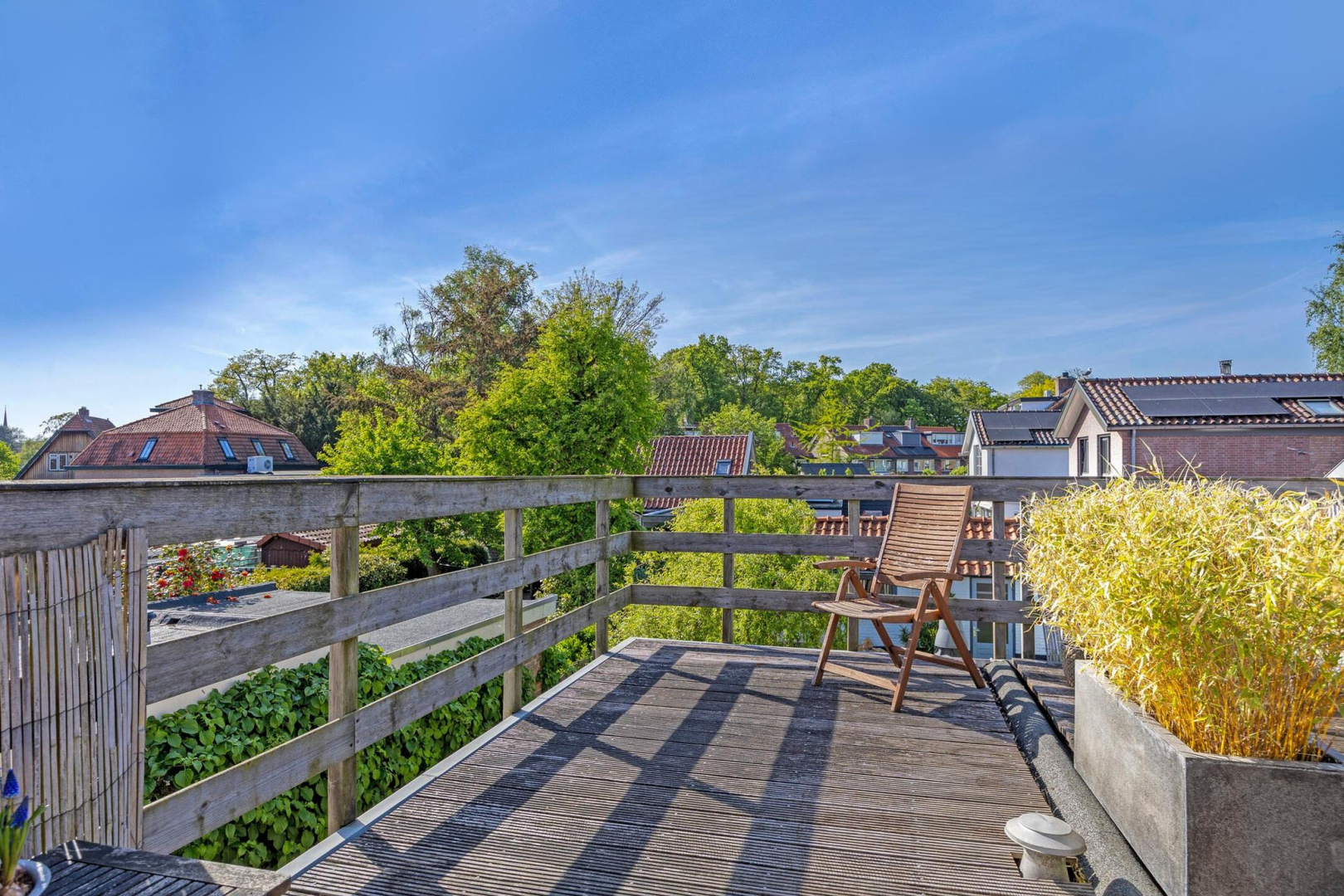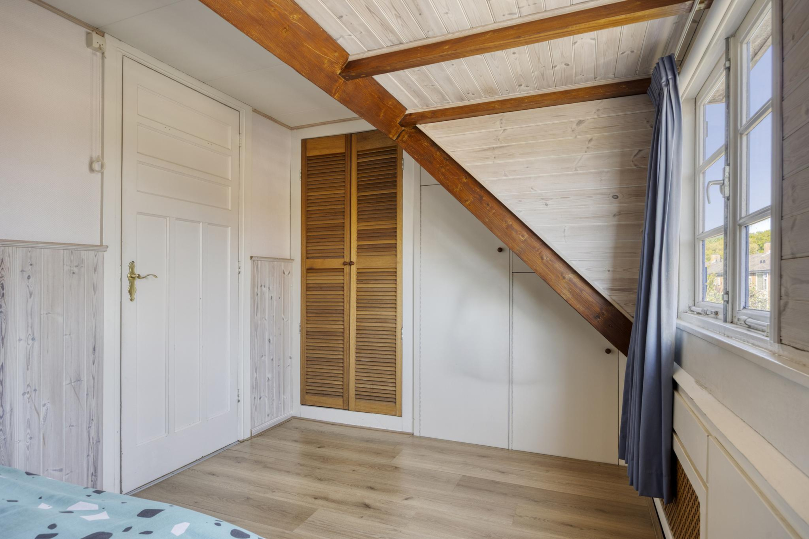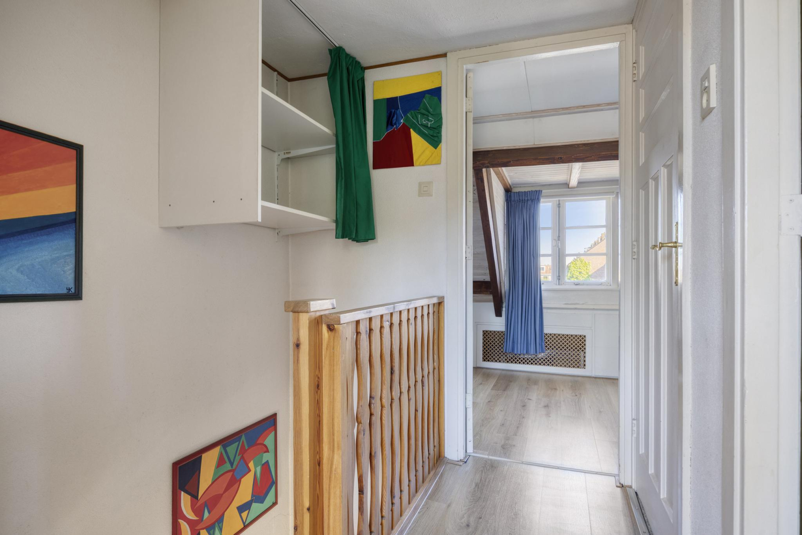De mooie, open trap in de kamer brengt je naar de verdieping. De overloop biedt toegang tot een ruime slaapkamer aan de voorzijde, voorzien van een dakkapel en praktische ingebouwde kastruimte. Aan de achterzijde bevinden zich nog twee prima slaapkamers, waarvan één met toegang tot het zonnige en ruime dakterras. Een grote markies zorgt ervoor dat de zon uit de slaapkamers aan de achterzijde blijft. Vanaf de overloop is de vliering bereikbaar met een uitschuifbare trap. Ideaal als extra opbergruimte.