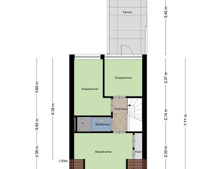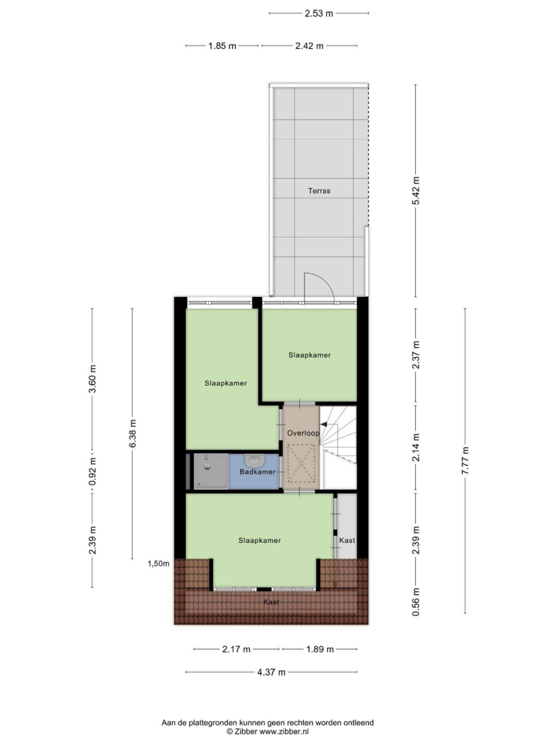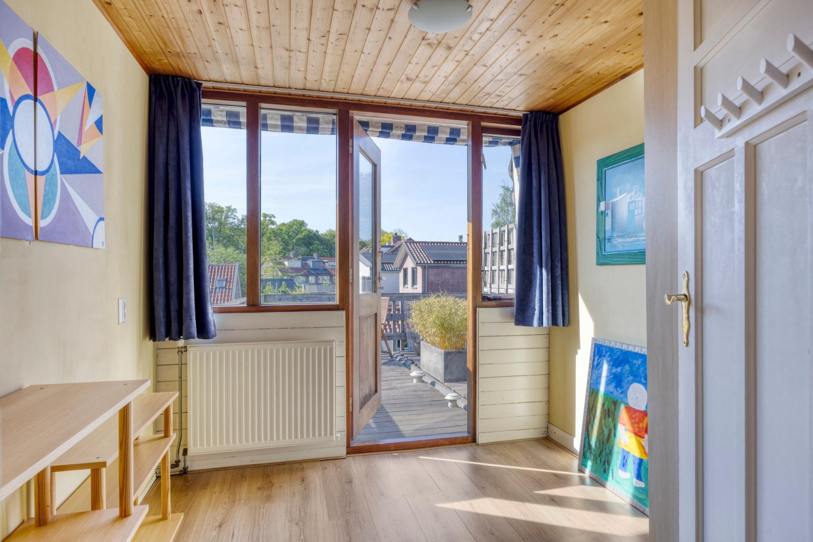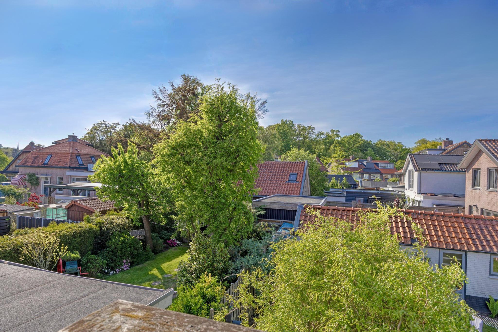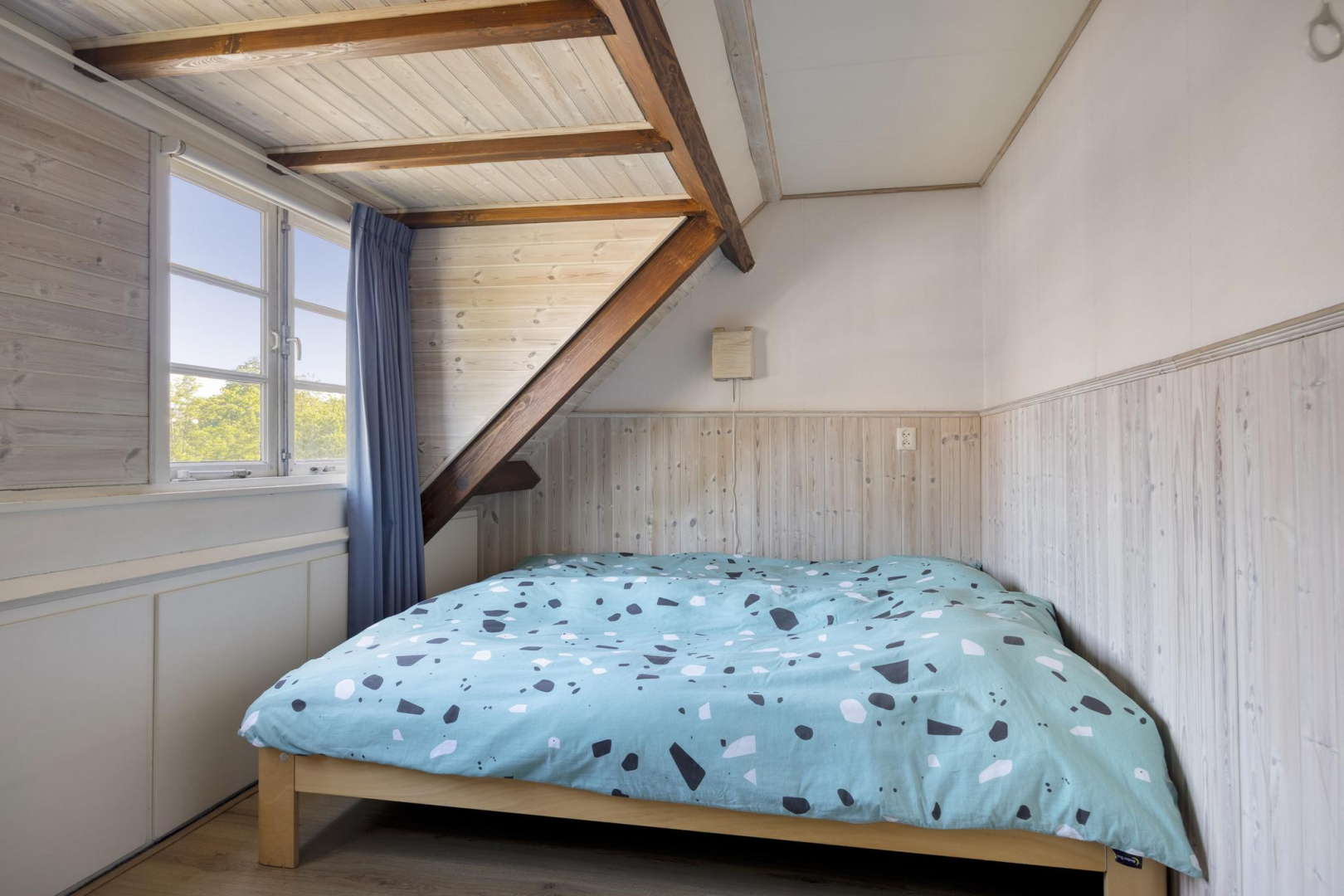 De mooie, open trap in de kamer brengt je naar de verdieping. De overloop biedt toegang tot een ruime slaapkamer aan de voorzijde, voorzien van een dakkapel en praktische ingebouwde kastruimte. Aan de achterzijde bevinden zich nog twee prima slaapkamers, waarvan één met toegang tot het zonnige en ruime dakterras. Een grote markies zorgt ervoor dat de zon uit de slaapkamers aan de achterzijde blijft. Vanaf de overloop is de vliering bereikbaar met een uitschuifbare trap. Ideaal als extra opbergruimte.