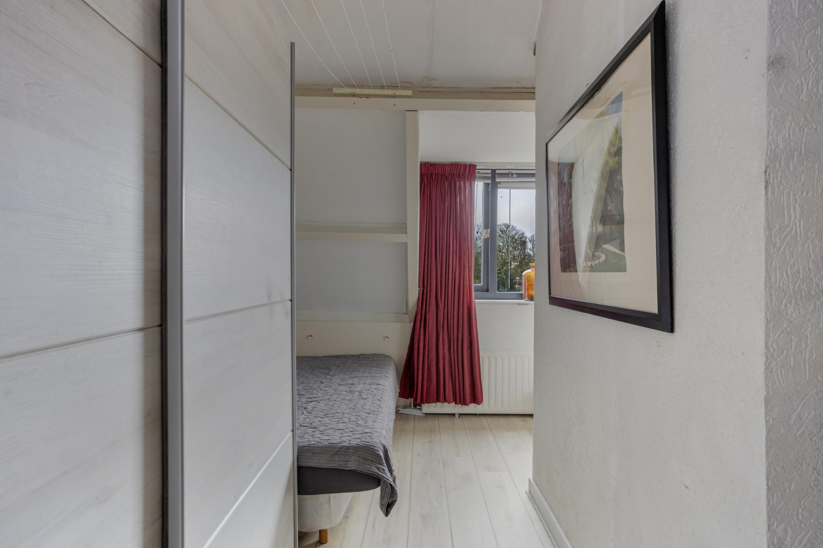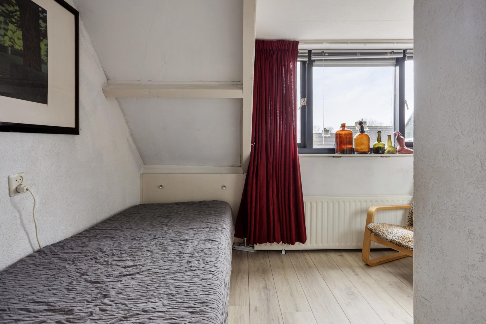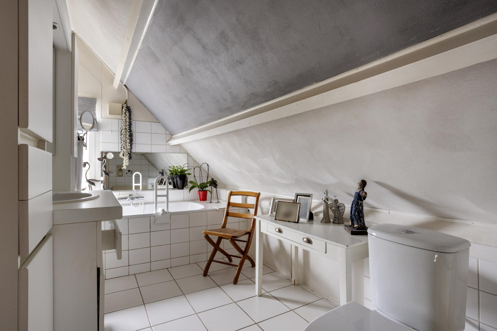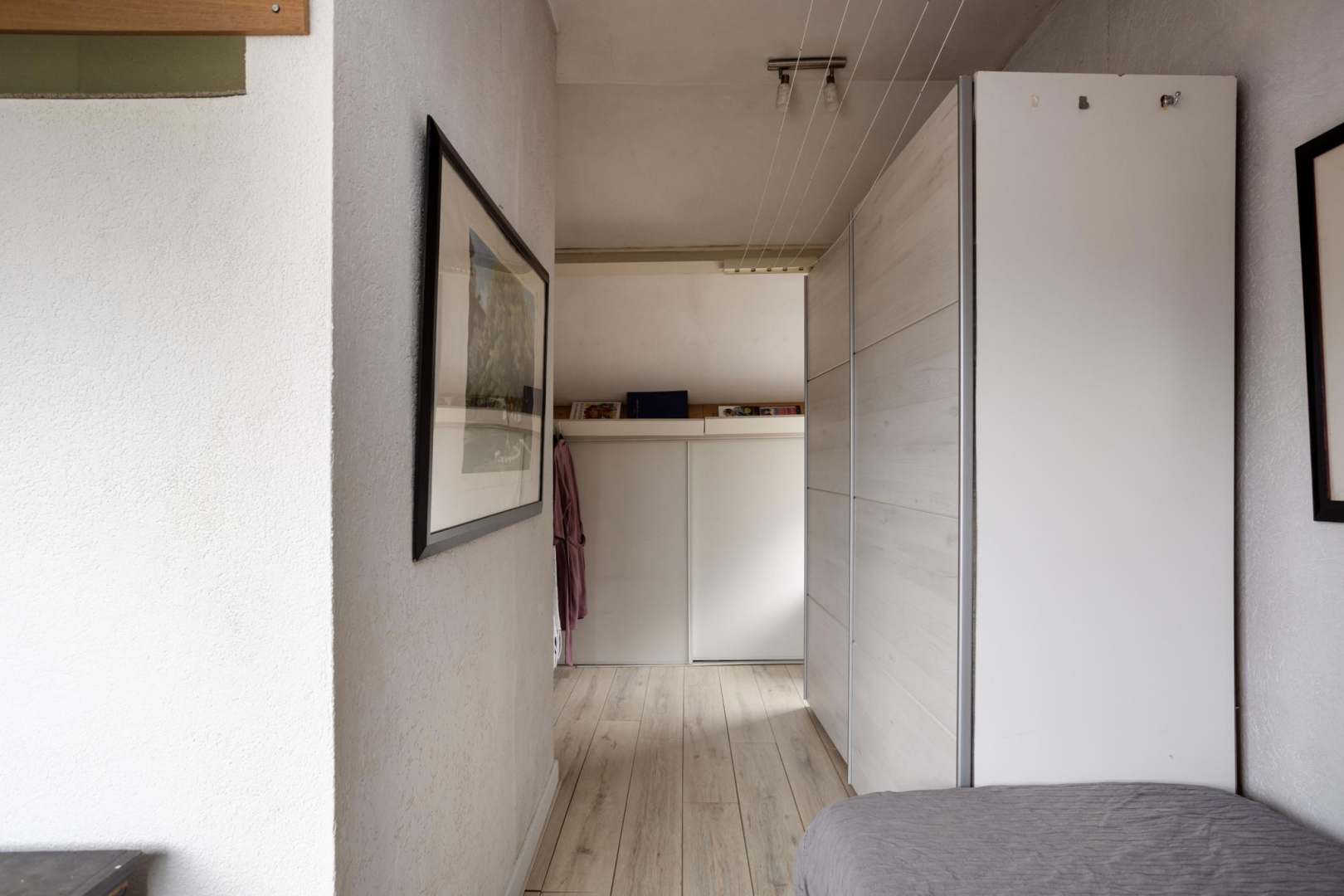 1e Verdieping: Via de open trap komt u op de eerste verdieping. De overloop heeft veel opbergruimte achter de knieschotten. Er is een mogelijkheid om hier nog een 2e slaapkamer te creëren. Via de badkamer, met toilet, wastafelmeubel en ligbad komt u in de slaapkamer. Op deze verdieping ligt een laminaatvloer met uitzondering van de badkamer.