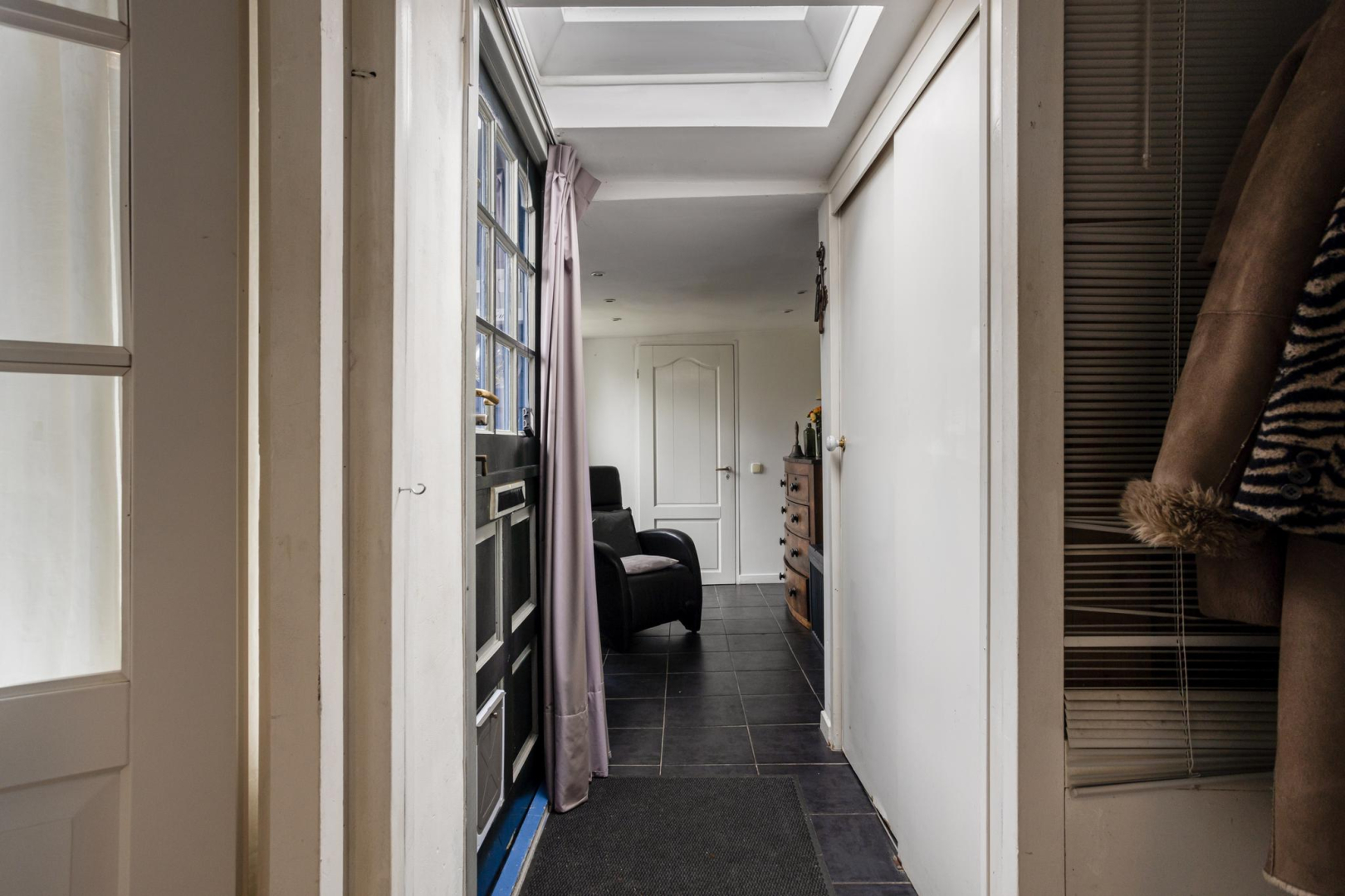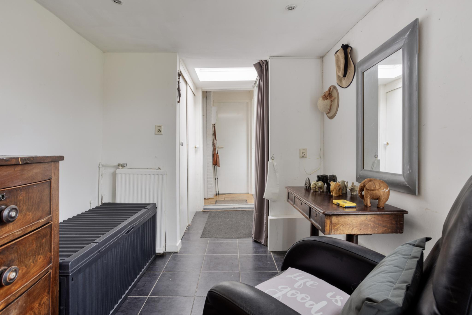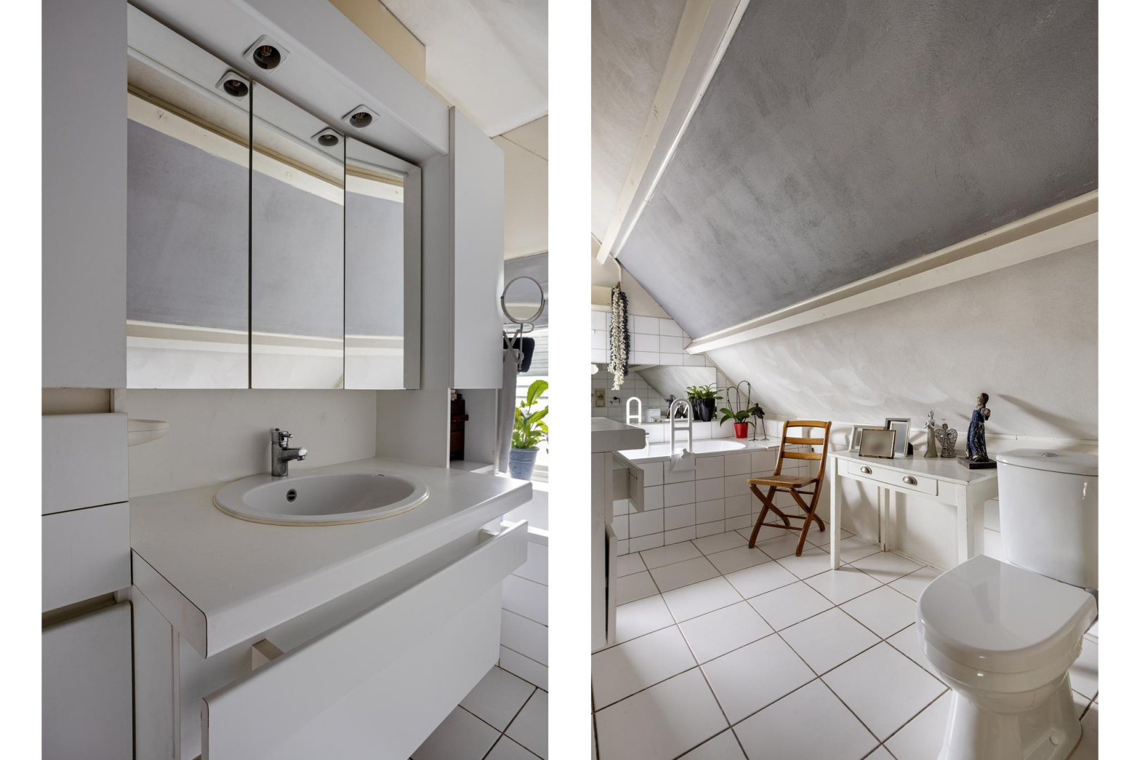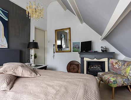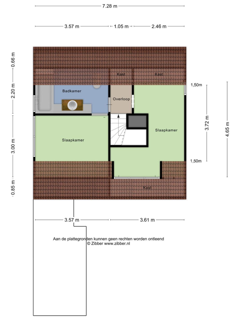 1e Verdieping: Via de open trap komt u op de eerste verdieping. De overloop heeft veel opbergruimte achter de knieschotten. Er is een mogelijkheid om hier nog een 2e slaapkamer te creëren. Via de badkamer, met toilet, wastafelmeubel en ligbad komt u in de slaapkamer. Op deze verdieping ligt een laminaatvloer met uitzondering van de badkamer.
