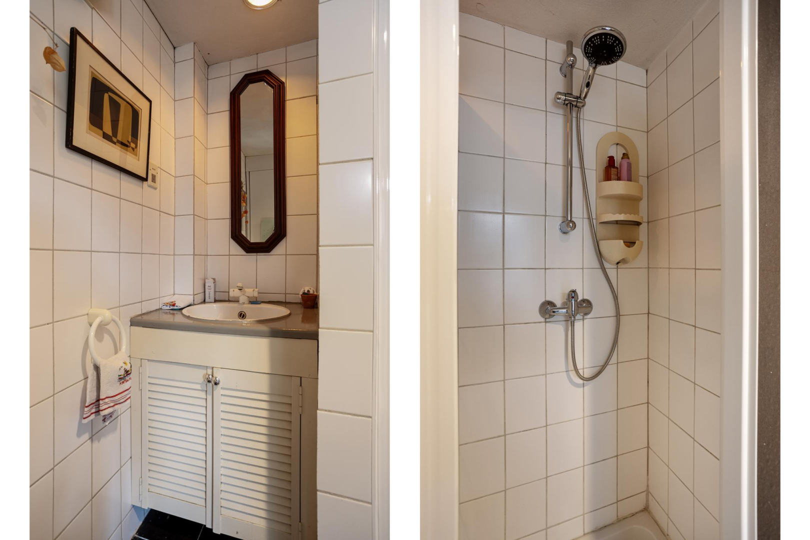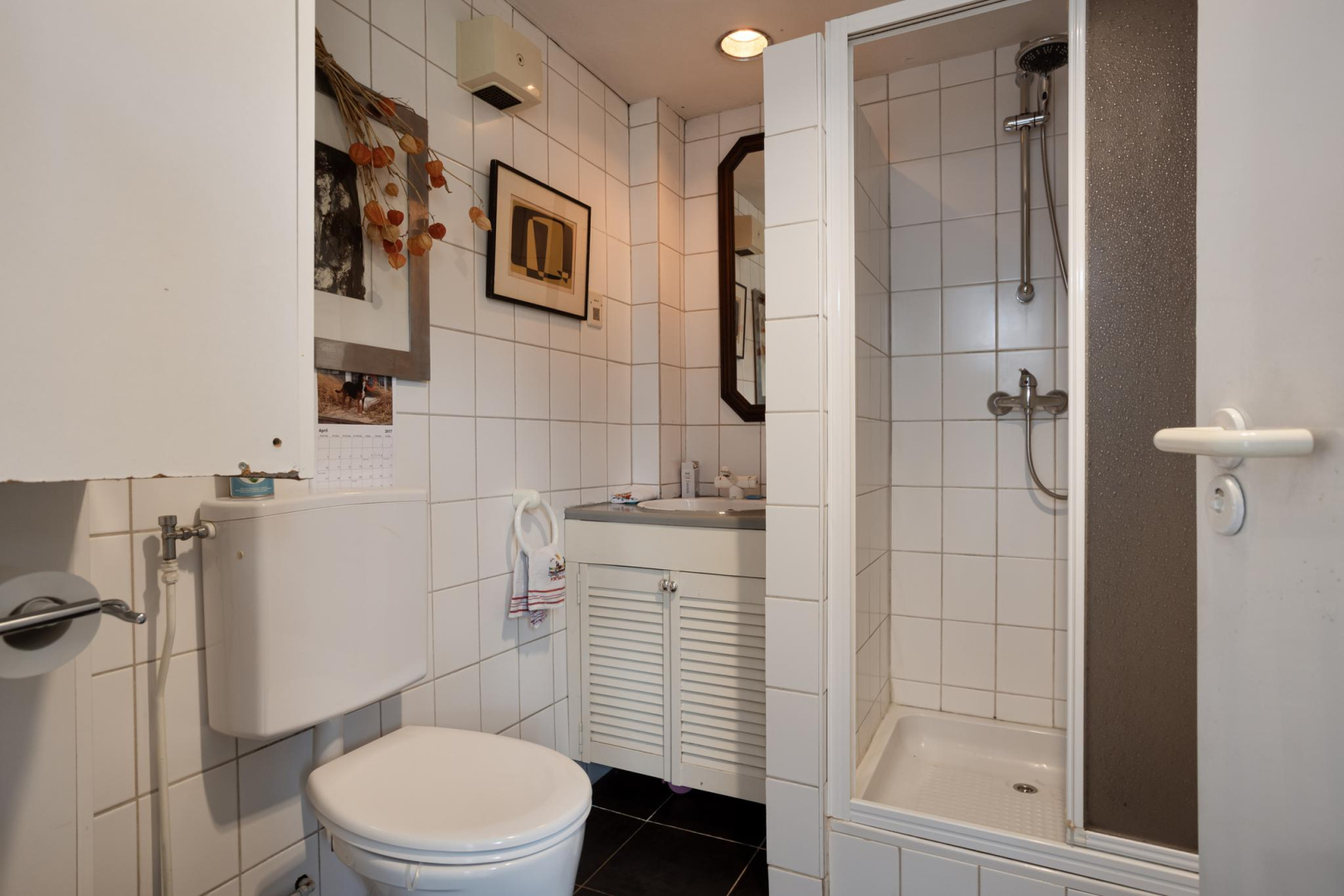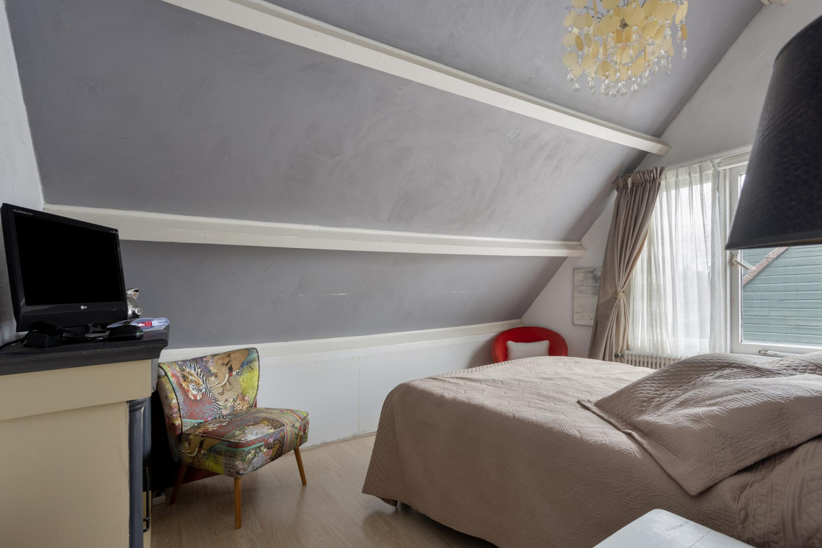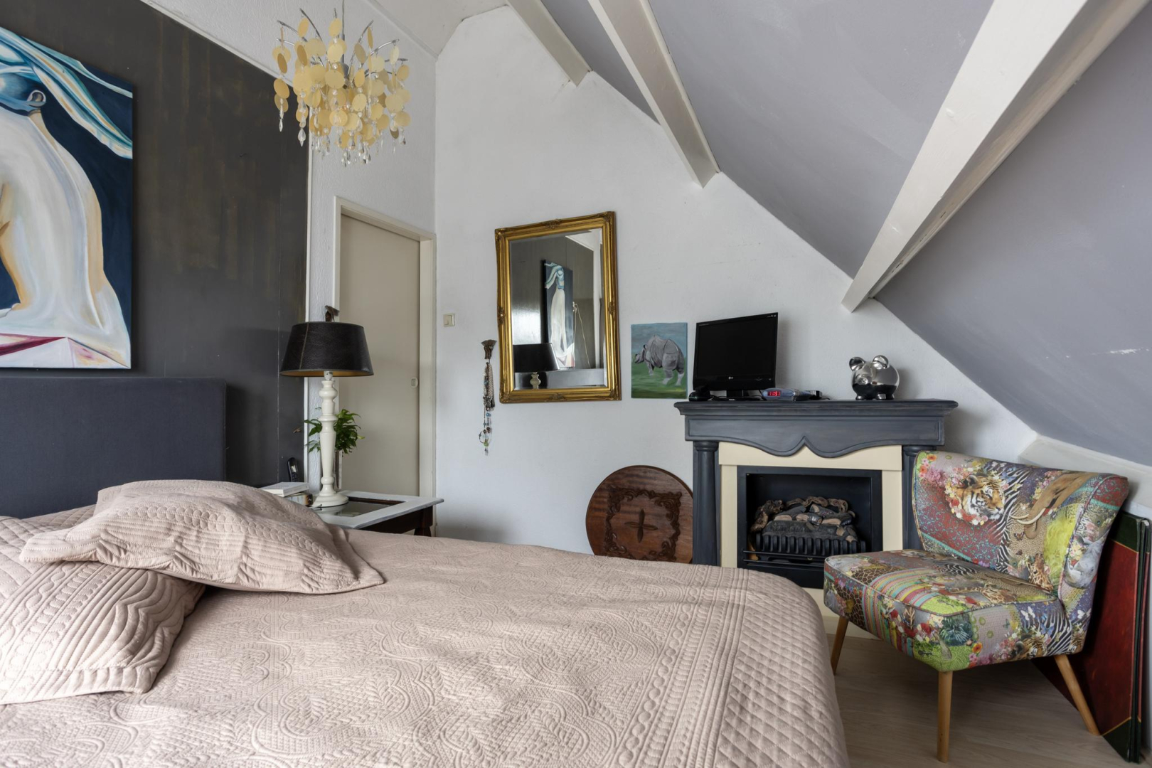 1e Verdieping: Via de open trap komt u op de eerste verdieping. De overloop heeft veel opbergruimte achter de knieschotten. Er is een mogelijkheid om hier nog een 2e slaapkamer te creëren. Via de badkamer, met toilet, wastafelmeubel en ligbad komt u in de slaapkamer. Op deze verdieping ligt een laminaatvloer met uitzondering van de badkamer.