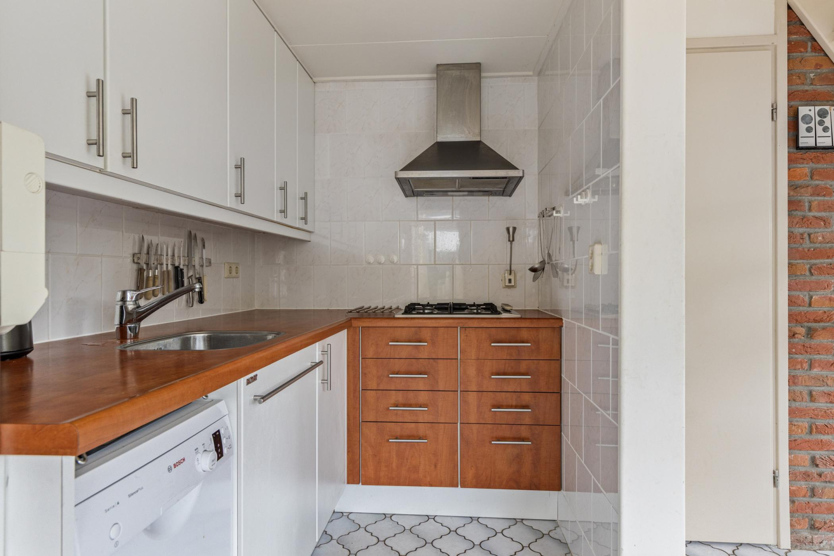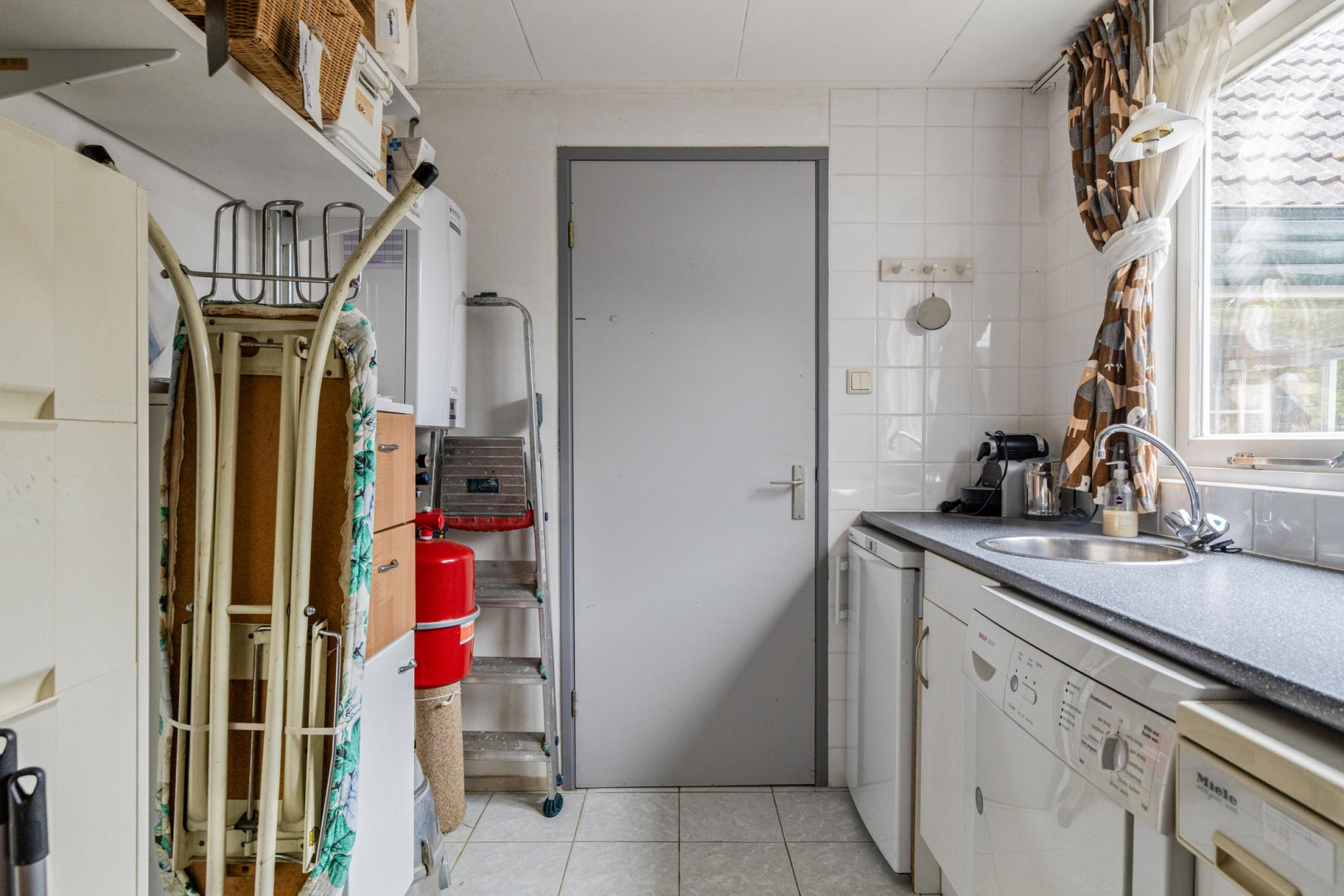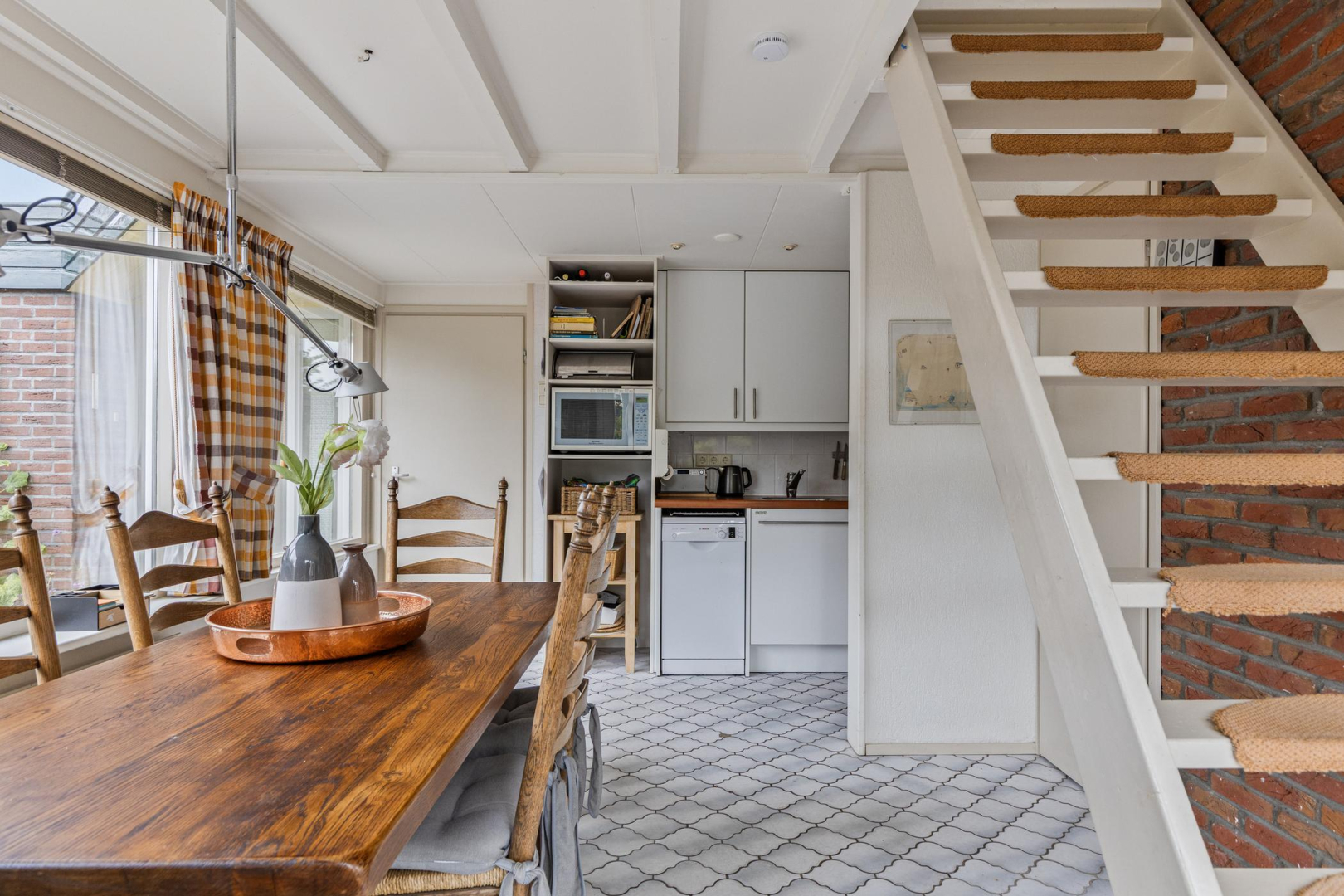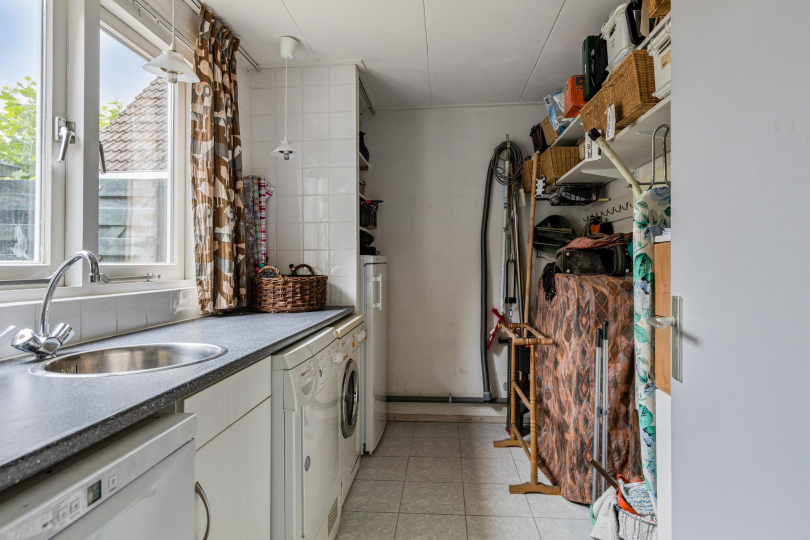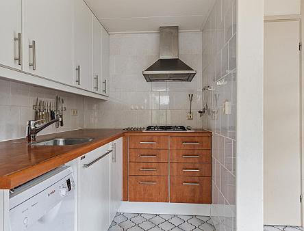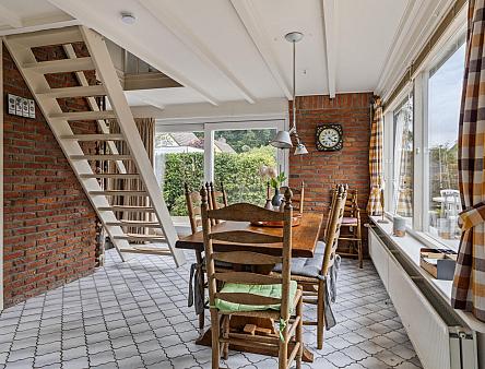 Entree, garderobe, meterkast en toegang tot de bijkeuken. Hier bevinden zich de opstelplaats voor de cv-ketel (2021) en de aansluiting voor de wasmachine. De bijkeuken is voorzien van een praktische tegelvloer. Vanuit de hal is ook de badkamer bereikbaar, uitgerust met een douche, toilet, wastafel en een handig spiegelkastje. De halfopen keuken is uitgerust met een 4-pits gasfornuis, vaatwasser en veel kastruimte. Daarnaast is er een handige voorraadkast aanwezig. De keuken staat in directe verbinding met de eethoek, waar een schuifpui toegang biedt tot het zonnige terras, ideaal voor een diner in de avondzon of een kop koffie in de ochtend. Via de gezellige eethoek loopt u zo de woonkamer in, compleet met een sfeervolle haard.
