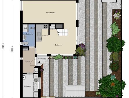 De woning beschikt over een fraai aangelegde L-vormige tuin met volop ruimte om te ontspannen, te genieten van het zonnetje of uitgebreid te dineren in de buitenlucht. De tuin is omgeven door een combinatie van een schutting en groene beplanting, wat zorgt voor optimale privacy en een fijne, beschutte sfeer.