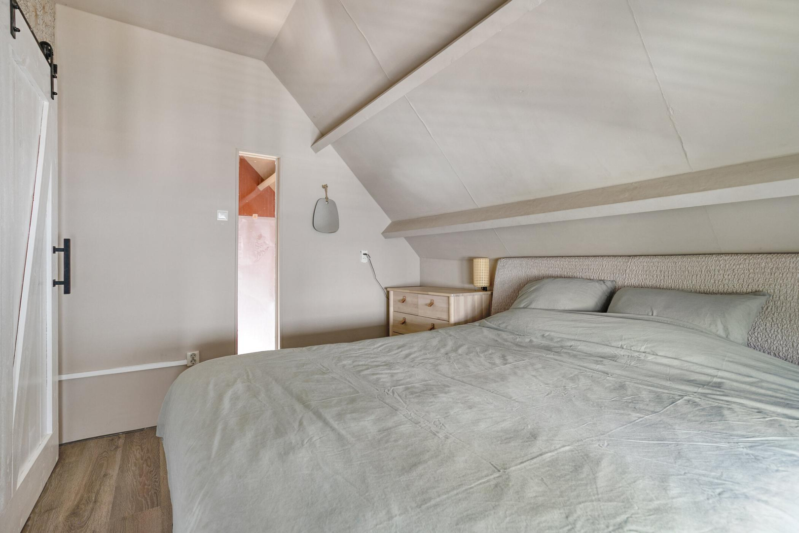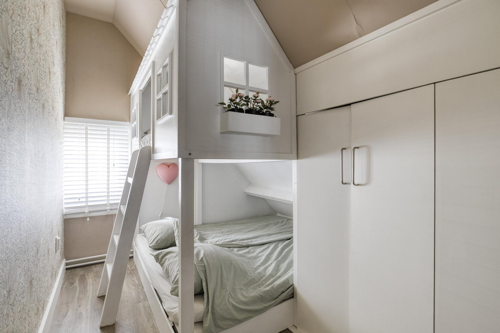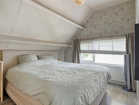 Via de trap bereikt u de overloop, waar de cv-ketel is geplaatst en praktische knieschotten zorgen voor extra opbergruimte. Vanaf hier heeft u toegang tot drie sfeervolle slaapkamers. De ruime masterbedroom is bereikbaar via een schuifdeur vanuit de huidige kinderkamer, die dankzij een speels stapelbedmeubel drie slaapplaatsen biedt. In deze kamer bevindt zich ook een ingebouwde kast, ideaal als kledingkast. De derde slaapkamer, eveneens ruim, ligt aan de tuinzijde en beschikt, net als de overloop, over handige knieschotten voor extra opbergmogelijkheden.