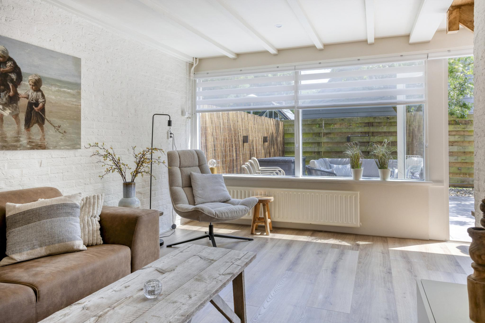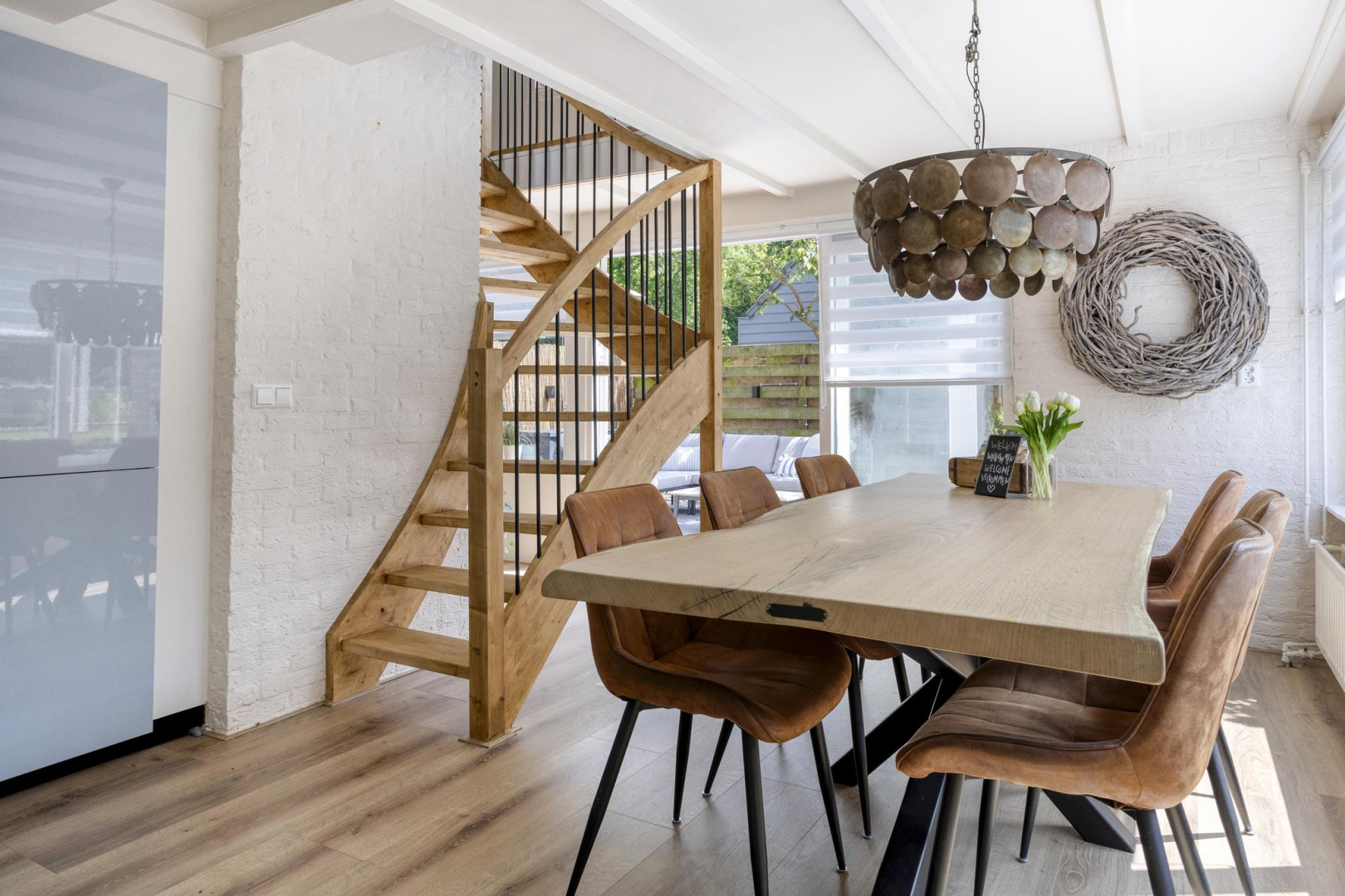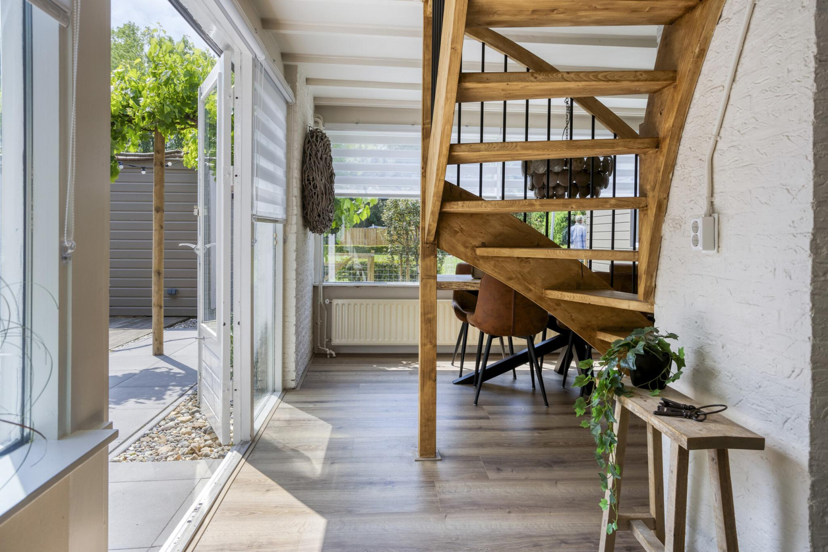 Via de entree kom je in de hal met garderoberuimte en meterkast. Vanuit de hal is er toegang tot een kamer die momenteel in gebruik is als bijkeuken, maar ook geschikt is als slaapkamer. Aansluitend bevindt zich een praktische bergruimte met aansluitingen voor de wasmachine. Daarnaast biedt de hal toegang tot zowel de moderne badkamer als de royale woonruimte. De badkamer (2025) is eigentijds ingericht en voorzien van een wandcloset, stijlvol wastafelmeubel, spiegel met geïntegreerde spiegelverwarming en verlichting, handdoekradiator en een comfortabele inloopdouche met zowel een regen- als handdouche. De keuken (2025) en het eetgedeelte genieten van veel daglicht dankzij de grote raampartijen en de keuken is uitgevoerd in een praktische L-opstelling. De keuken is uitgerust met moderne inbouwapparatuur, waaronder een inductiekookplaat, afzuigkap, combi-oven, vaatwasser, koelkast en vriezer. Vanuit het aangrenzende eetgedeelte loop je door naar de gezellige zitkamer, compleet met open haard en openslaande deuren die toegang geven tot het terras en de tuin. Aansluitend aan de woonkamer bevindt zich een ruime slaapkamer, voorzien van airconditioning voor extra comfort.
