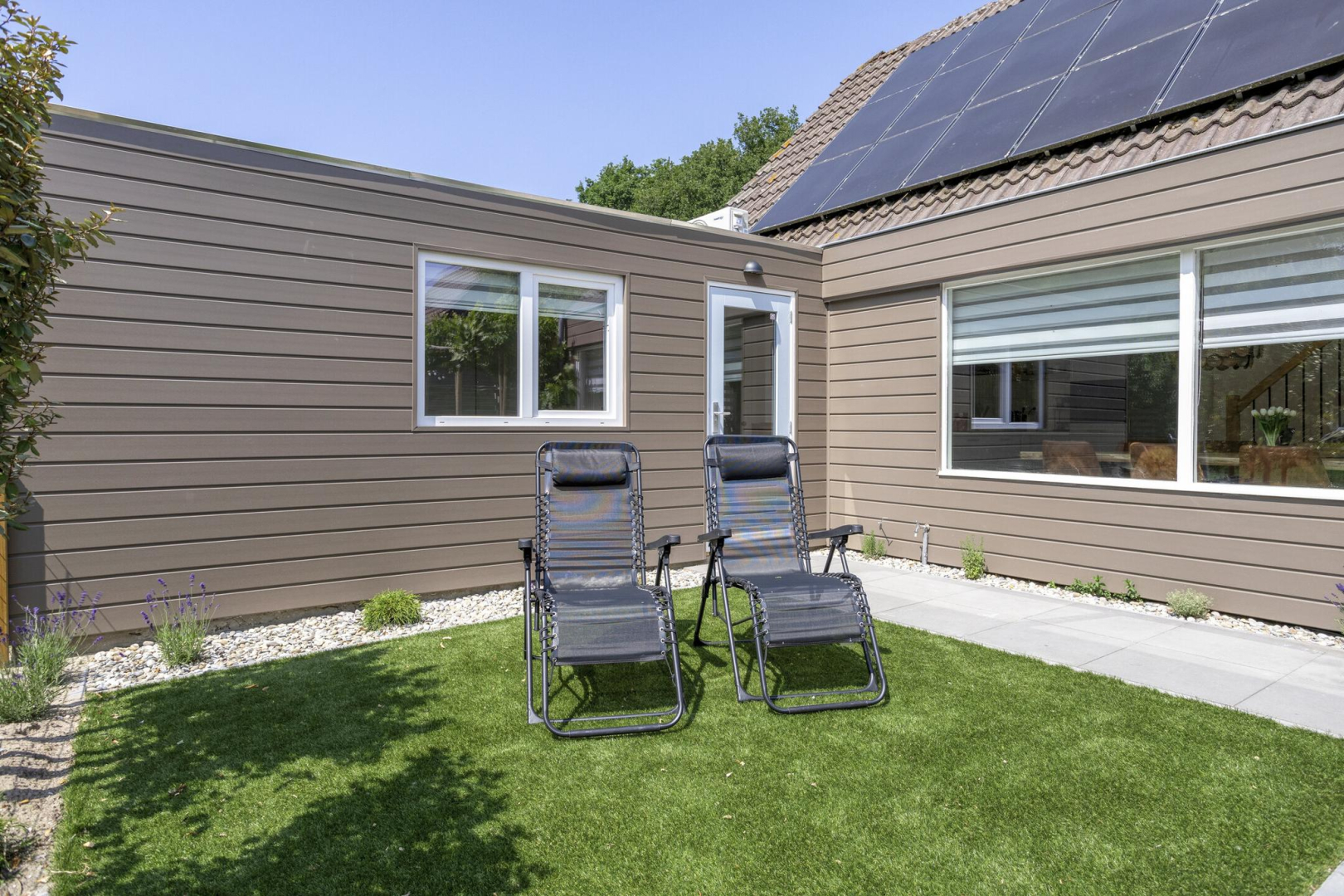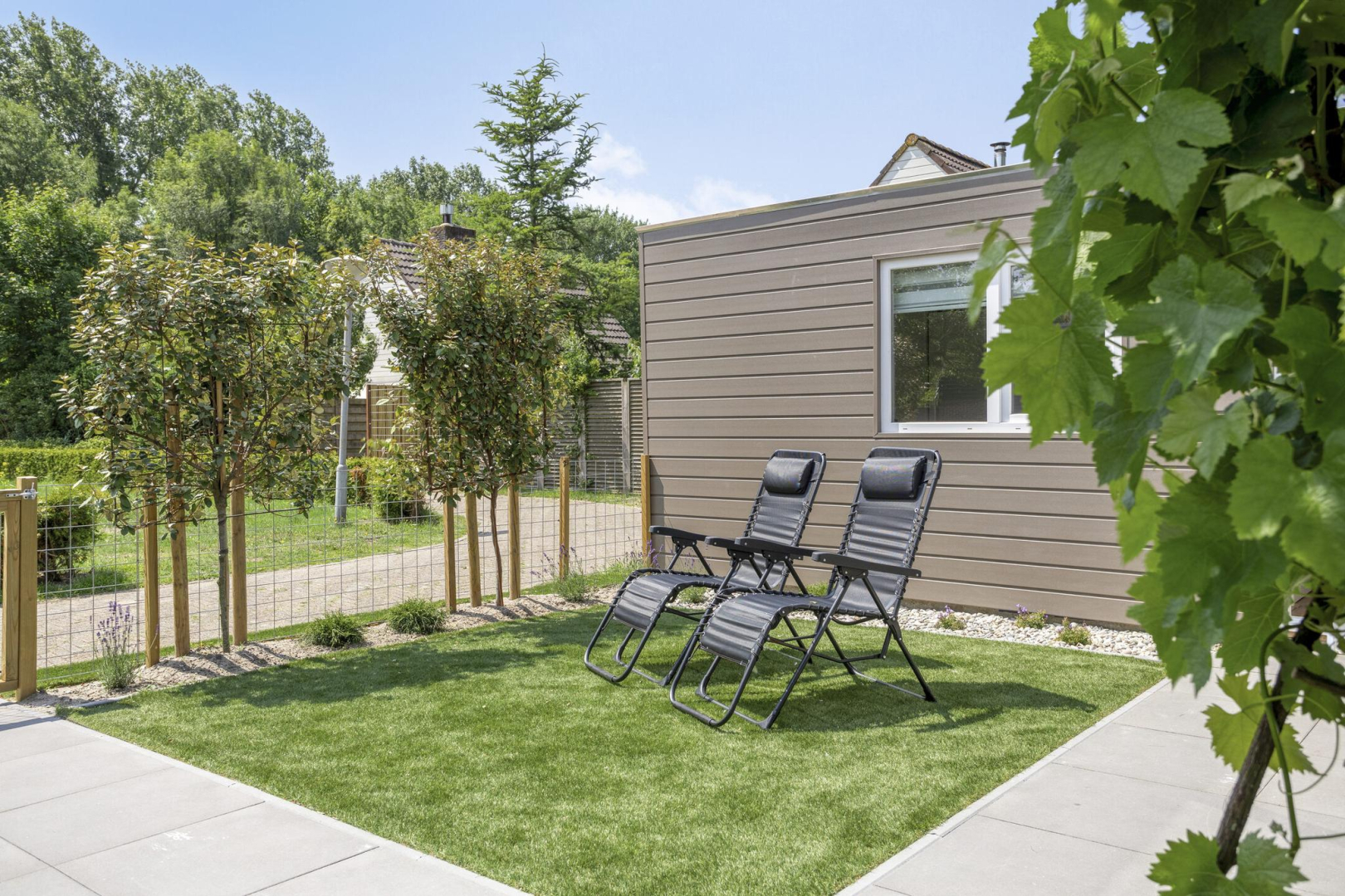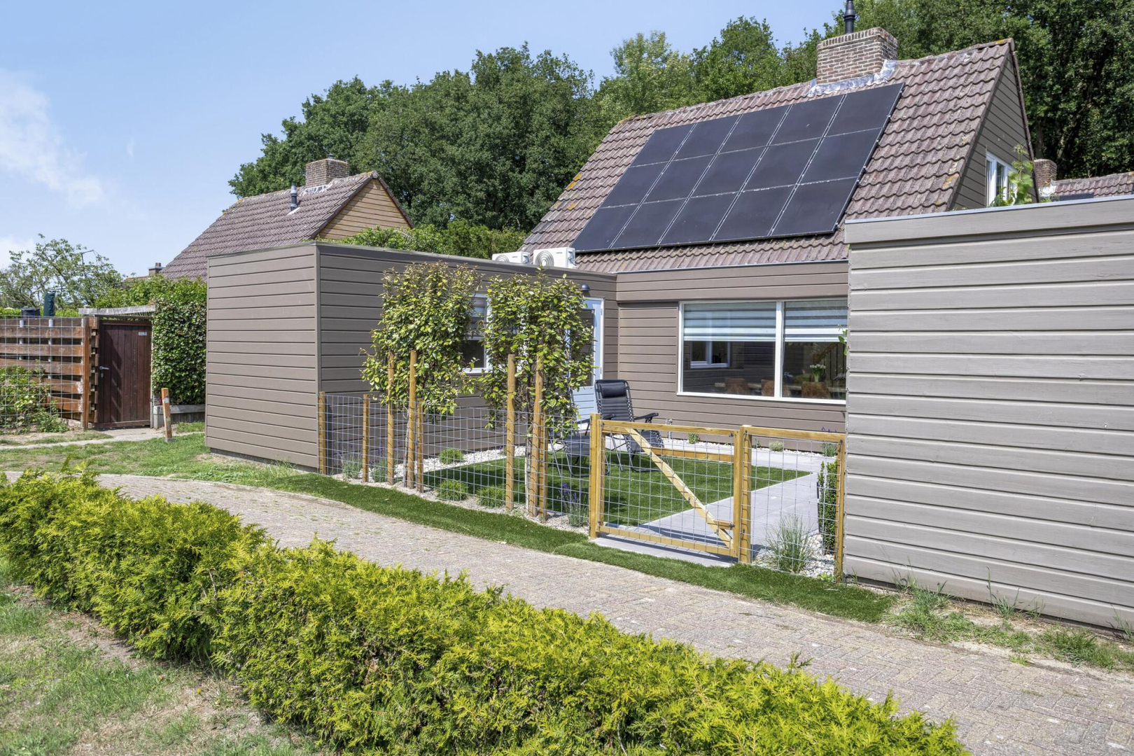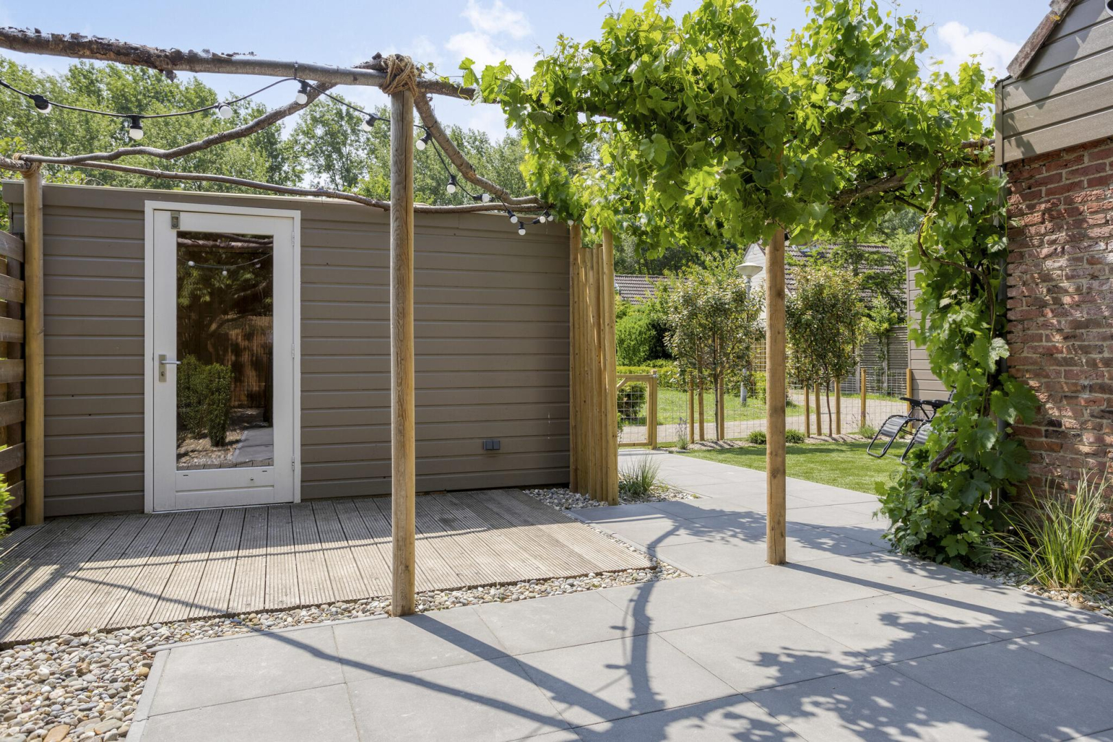 De fraai aangelegde en keurig onderhouden tuin biedt aan de voorzijde een prachtig gazon van kunstgras (nauwelijks van echt te onderscheiden), met vrij uitzicht. Achter in de tuin bevindt zich een heerlijk terras, direct grenzend aan de woning, waar u in alle rust en privacy kunt genieten. De vrijstaande houten berging is geïsoleerd en beschikt over een eigen douche en toilet. Bovendien is er een aansluiting aanwezig voor het realiseren van een sauna. Aansluitend aan de berging ligt een sfeervol vlonderterras met prieel, waar een druivenstruik decoratief overheen groeit, kortom een idyllisch plekje om te ontspannen.