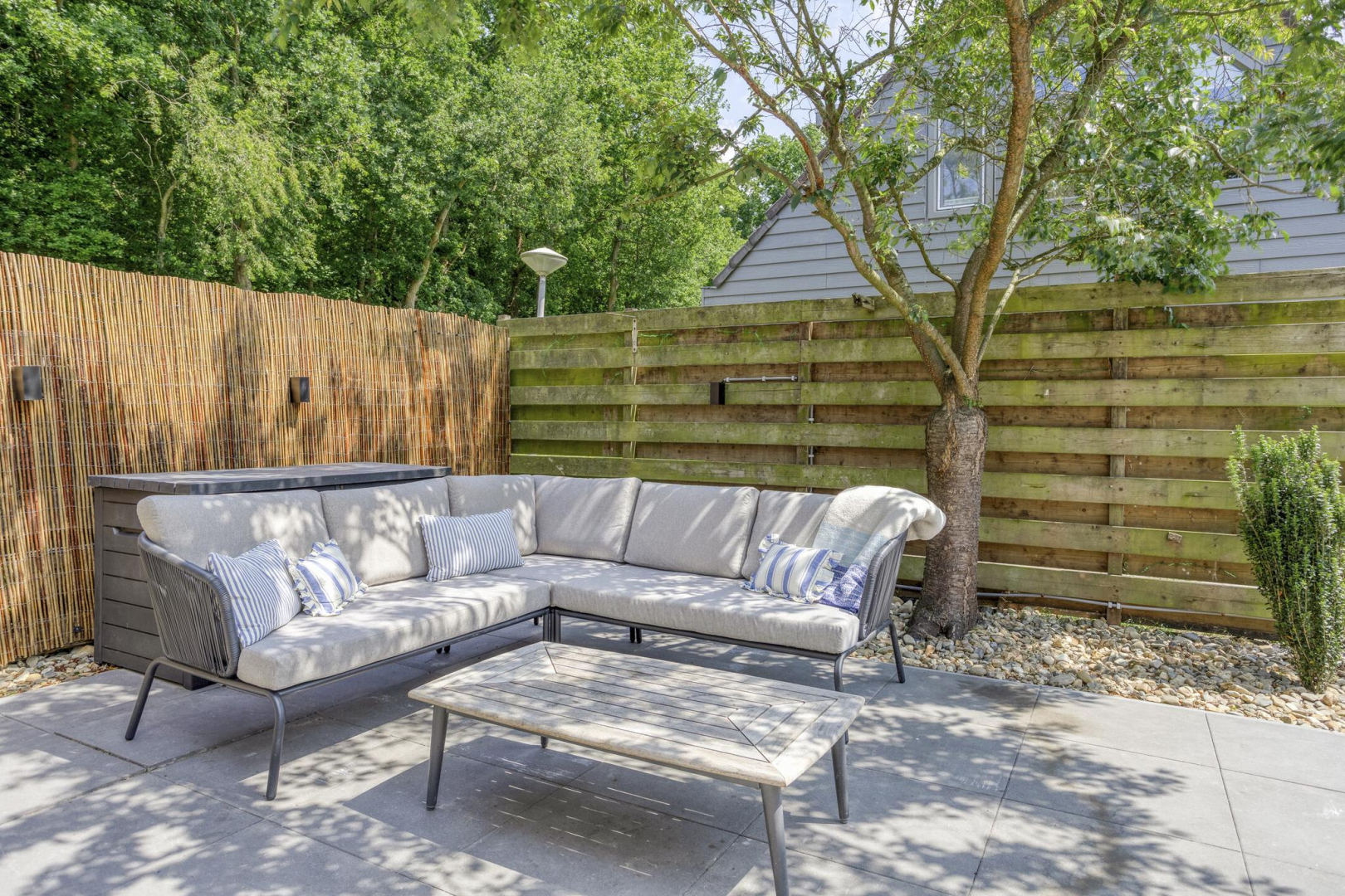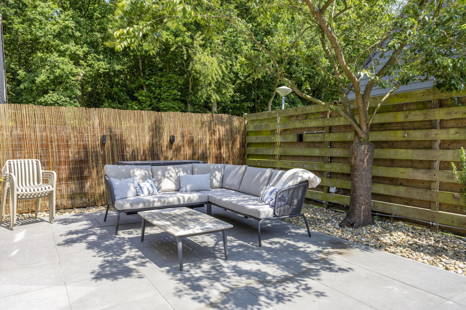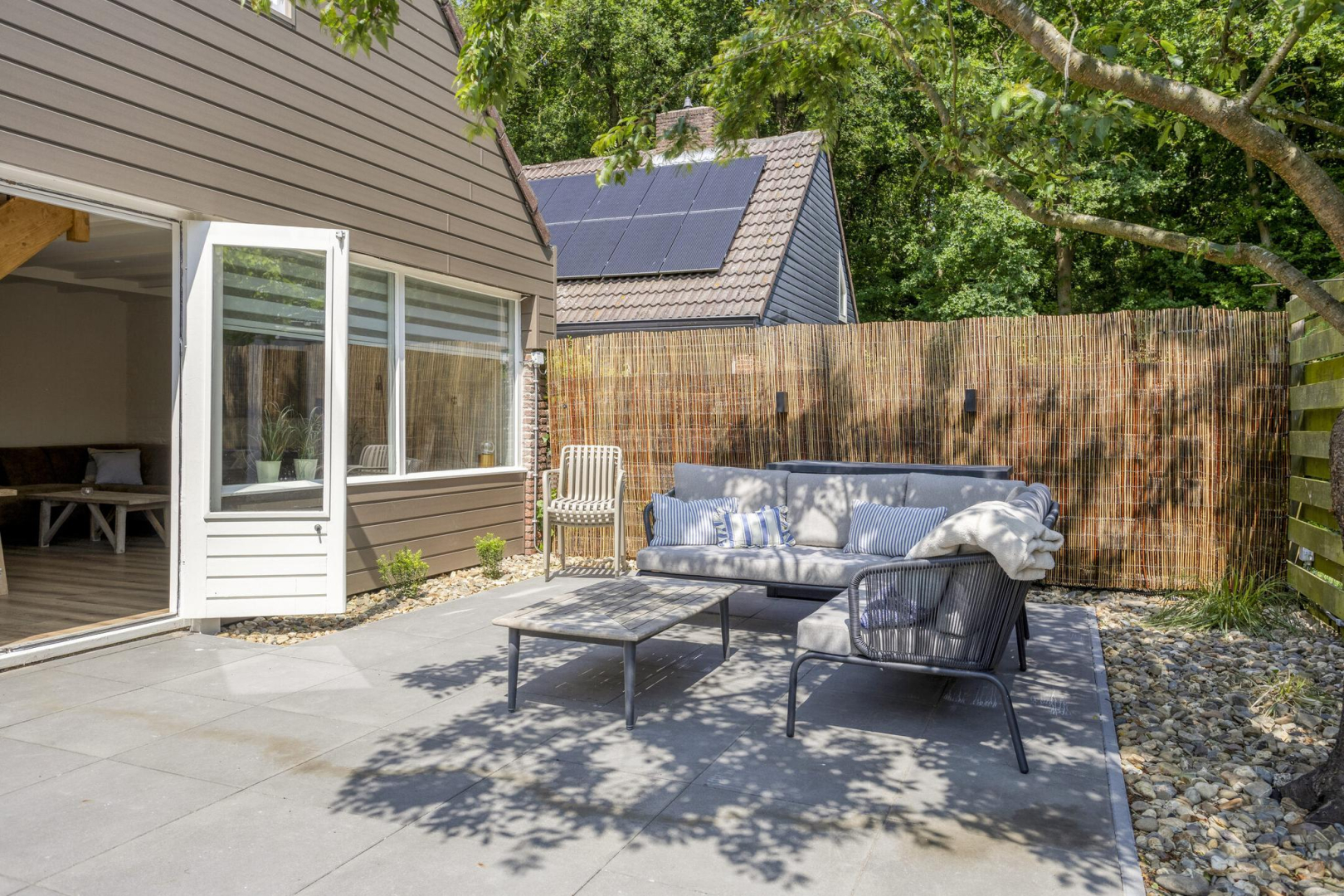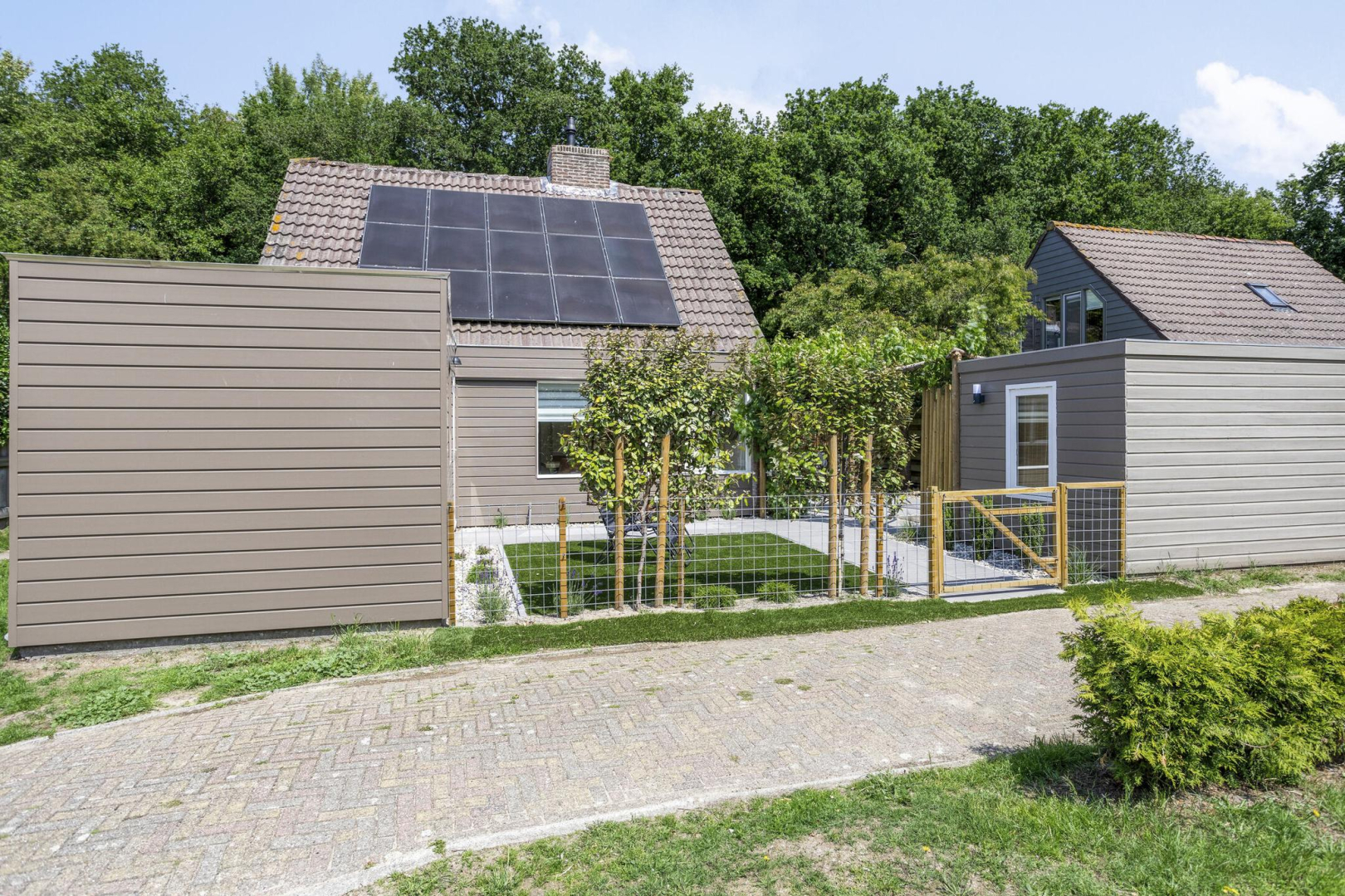 De fraai aangelegde en keurig onderhouden tuin biedt aan de voorzijde een prachtig gazon van kunstgras (nauwelijks van echt te onderscheiden), met vrij uitzicht. Achter in de tuin bevindt zich een heerlijk terras, direct grenzend aan de woning, waar u in alle rust en privacy kunt genieten. De vrijstaande houten berging is geïsoleerd en beschikt over een eigen douche en toilet. Bovendien is er een aansluiting aanwezig voor het realiseren van een sauna. Aansluitend aan de berging ligt een sfeervol vlonderterras met prieel, waar een druivenstruik decoratief overheen groeit, kortom een idyllisch plekje om te ontspannen.