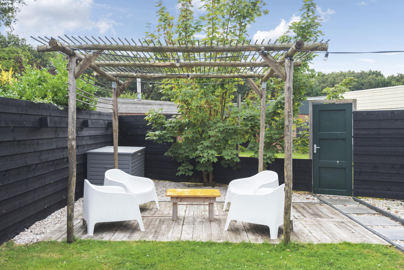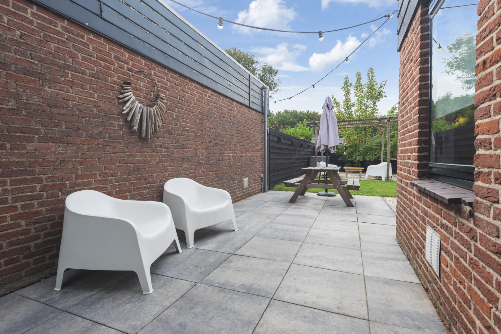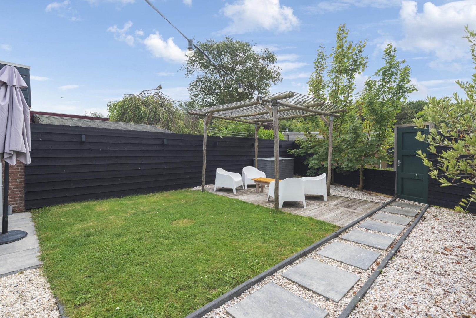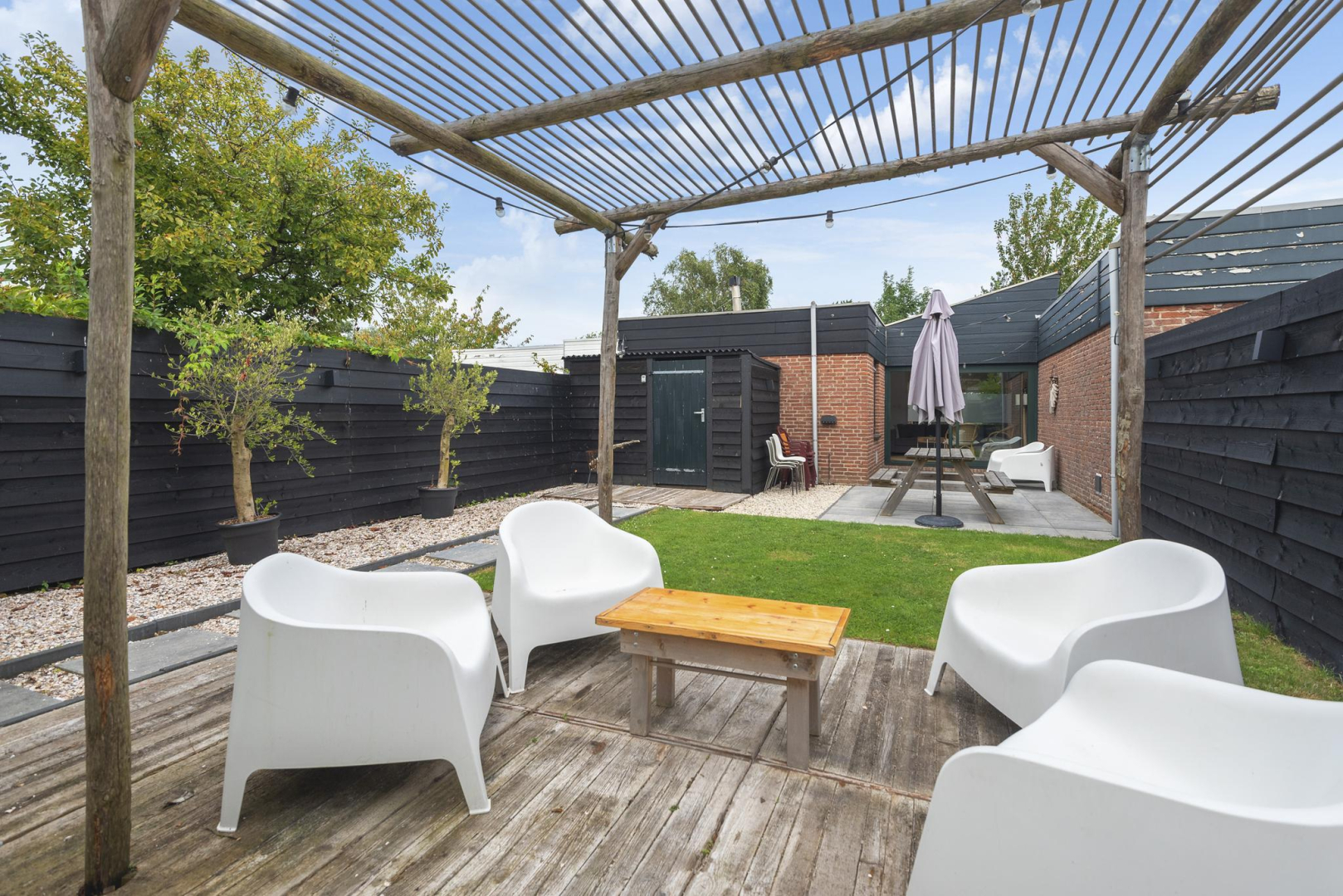 Tuin: De op het zuiden gelegen tuin is onderhoudsvriendelijk en biedt volop ruimte om buiten te ontspannen. Met twee terrassen, waarvan één met een patio, kunt u verschillende zitplekken creëren. De tuin beschikt verder over een praktische houten berging en een achterom en dankzij de beschutte ligging geniet u hier van optimale privacy.