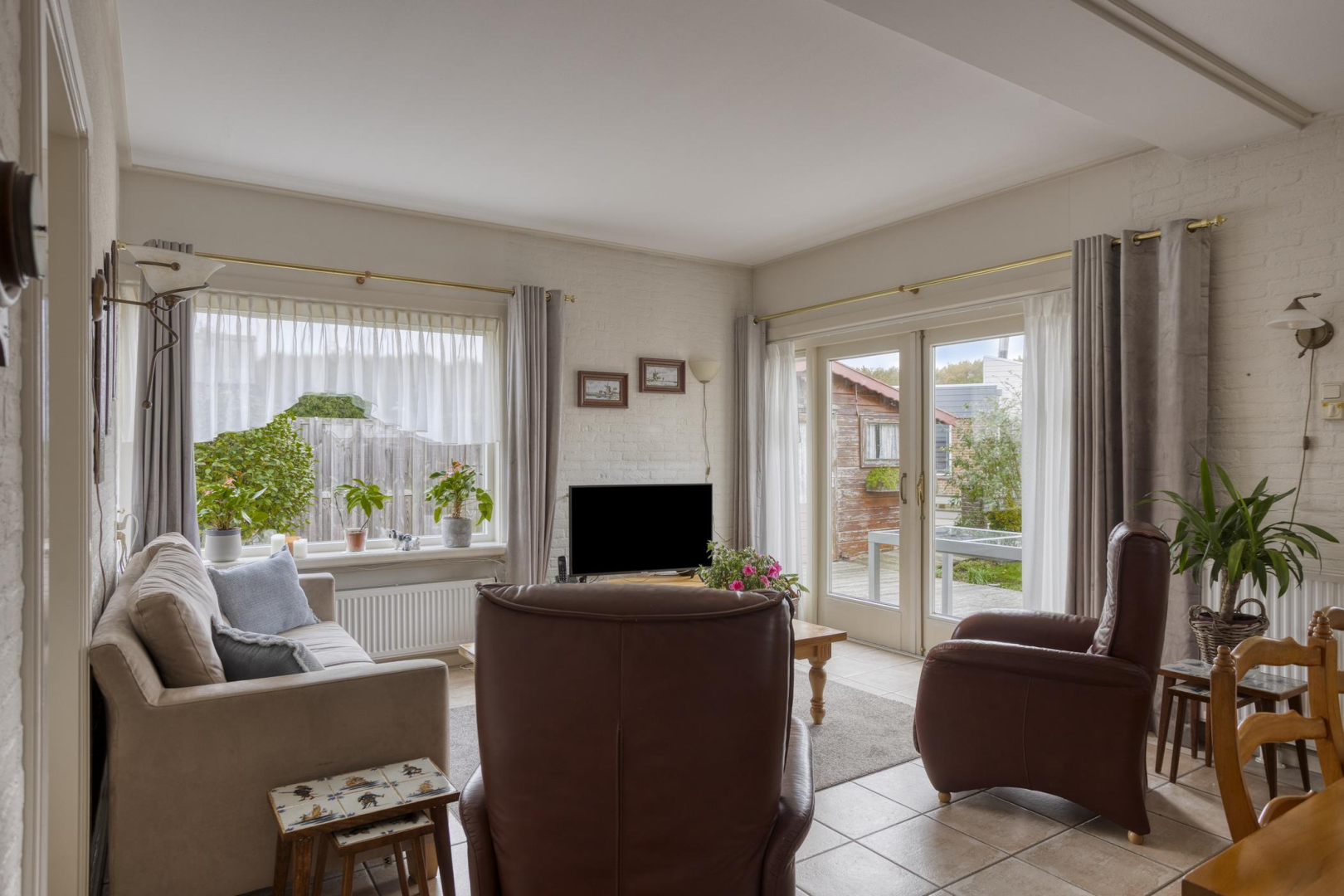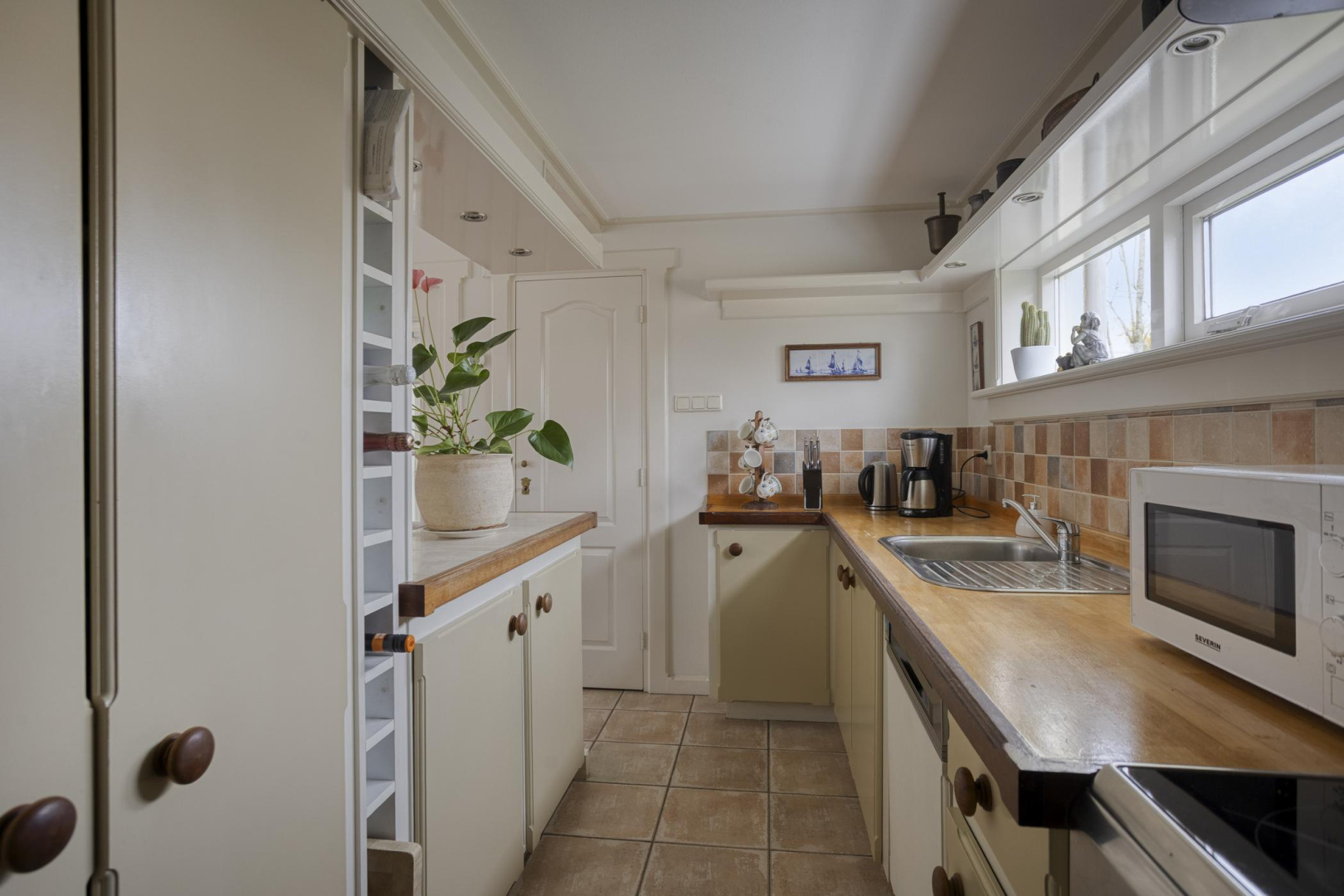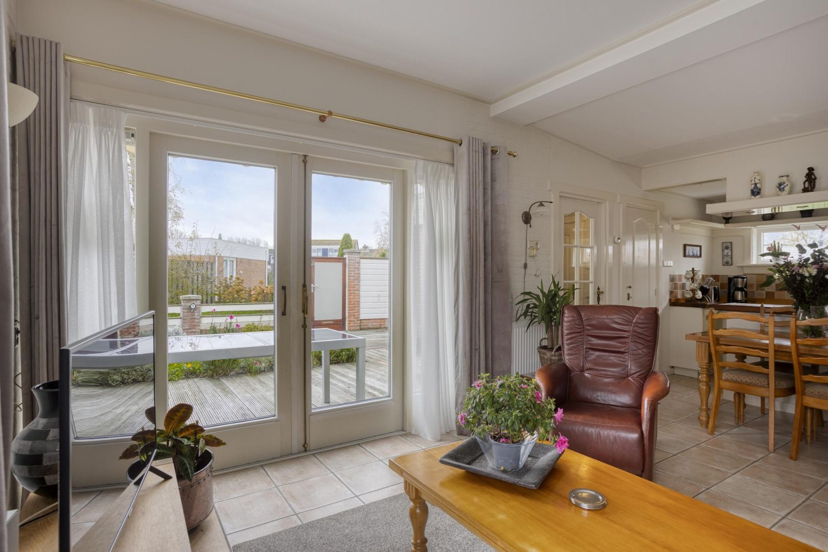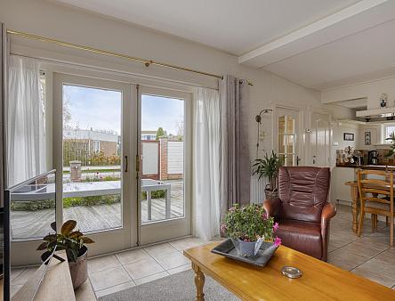 Entree, hal met praktische bergkast met opstelling Cv-ketel en aansluitingen voor was- en droogapparatuur. De woning heeft een lichte woonkamer met grote raampartij en openslaande deuren naar de tuin met elektrisch zonnescherm. De halfopen keuken is praktisch ingericht met veel kastruimte en voorzien van losse apparatuur w.o. een vaatwasser en gasfornuis. Verder is er een badkamer met een douchecabine, een wastafelmeubel en een toilet. De woning beschikt over twee comfortabele slaapkamers, beide voorzien van een vaste kast. Vanuit één van de slaapkamers is er directe toegang tot de fraai onderhouden tuin. In de woning ligt een plavuizen vloer, met uitzondering van de slaapkamers.