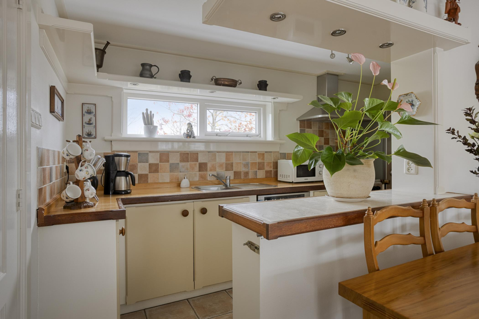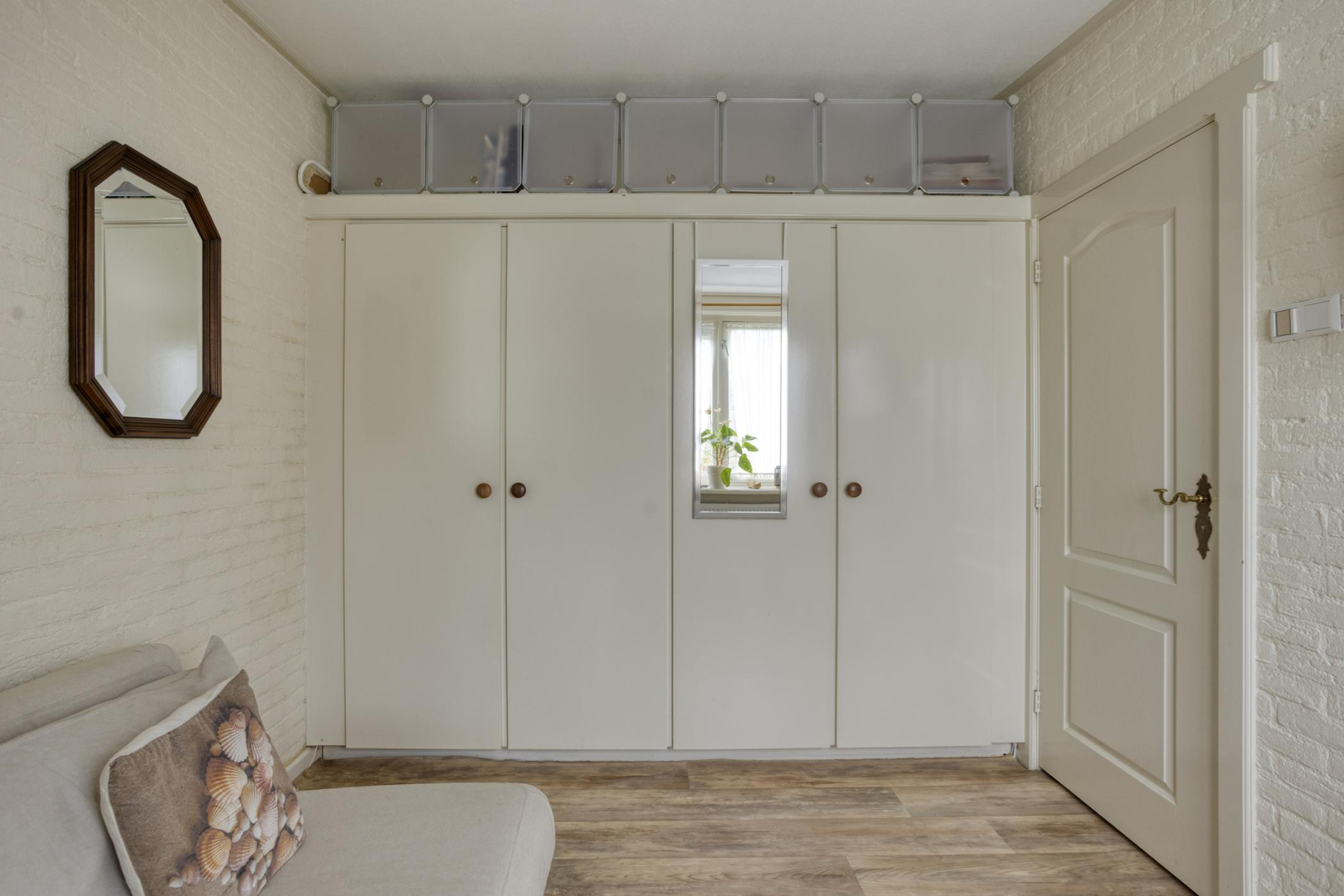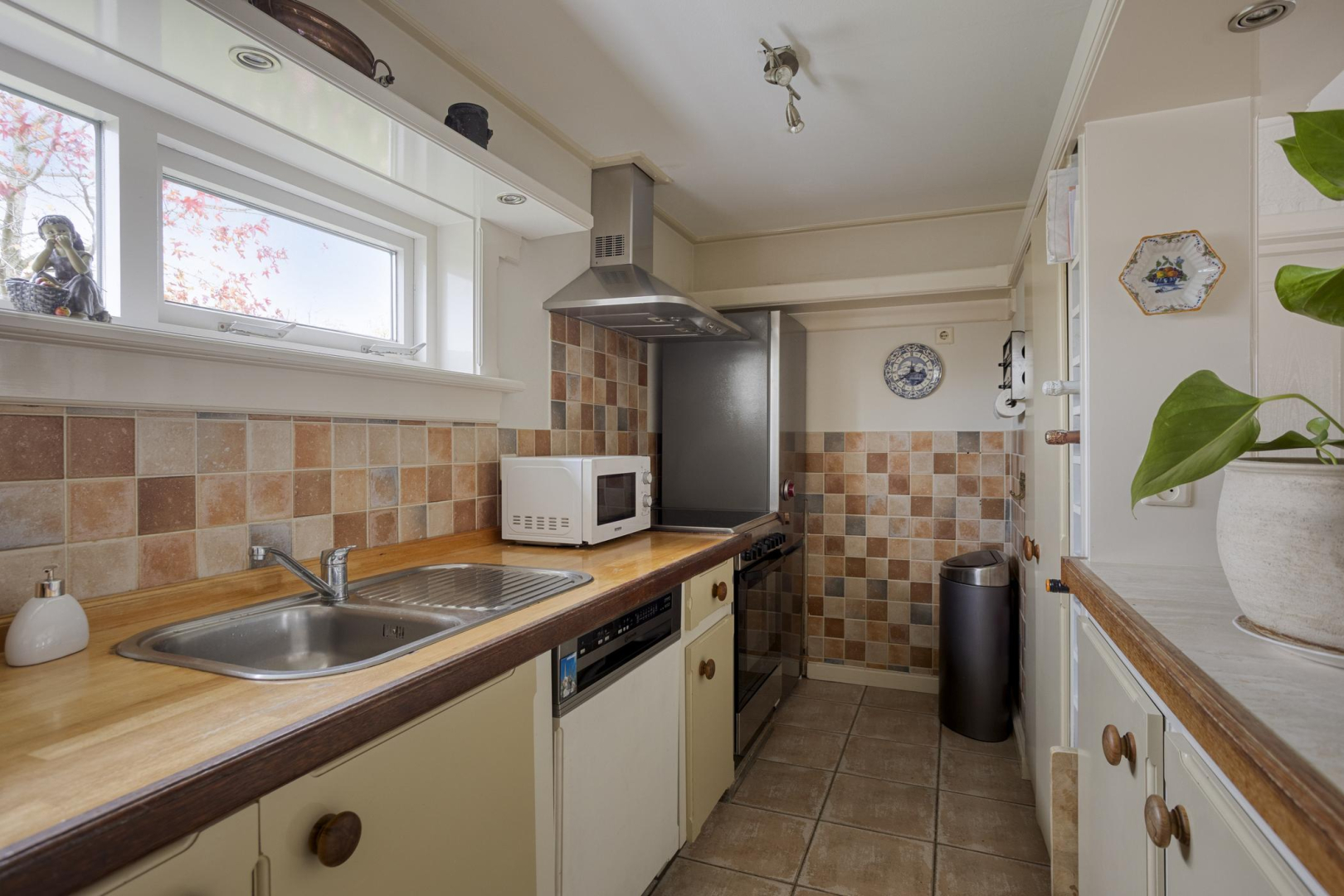 Entree, hal met praktische bergkast met opstelling Cv-ketel en aansluitingen voor was- en droogapparatuur. De woning heeft een lichte woonkamer met grote raampartij en openslaande deuren naar de tuin met elektrisch zonnescherm. De halfopen keuken is praktisch ingericht met veel kastruimte en voorzien van losse apparatuur w.o. een vaatwasser en gasfornuis. Verder is er een badkamer met een douchecabine, een wastafelmeubel en een toilet. De woning beschikt over twee comfortabele slaapkamers, beide voorzien van een vaste kast. Vanuit één van de slaapkamers is er directe toegang tot de fraai onderhouden tuin. In de woning ligt een plavuizen vloer, met uitzondering van de slaapkamers.