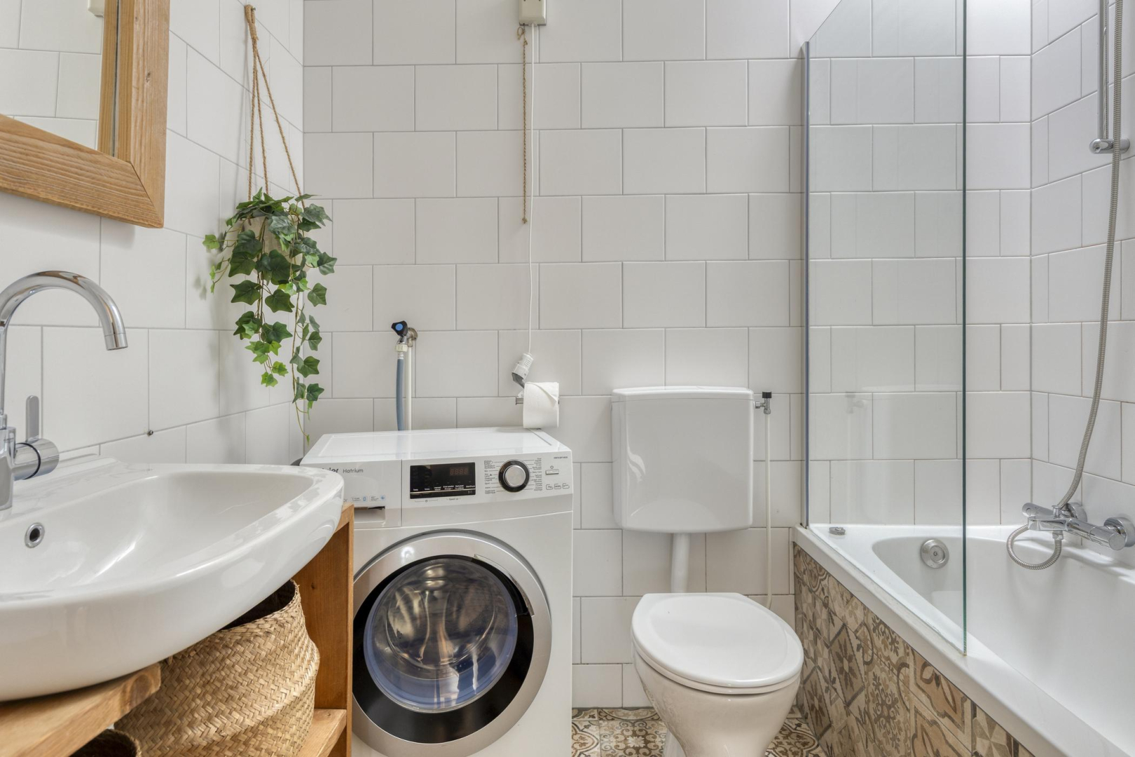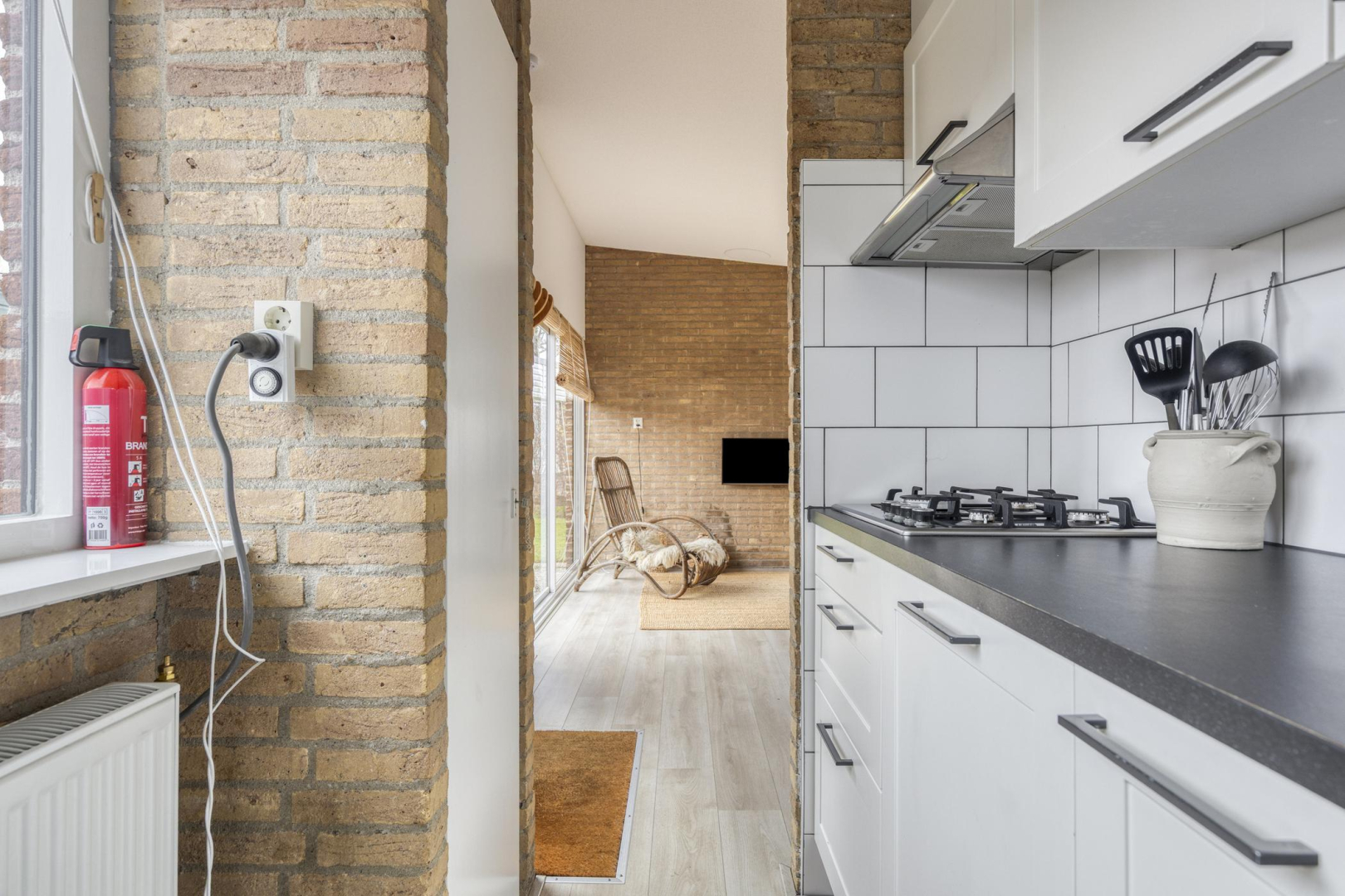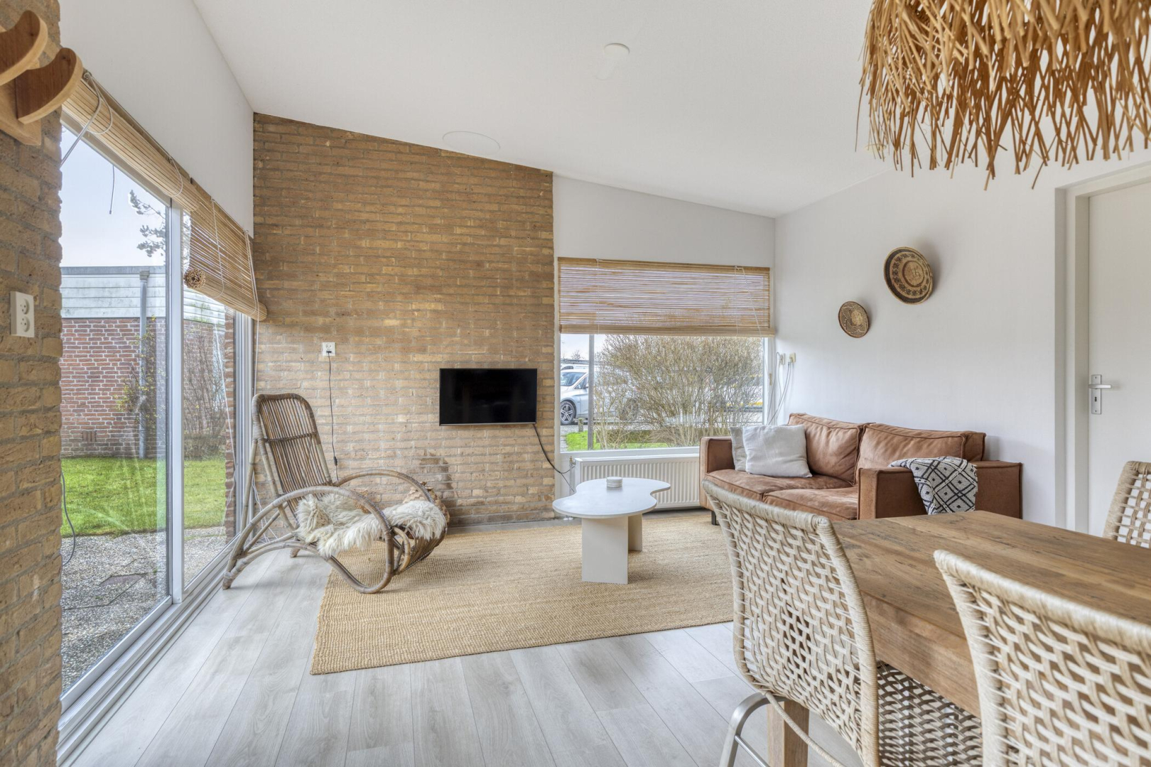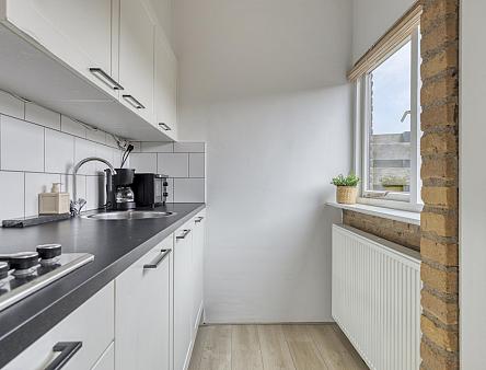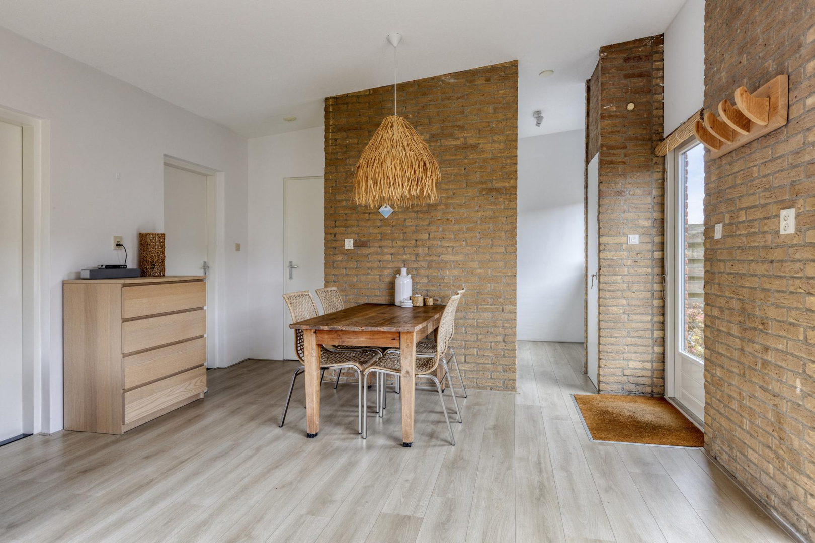 Via de entree komt u direct binnen in de lichte woon-/eetkamer, waar de open en praktische indeling direct opvalt. De ruimte biedt plaats aan zowel een comfortabele zithoek als een eettafel en wordt gekenmerkt door veel daglicht dankzij de grote raampartijen. De woonkamer is gesitueerd aan de tuinzijde en beschikt over een schuifpui die directe toegang geeft tot het terras, waardoor binnen en buiten op een natuurlijke manier in elkaar overlopen. Aansluitend bevindt zich de halfopen keuken, die praktisch is ingericht en voorzien van diverse inbouwapparatuur, met voldoende werkblad- en kastruimte en een raam voor natuurlijke lichtinval. Via de woonkamer zijn de twee comfortabele slaapkamers en de badkamer bereikbaar. De badkamer is voorzien van een ligbad met douche, een wastafelmeubel, een toilet, een wasmachineaansluiting en een dakraam dat zorgt voor prettig daglicht. De combinatie van lichte afwerkingen, karaktervolle bakstenen wanden en natuurlijke materialen zorgt voor een warme, eigentijdse uitstraling en een aangenaam ruimtelijk gevoel.