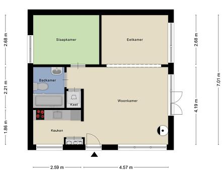 Entree, half open keuken met 4-pits gaskookplaat, afzuigkap, inbouw koelkast, meterkast, lichte woonkamer met plavuizen vloer, praktische bergkast met opstelplaats voor cv combi ketel (2009) en openslaande deuren naar de tuin. De badkamer is voorzien van een douche/bad, wastafel, toilet en aansluiting voor de wasmachine. Vanuit de woonkamer toegang tot de slaapkamer. Een tweede slaapkamer is vrij eenvoudig te realiseren.