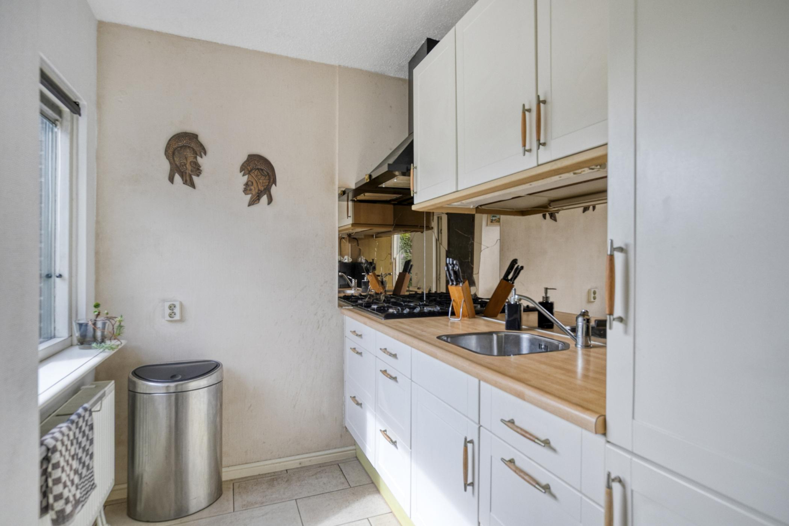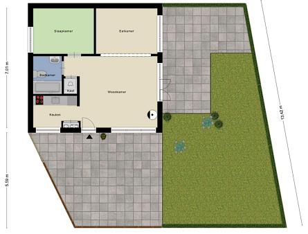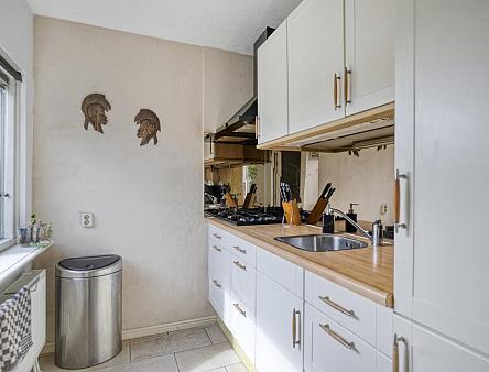 Entree, half open keuken met 4-pits gaskookplaat, afzuigkap, inbouw koelkast, meterkast, lichte woonkamer met plavuizen vloer, praktische bergkast met opstelplaats voor cv combi ketel (2009) en openslaande deuren naar de tuin. De badkamer is voorzien van een douche/bad, wastafel, toilet en aansluiting voor de wasmachine. Vanuit de woonkamer toegang tot de slaapkamer. Een tweede slaapkamer is vrij eenvoudig te realiseren.