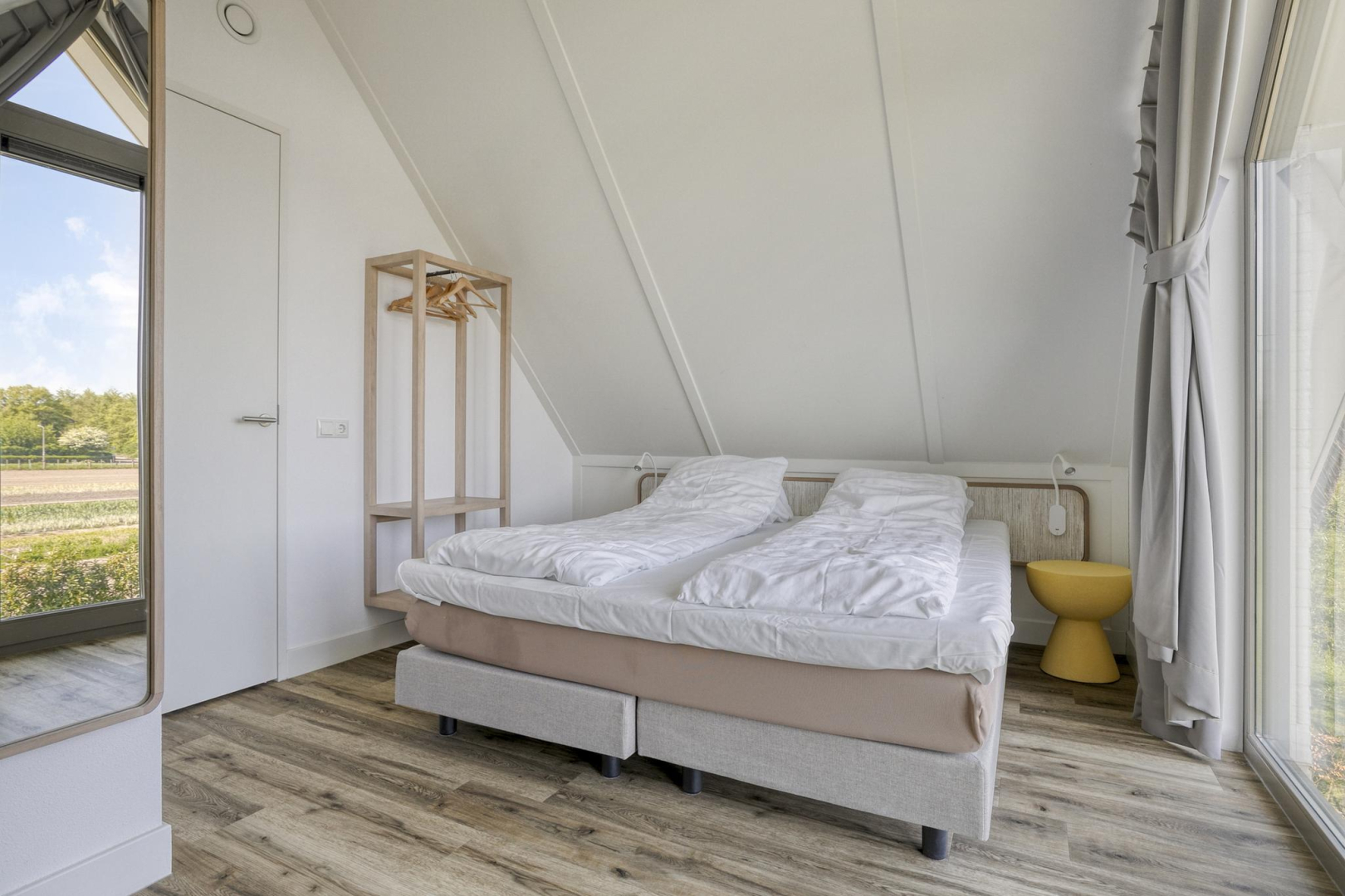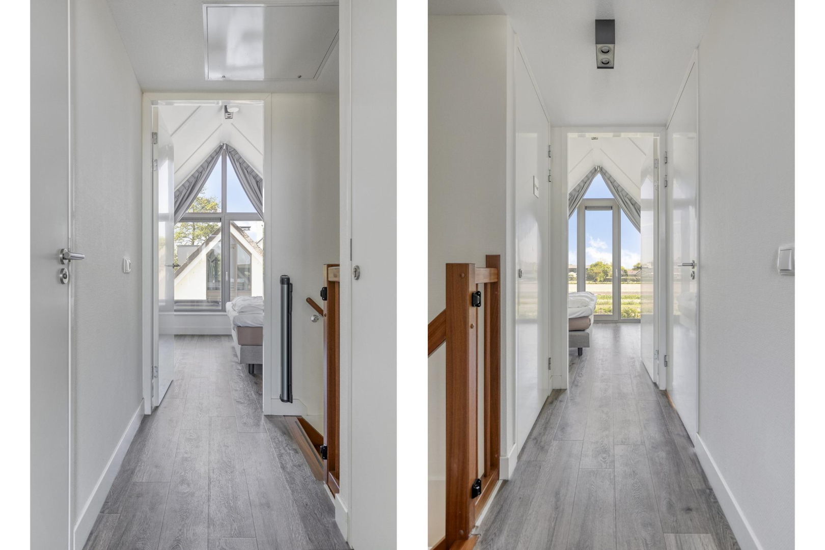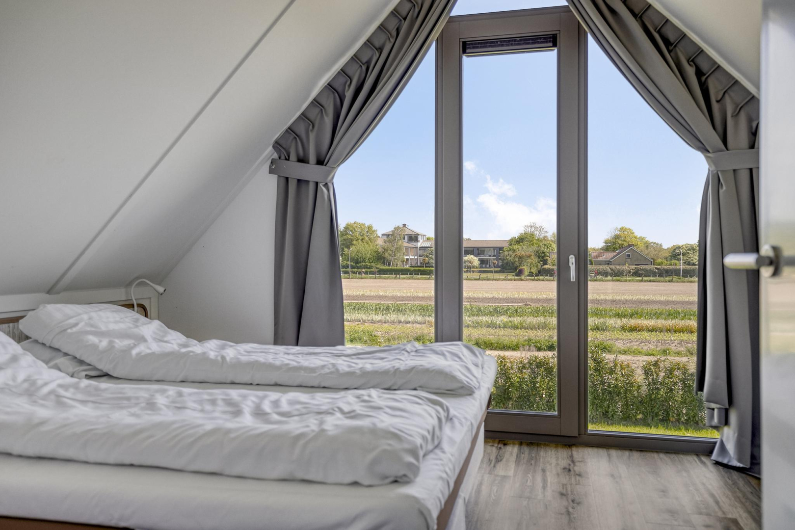 Overloop met berging, welke toegang geeft tot de luxe badkamer, twee ruime slaapkamers met kiepraam. De slaapkamer aan de achterzijde heeft een weids uitzicht over de bollenvelden. De luxe badkamer is voorzien van een sauna, douche, 2e toilet en 2 losse wastafels. Op de gehele verdieping ligt een PVC vloer, op de badkamer na, hier ligt een tegelvloer.