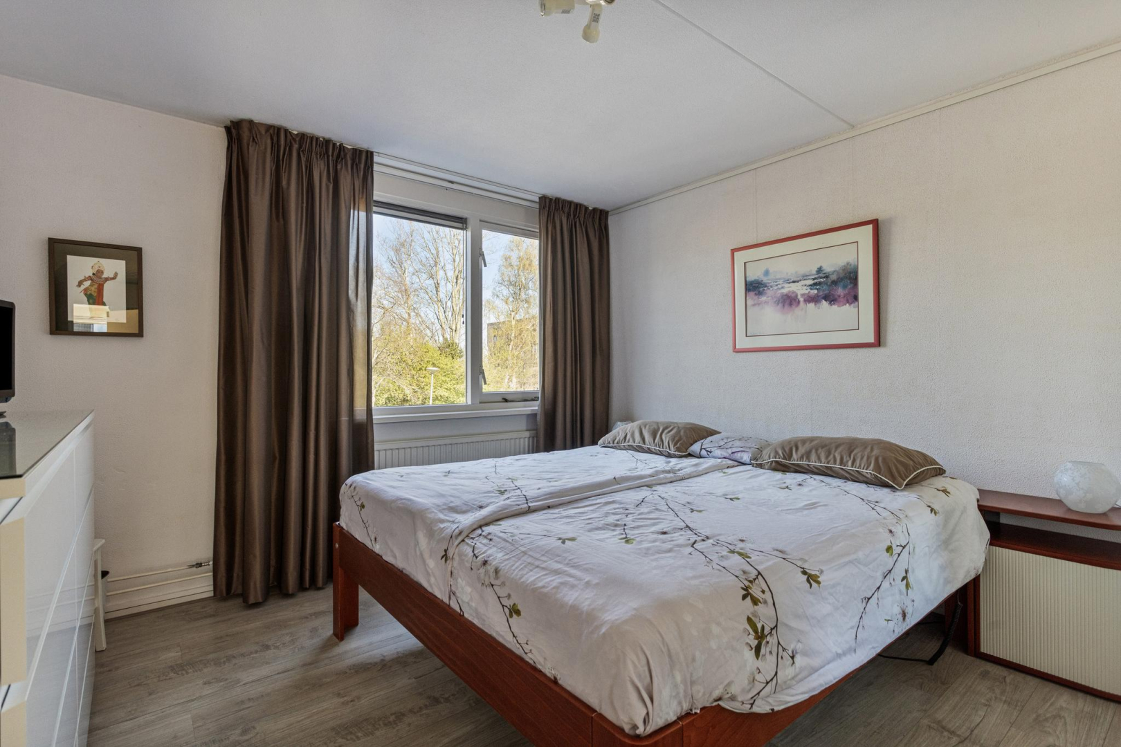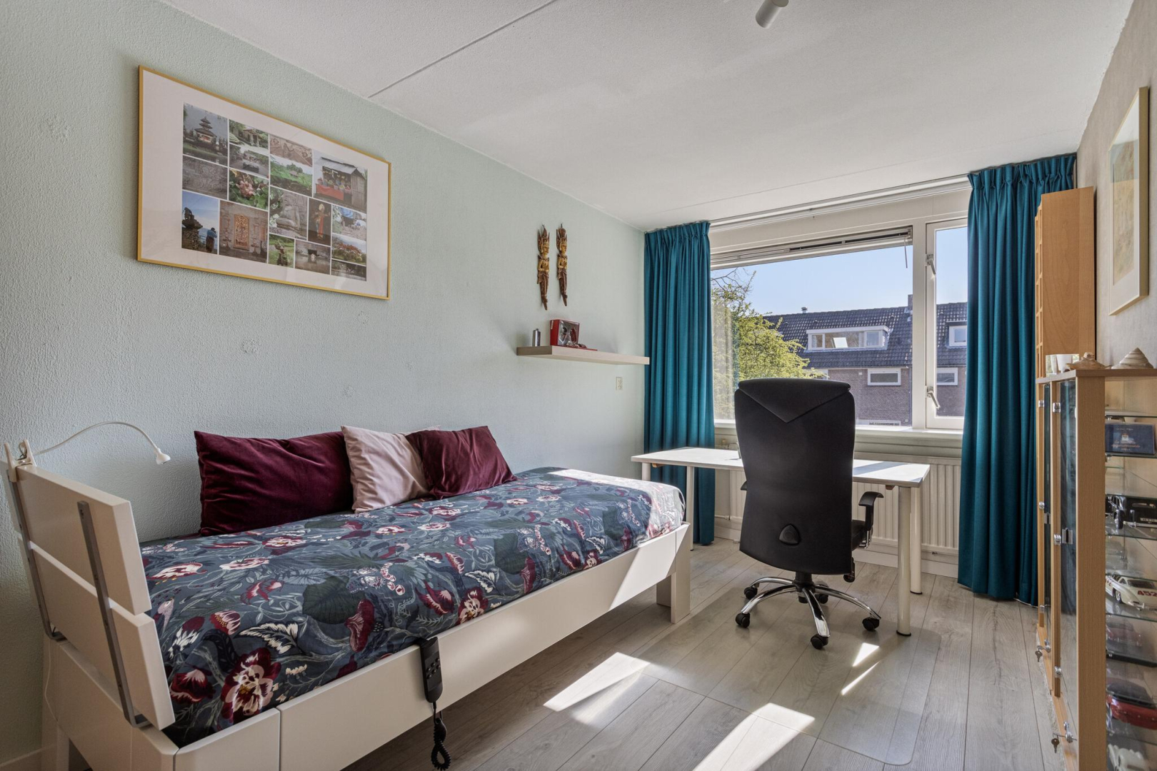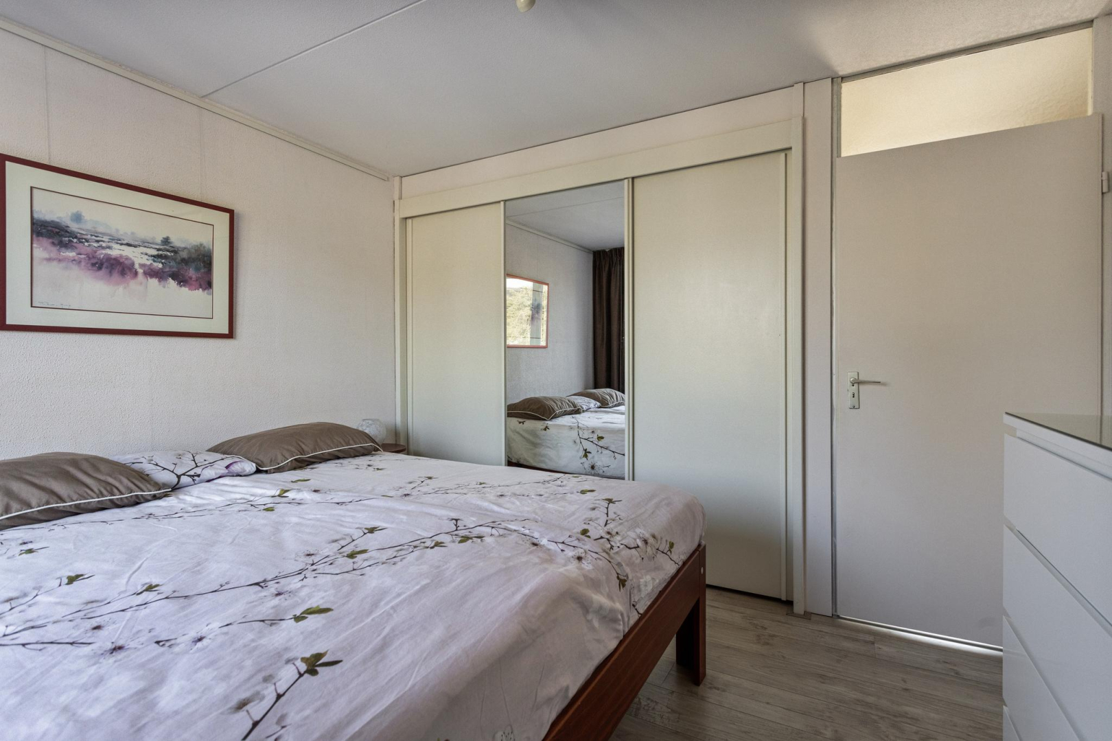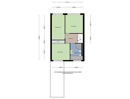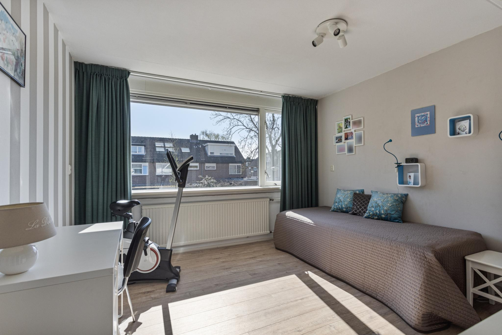 Overloop, ruime slaapkamer aan de voorzijde met vaste kastenwand en elektrisch bedienbaar rolluik. De royale badkamer is voorzien van een ligbad, wandcloset, wastafelmeubel en douche. Aan de achterzijde van de woning bevinden zich nog 2 ruime slaapkamers die net als de andere slaapkamer zijn voorzien van een laminaatvloer in houtlook met V-groef.