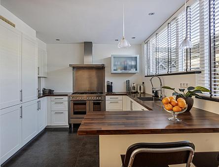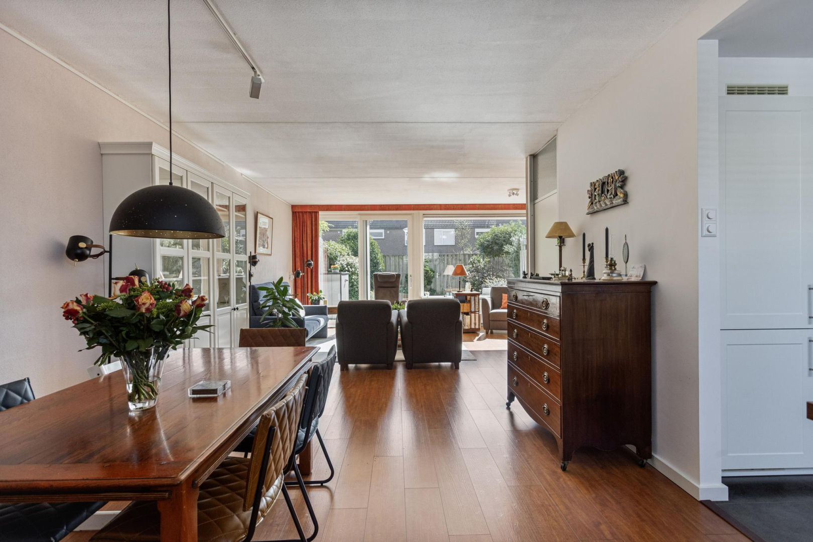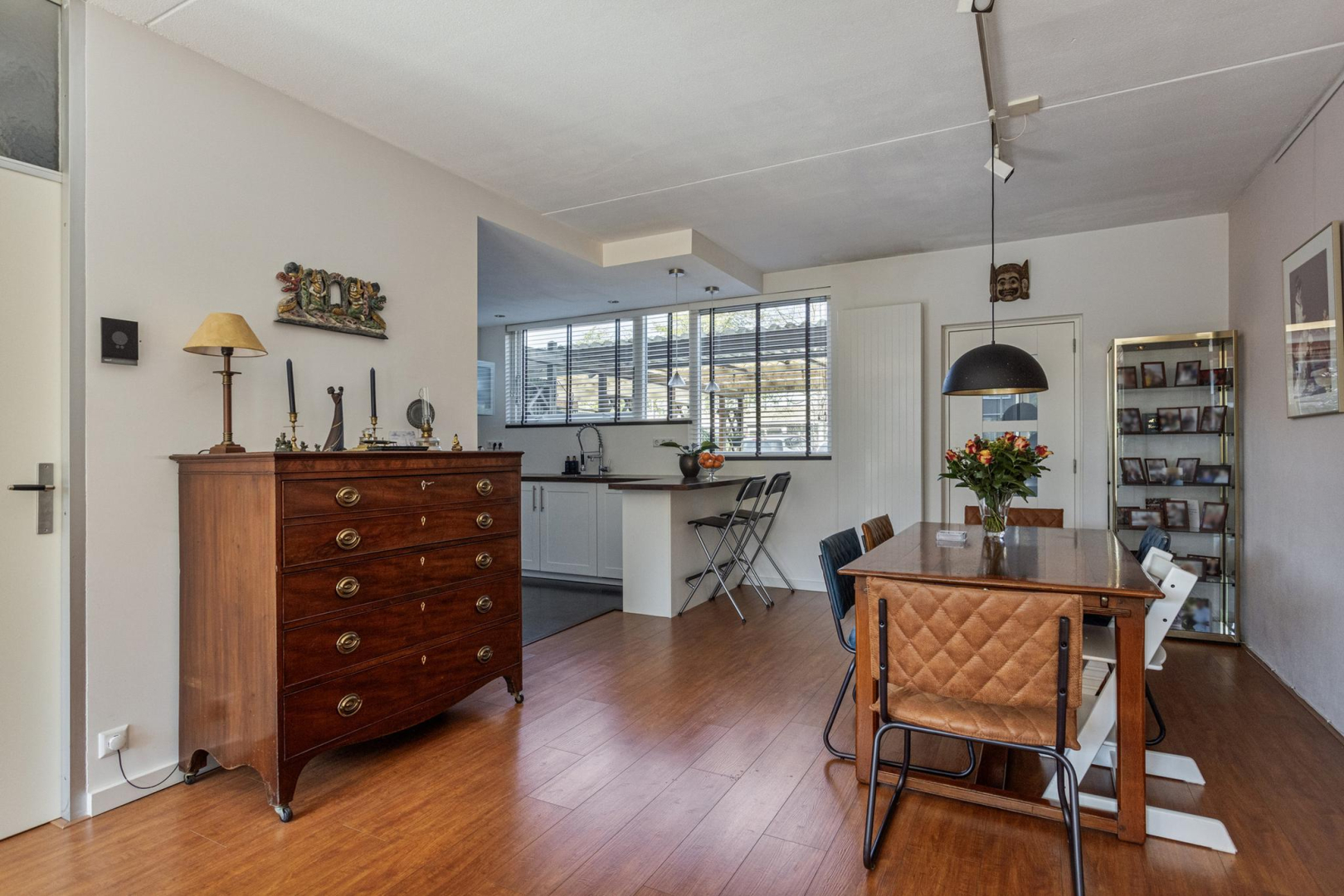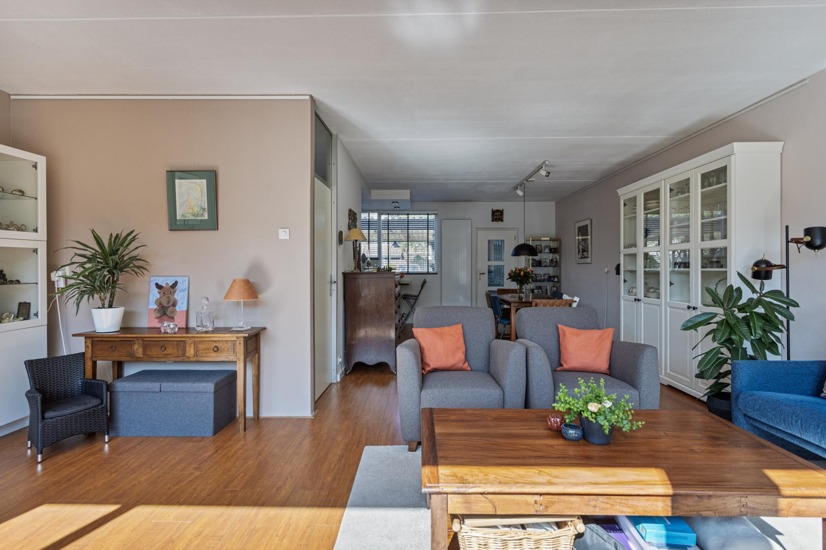 Entree, ruime hal met garderobe, meterkast en toilet met wandcloset en fonteintje. De woonkamer is heerlijk ruim en licht door de grote raampartij en schuifpui naar de achtertuin. Moderne open keuken met lichte deuren en een houtlook aanrechtblad in een U-opstelling voorzien van een gezellige bar, een spoelgedeelte met vaatwasser, een riant fornuis met 6 gaspitten en een dubbele oven (waarvan één niet werkt), rvs-afzuigkap en een koel/vries combinatie. De achterwand van de keuken is van aluminium waardoor de achterwand makkelijk schoon te houden is. In de tussen hal met praktische trapkast bevindt zich de trap naar de 1e verdieping.