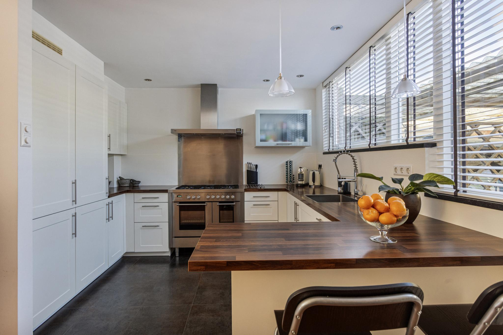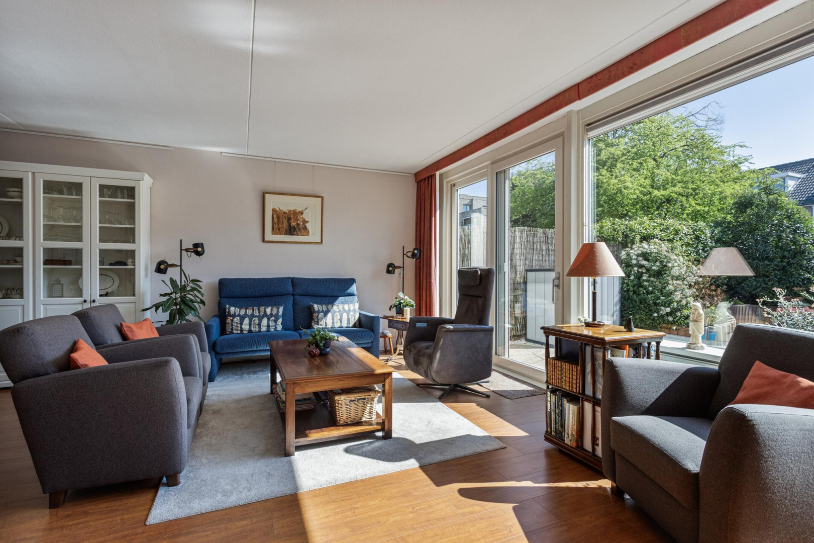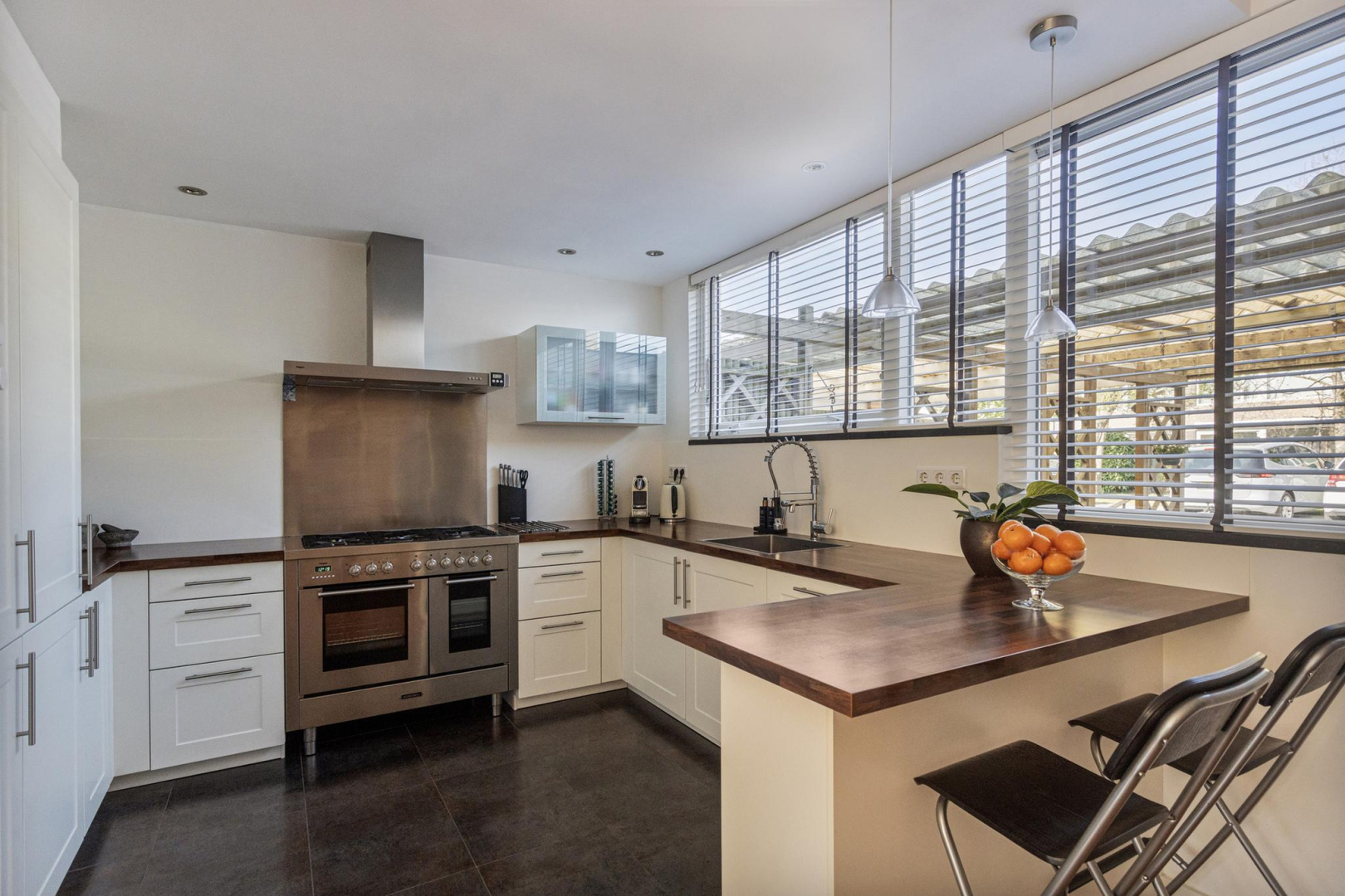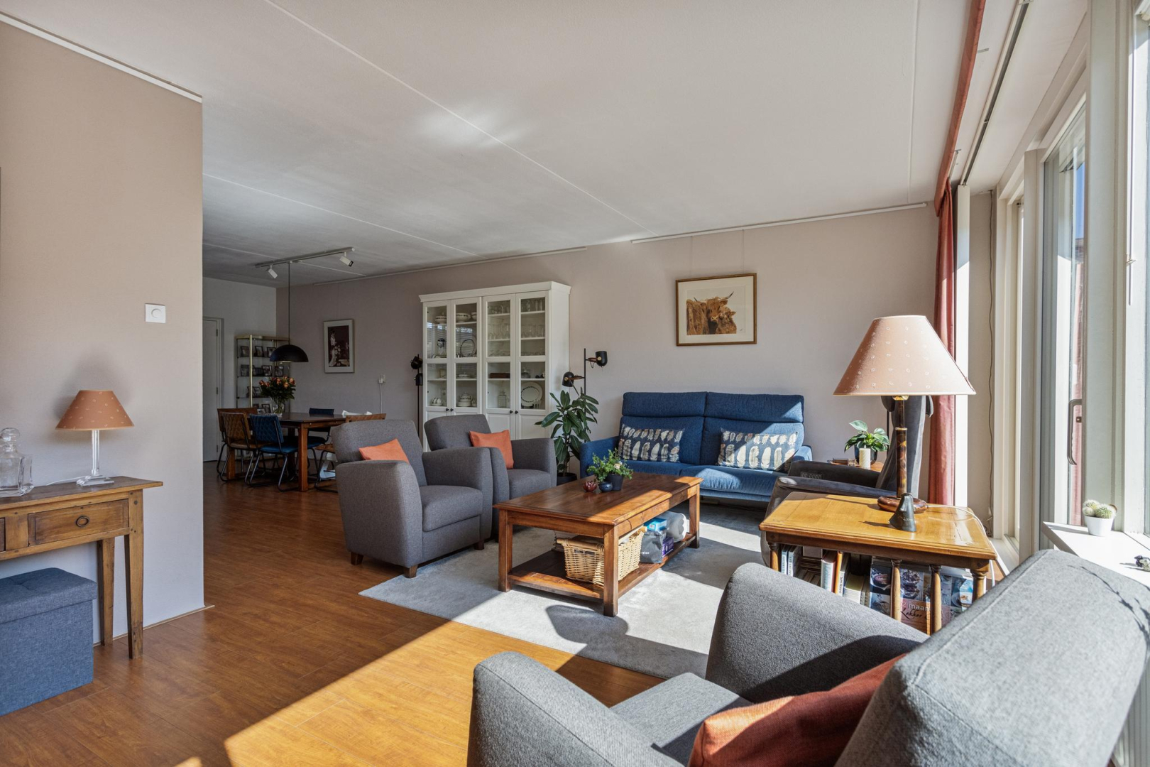 Entree, ruime hal met garderobe, meterkast en toilet met wandcloset en fonteintje. De woonkamer is heerlijk ruim en licht door de grote raampartij en schuifpui naar de achtertuin. Moderne open keuken met lichte deuren en een houtlook aanrechtblad in een U-opstelling voorzien van een gezellige bar, een spoelgedeelte met vaatwasser, een riant fornuis met 6 gaspitten en een dubbele oven (waarvan één niet werkt), rvs-afzuigkap en een koel/vries combinatie. De achterwand van de keuken is van aluminium waardoor de achterwand makkelijk schoon te houden is. In de tussen hal met praktische trapkast bevindt zich de trap naar de 1e verdieping.