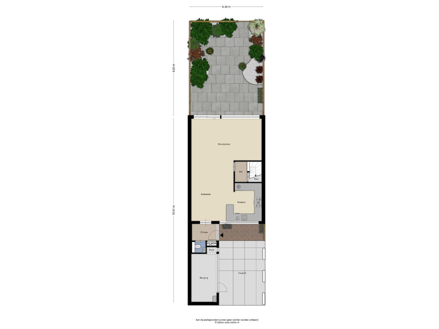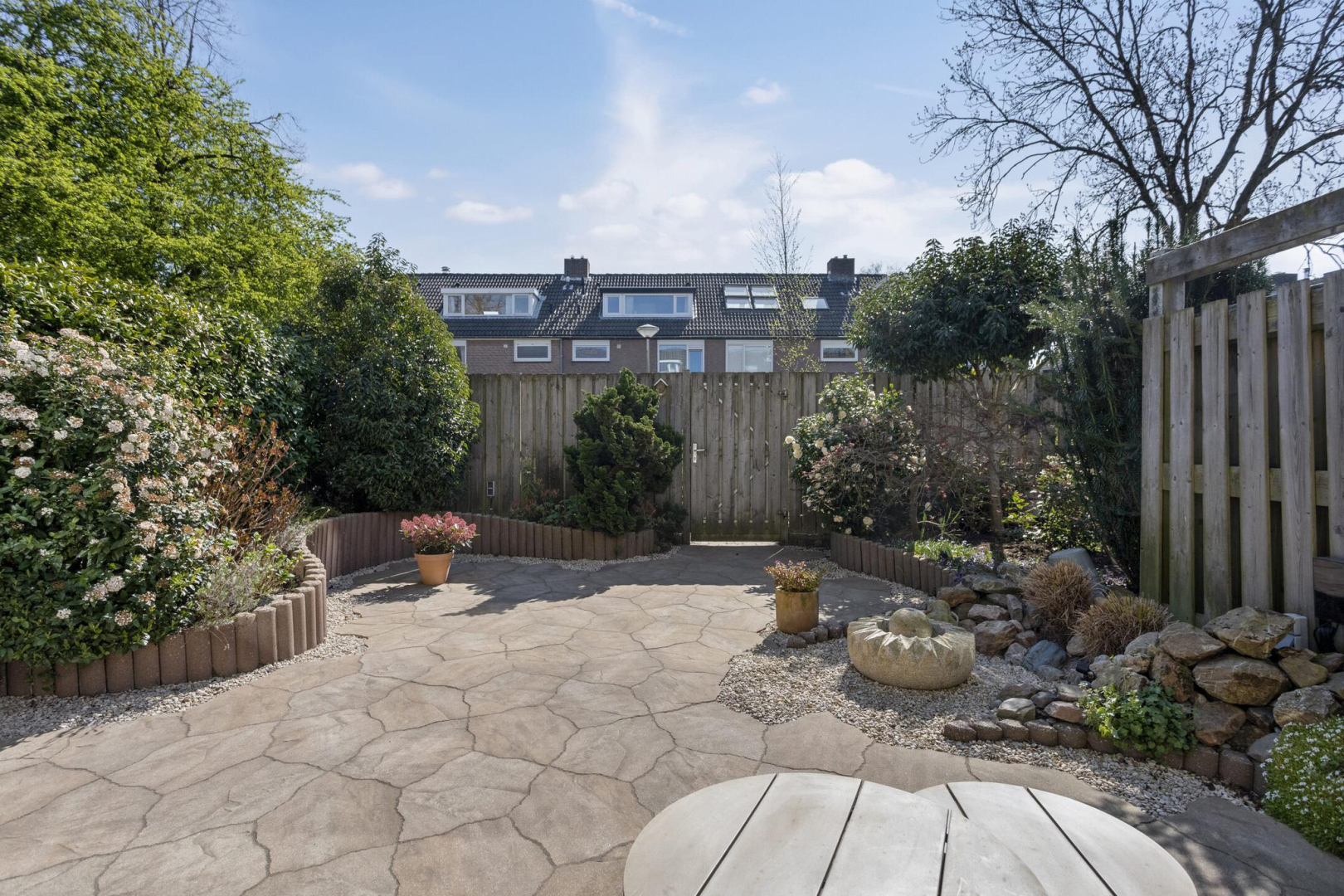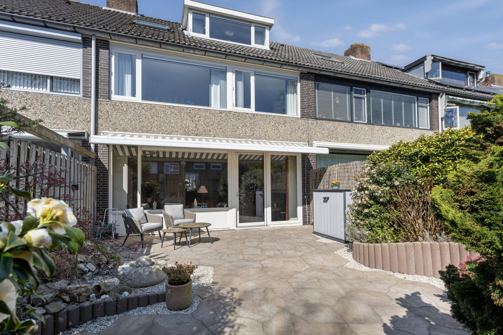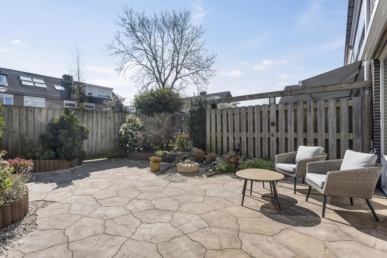 Ruime voortuin met stenen berging en carport. De berging is geïsoleerd en voorzien van elektra en water. De achtertuin is ingericht met groene planten in de borders, gecombineerd met lichte tegels met gedraineerde tegelvoegen. De achtertuin is lekker breed met een achterom en is zo gesitueerd dat u heerlijk van de zon kunt genieten.