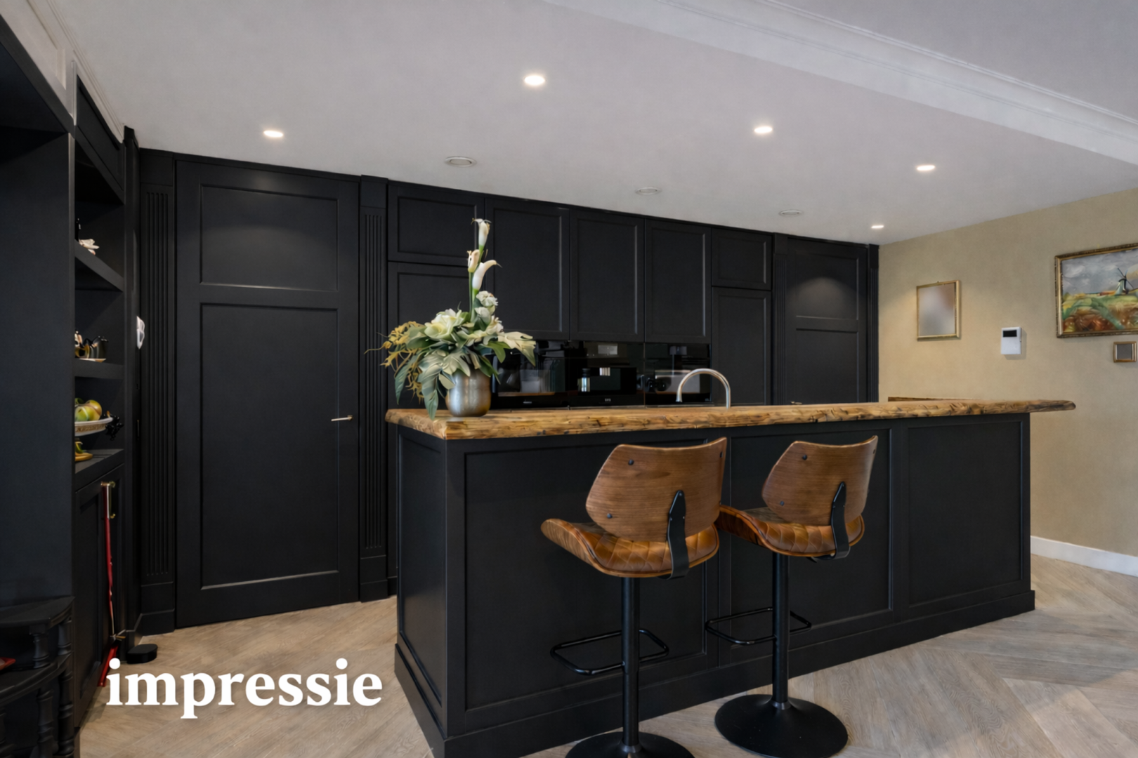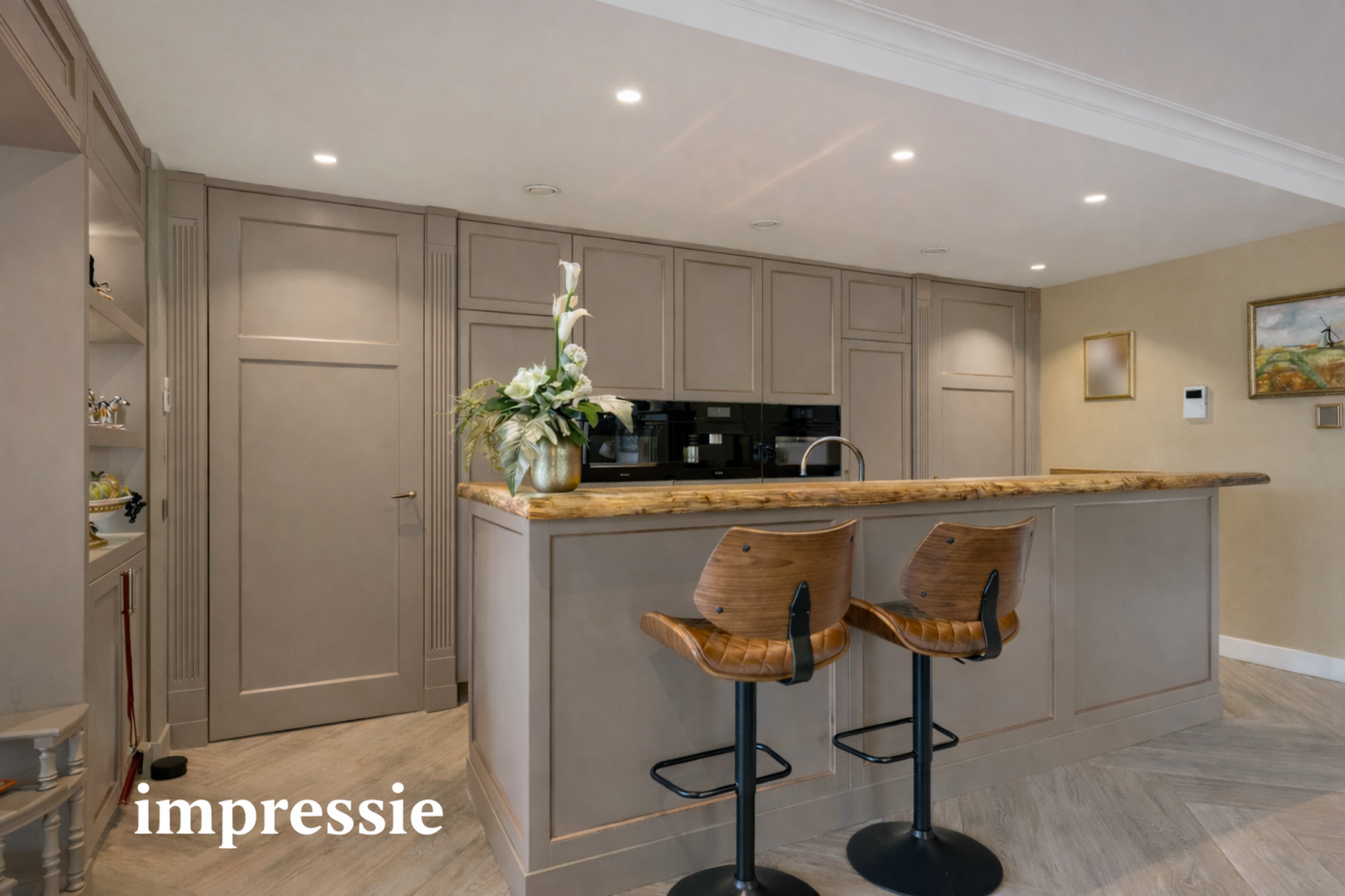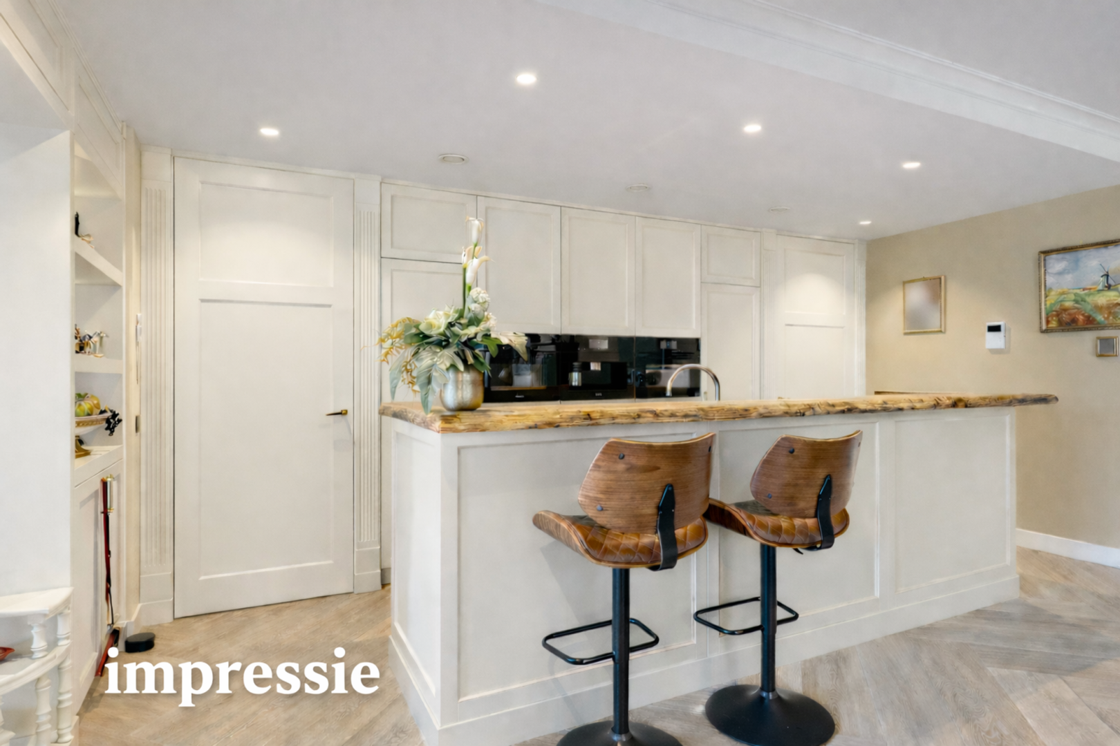 Vanuit de hal is de riante living met open keuken bereikbaar. De open indeling verbindt de op maat gemaakte keuken en eetkamer moeiteloos met de gezellige zitkamer. De volledig op maat ontworpen keuken vormt het hart van het appartement. Hoogwaardige materialen, een strakke afwerking en slimme indelingen zorgen voor comfort tijdens het bereiden van een heerlijke maaltijd. Het kook- en spoeleiland is afgewerkt met een hoogwaardig marmeren werkblad. Hier vindt u niet alleen een moderne inductiekookplaat, maar ook een geïntegreerd spoelgedeelte met Quooker-kraan (met heet, koud en bruisend water) en een ingebouwde Miele vaatwasser. Langs de wand is een op maat gemaakte en praktisch ingerichte kastenwand gerealiseerd. Deze biedt niet alleen veel opbergruimte, maar is ook uitgerust met luxe inbouwapparatuur van Miele, waaronder een stoomoven, combi-magnetron, koffiemachine, een grote koelkast en een aparte vriezer. Alles is perfect geïntegreerd, waardoor de keuken rust en overzicht uitstraalt. De leefruimte wordt deels gescheiden door de kastenwand langs het plafond en de wanden waardoor een gezellige zitkamer ontstaat. De kast is ontworpen om ruimte te benutten én te creëren. Geen loze hoeken, geen rommelige oplossingen, maar doordachte opbergmogelijkheden die bijdragen aan een opgeruimde en harmonieuze leefomgeving. Het ruime balkon is zowel vanuit de eetkamer als ook vanuit de zitkamer te bereiken.