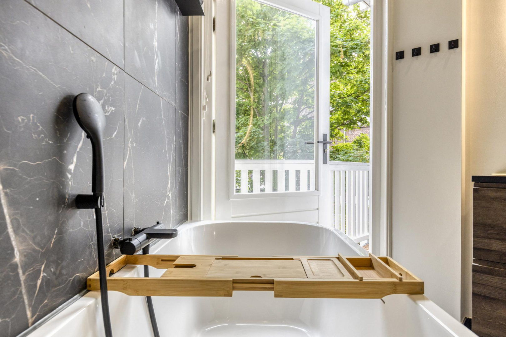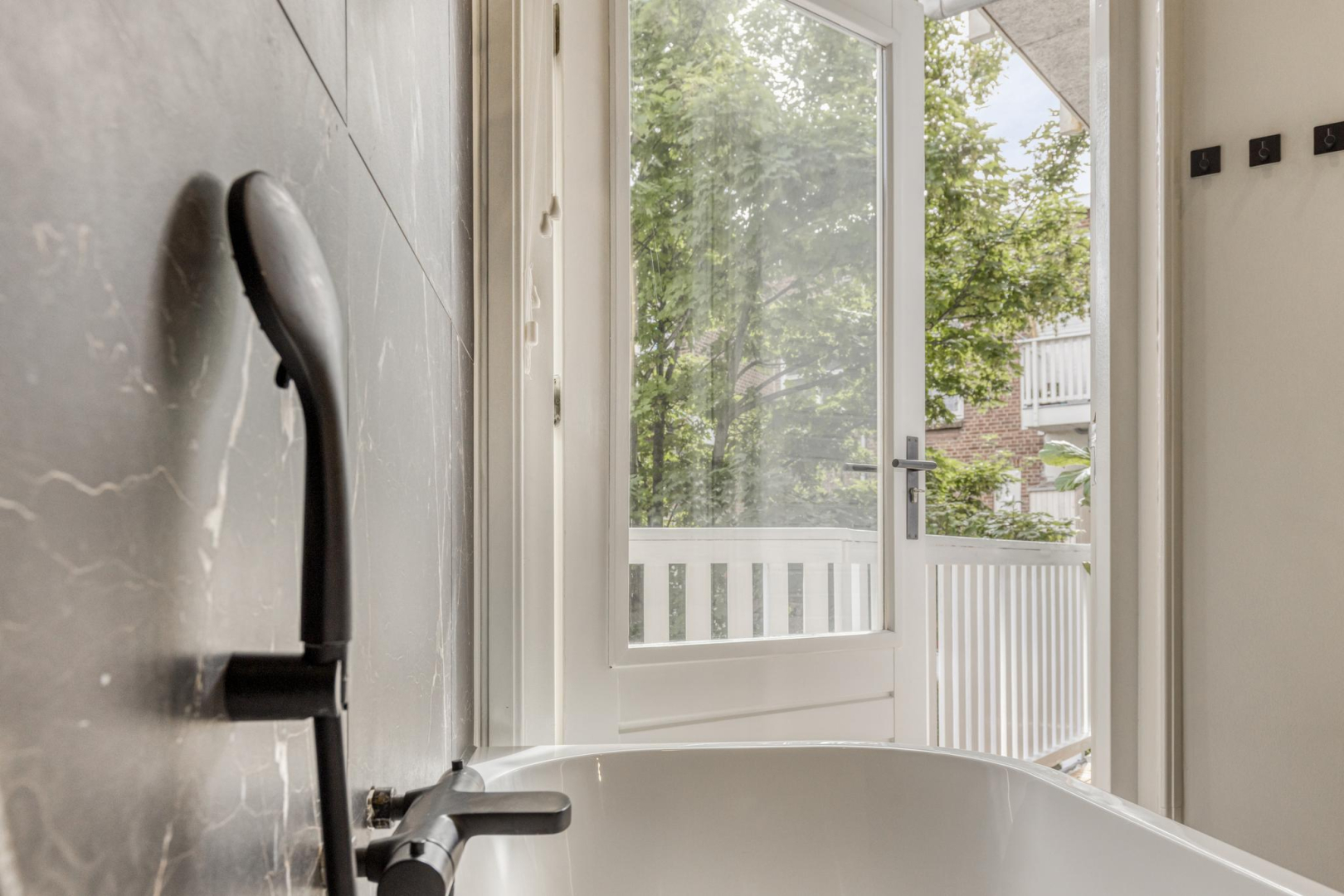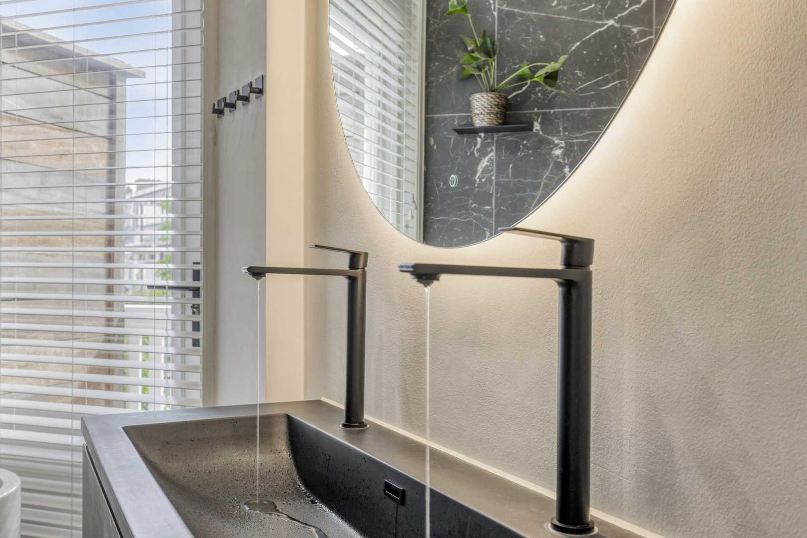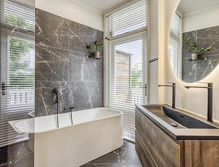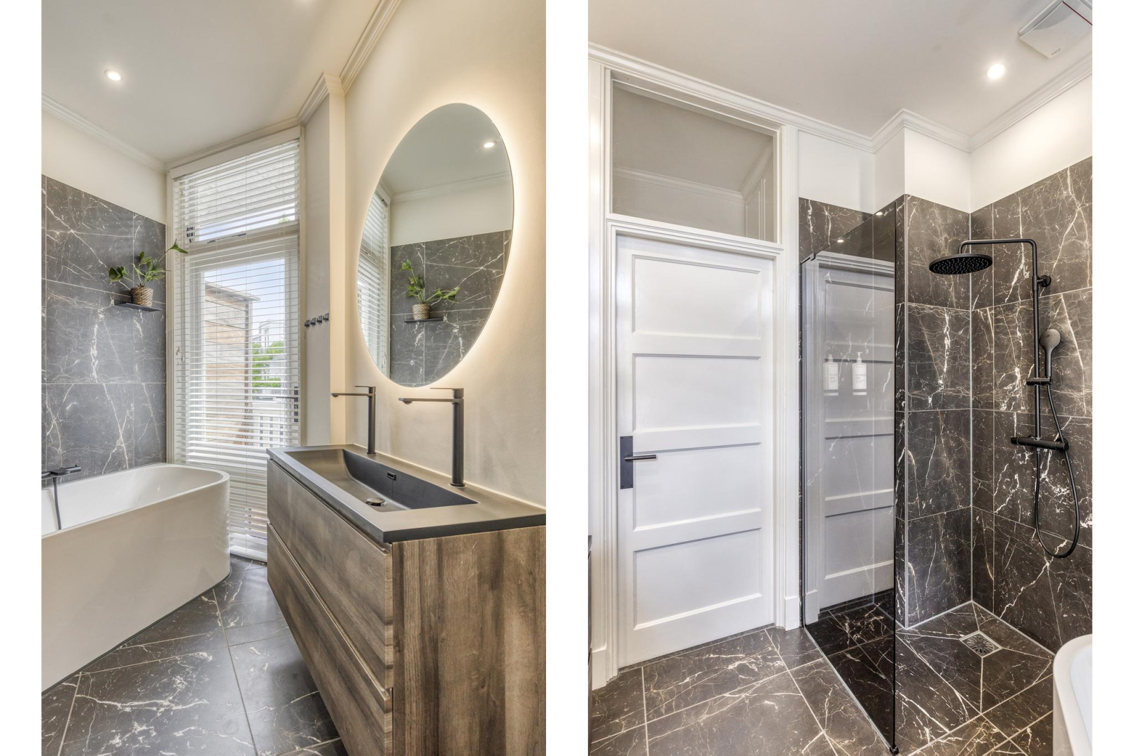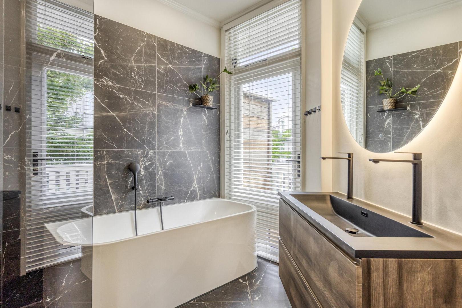 - Luxe badkamer voorzien van een royaal ligbad, inloop regendouche, wastafelmeubel met dubbele kraan, verwarmde spiegel met LED en toegang tot het balkon;