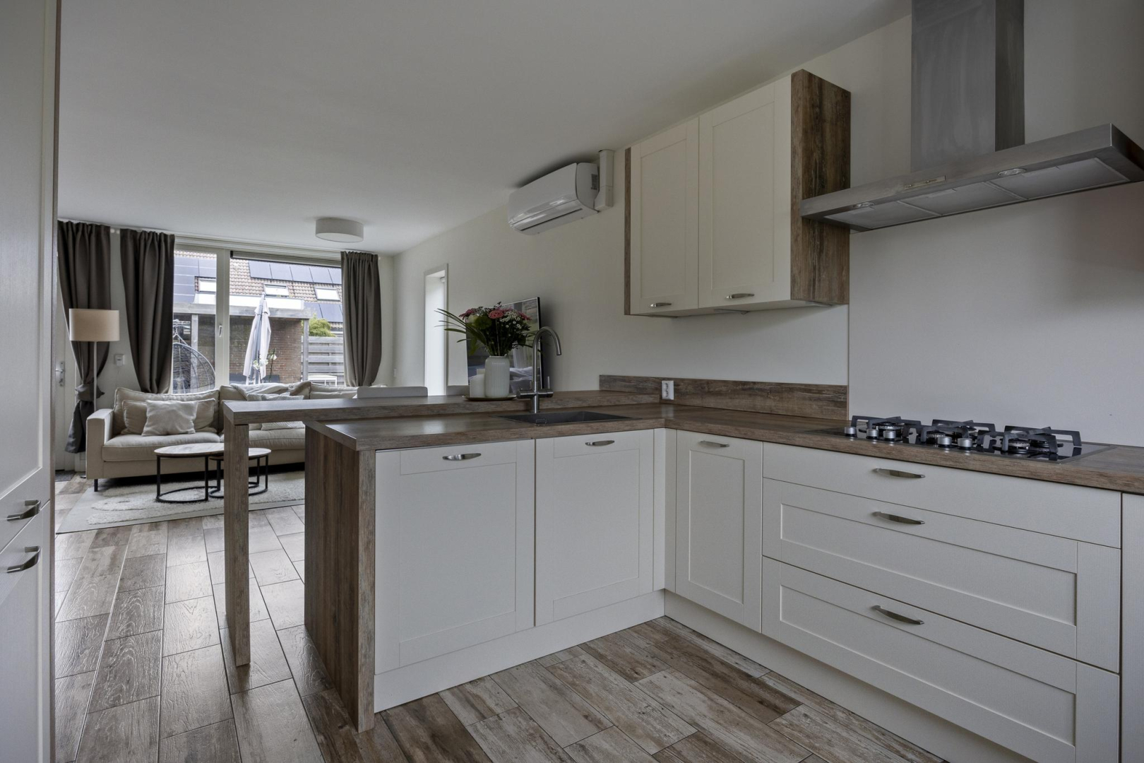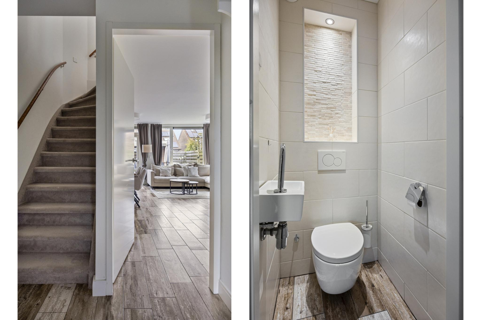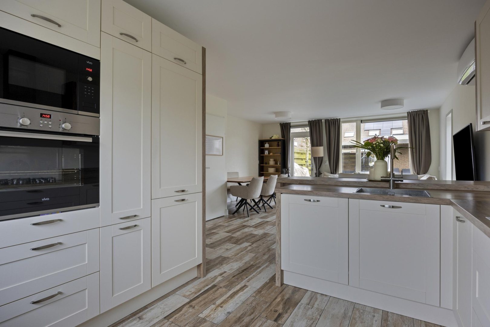 Entree, garderobe, meterkast, modern toilet met wandcloset en fonteintje. De woonkamer, met trapkast en airconditioning, is heerlijk licht door de grote raampartijen en deur naar de ruime achtertuin. Aan de voorzijde van de woning bevindt zich de open keuken in een U-opstelling welke van alle gemakken is voorzien zoals, een wijn klimaatkast, kokend water kraan, 5-pits gaskookplaat, rvs afzuigkap koel/vriescombinatie, magnetron, vaatwasser, oven en een fijne eetbar. De gehele begane grond is voorzien van een houtlook tegelvloer en vloerverwarming.