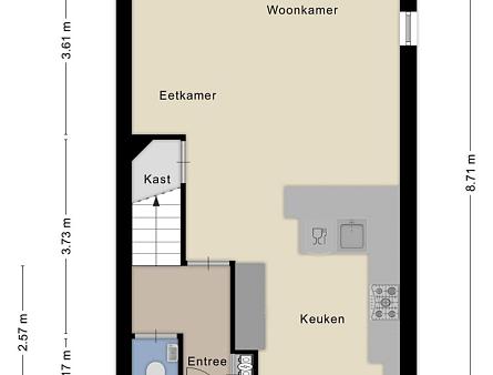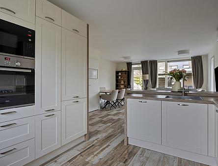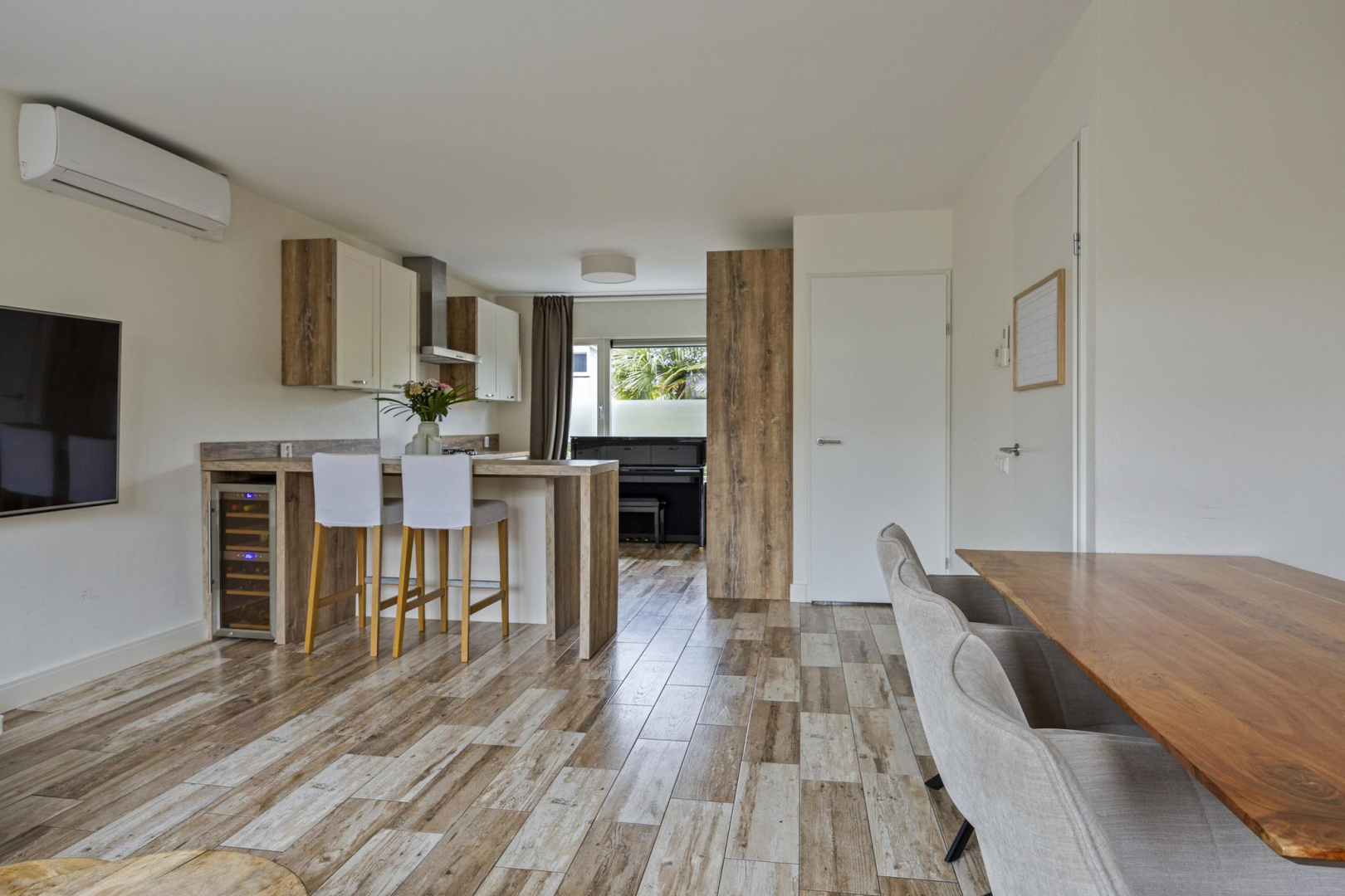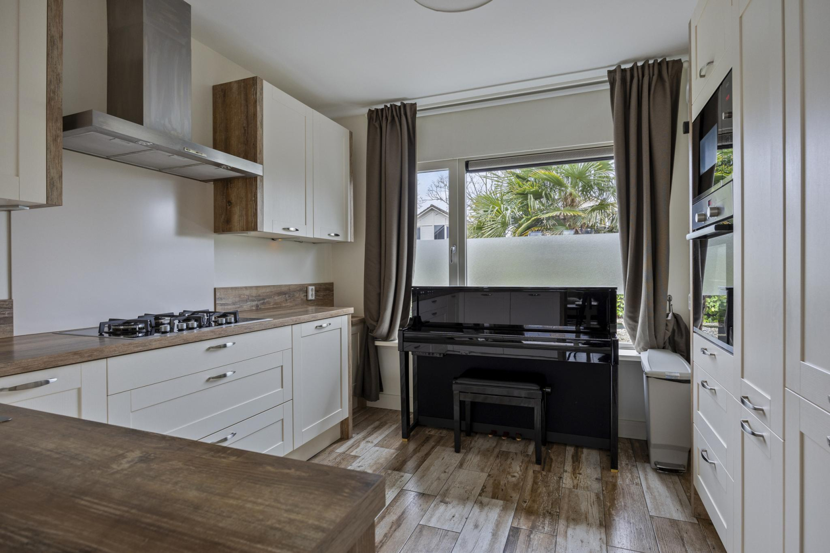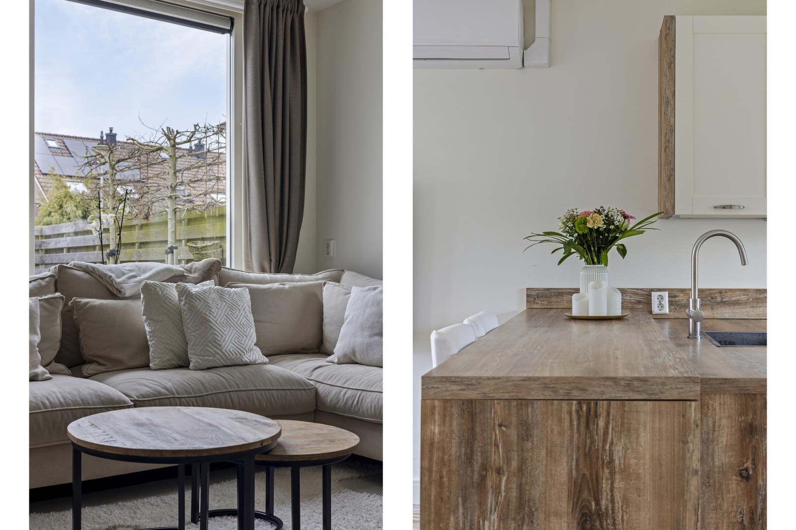 Entree, garderobe, meterkast, modern toilet met wandcloset en fonteintje. De woonkamer, met trapkast en airconditioning, is heerlijk licht door de grote raampartijen en deur naar de ruime achtertuin. Aan de voorzijde van de woning bevindt zich de open keuken in een U-opstelling welke van alle gemakken is voorzien zoals, een wijn klimaatkast, kokend water kraan, 5-pits gaskookplaat, rvs afzuigkap koel/vriescombinatie, magnetron, vaatwasser, oven en een fijne eetbar. De gehele begane grond is voorzien van een houtlook tegelvloer en vloerverwarming.