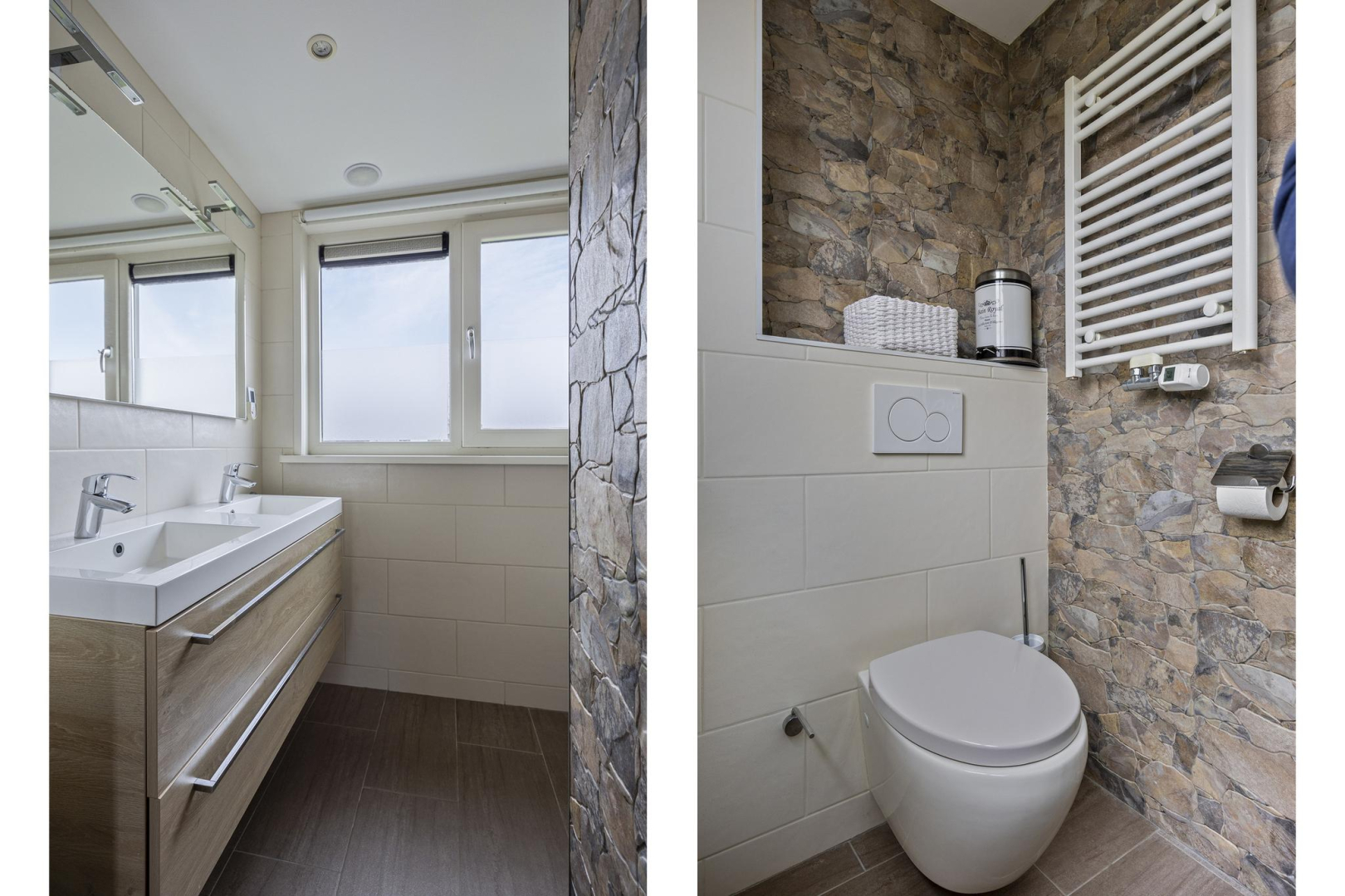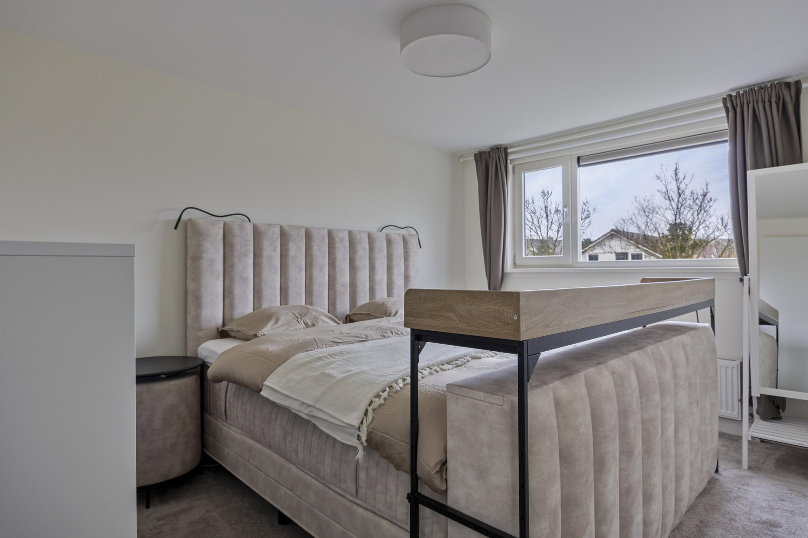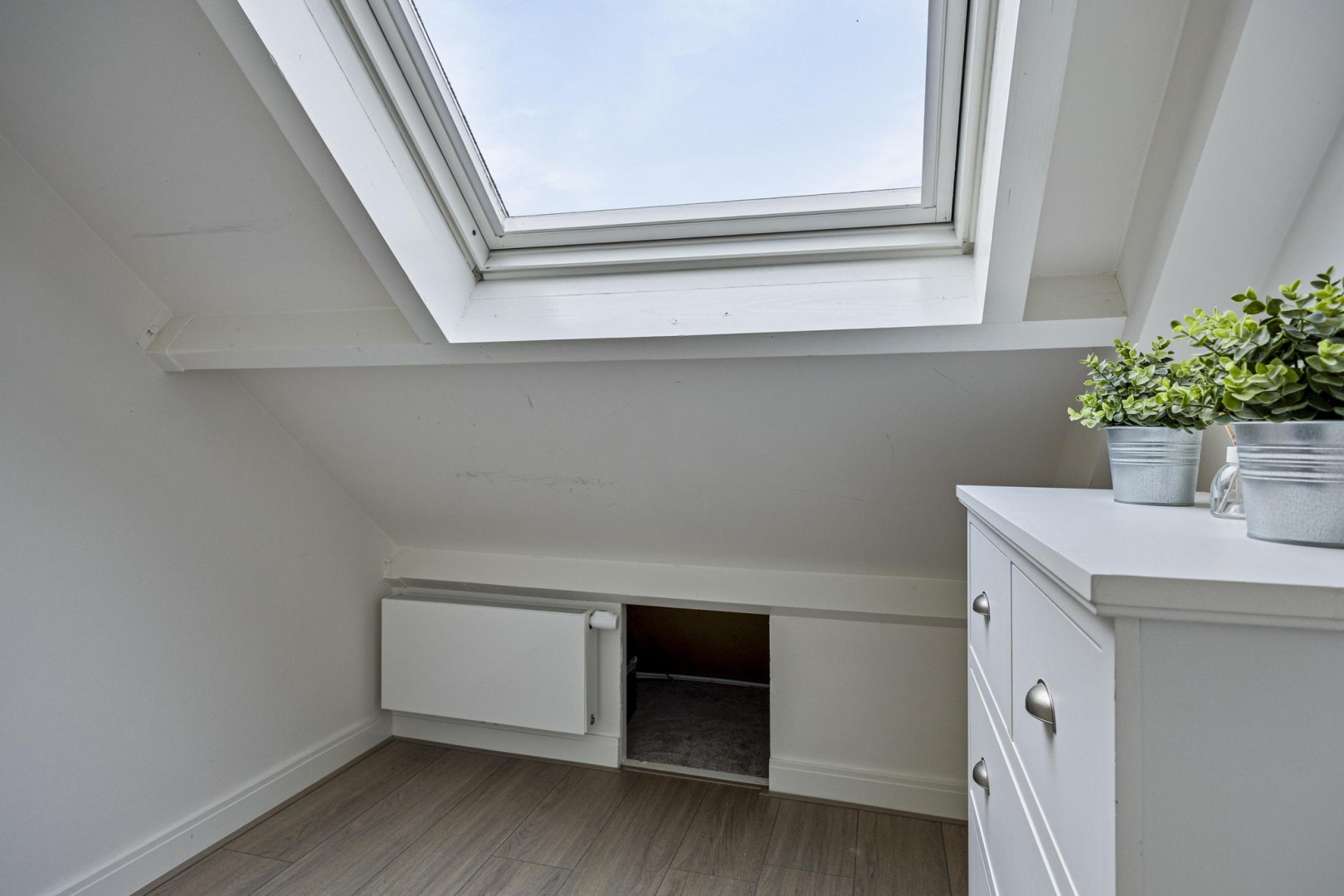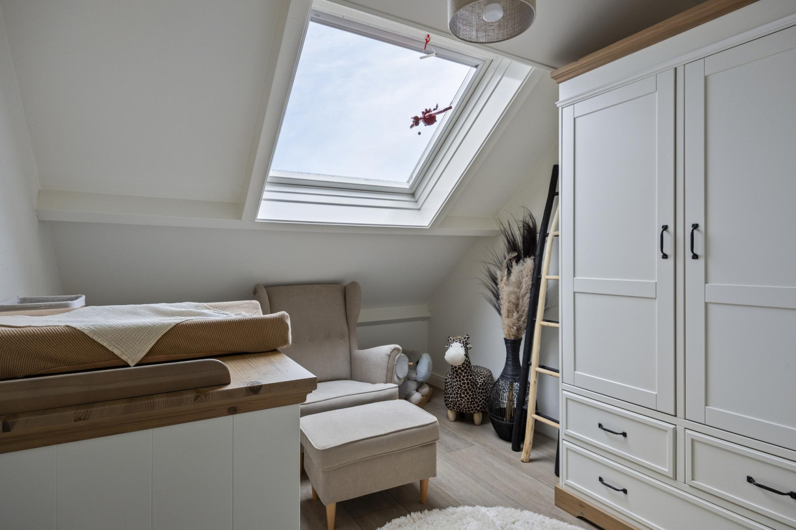 Overloop, 2 slaapkamers aan de achterzijde van de woning met beide een dakraam en extra bergruimte achter de knieschotten. Aan de voorzijde bevindt zich de ruime master bedroom en de luxe badkamer welke is voorzien van vloerverwarming, een ruime doucheruimte met dubbele douche, een dubbel wastafelmeubel, wandcloset, handdoekradiator en speakers.