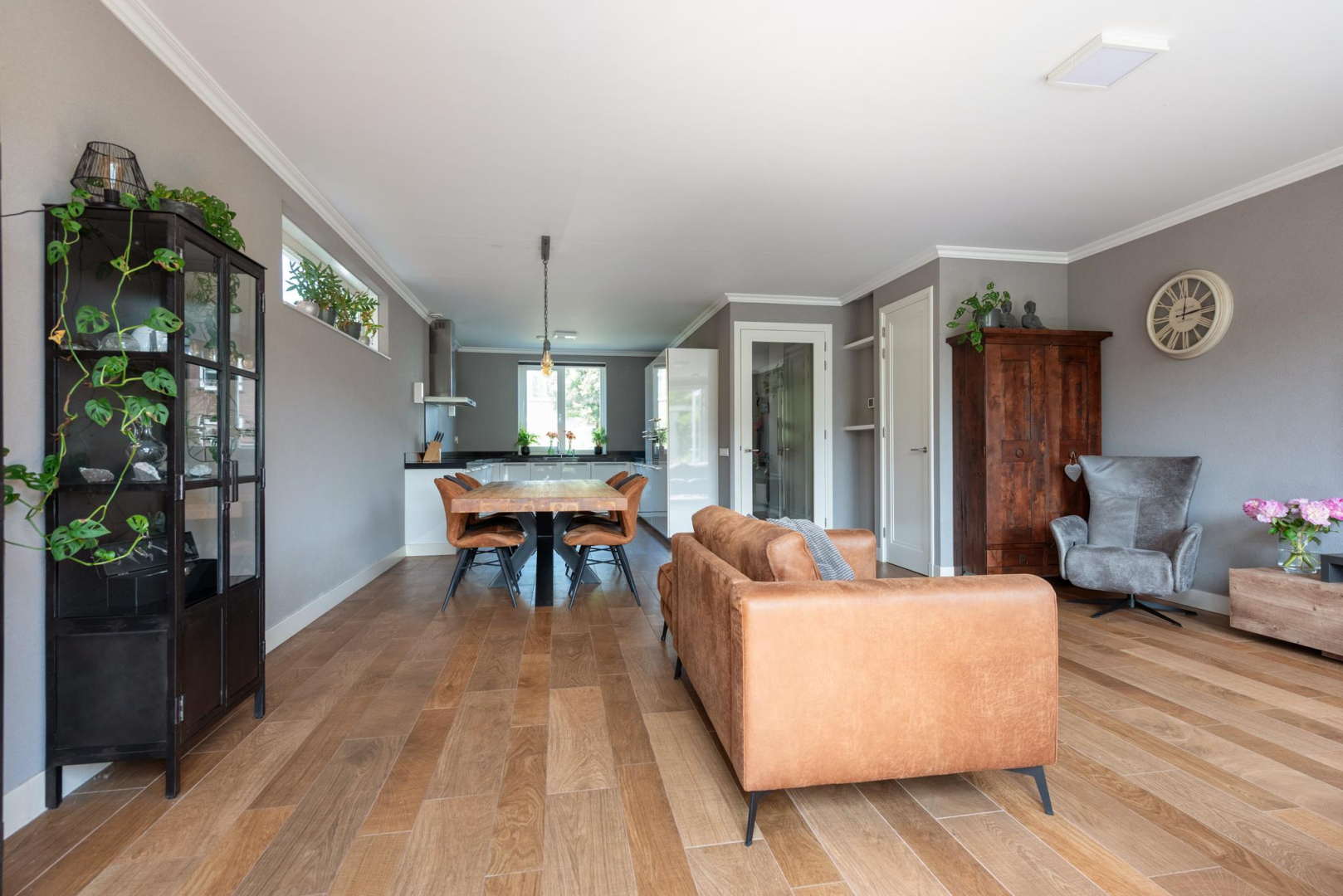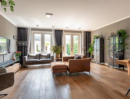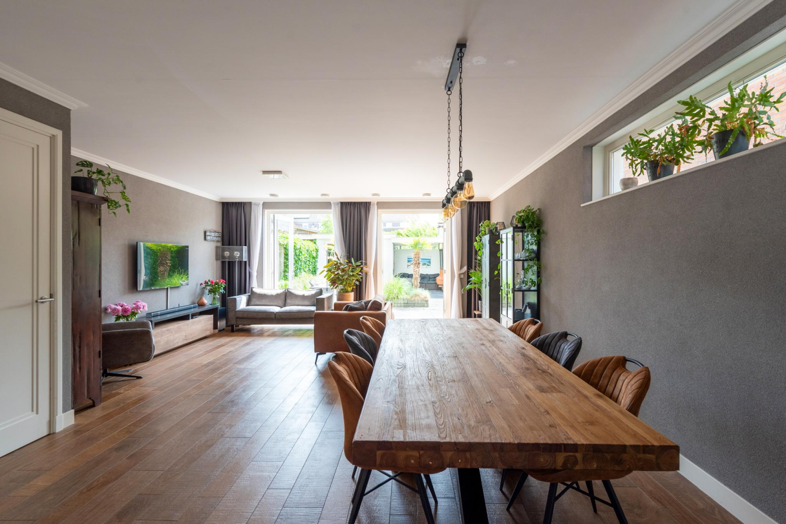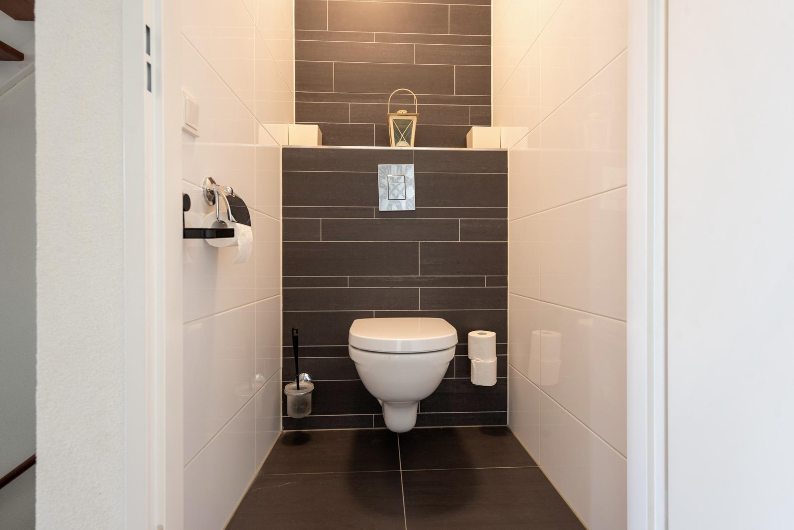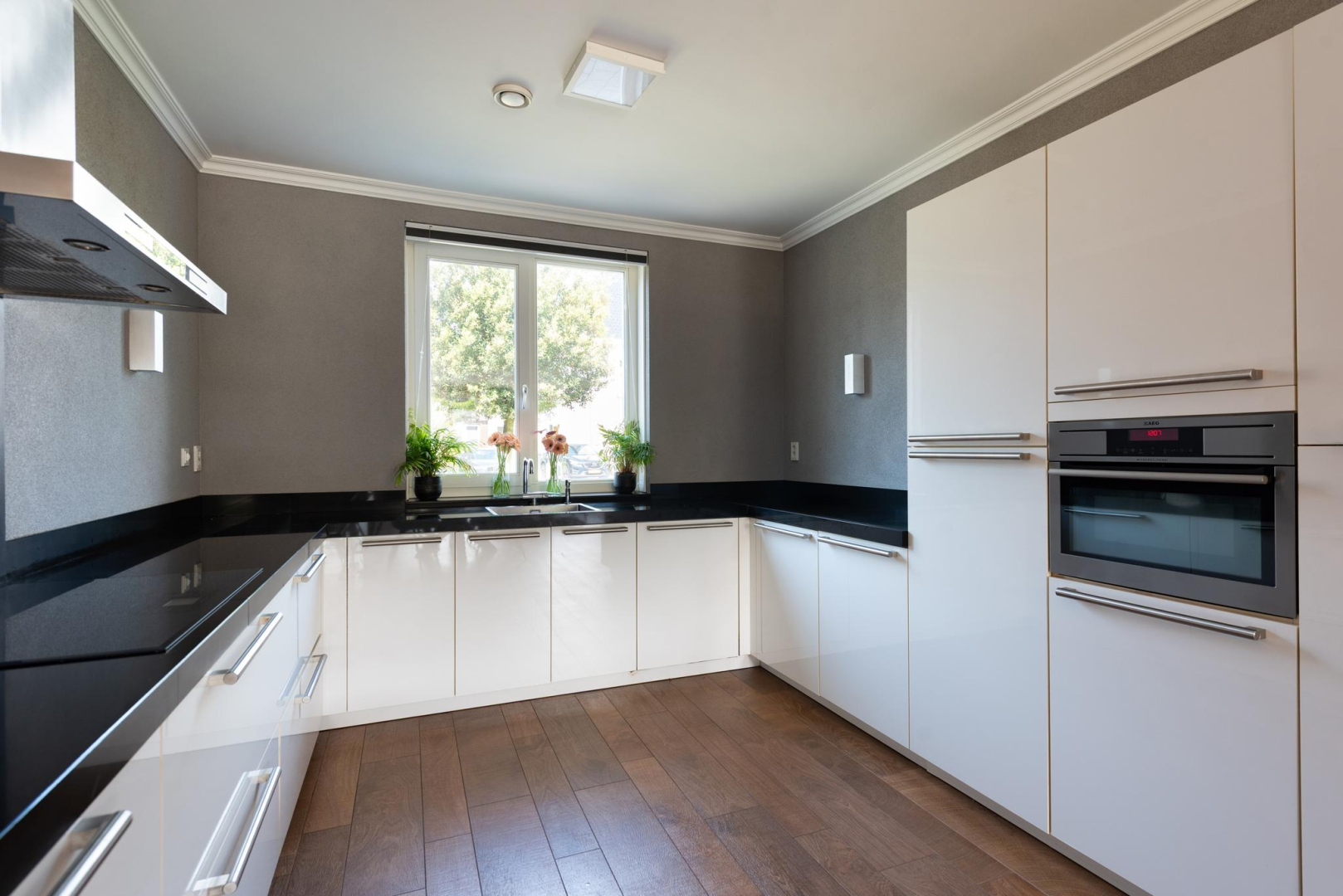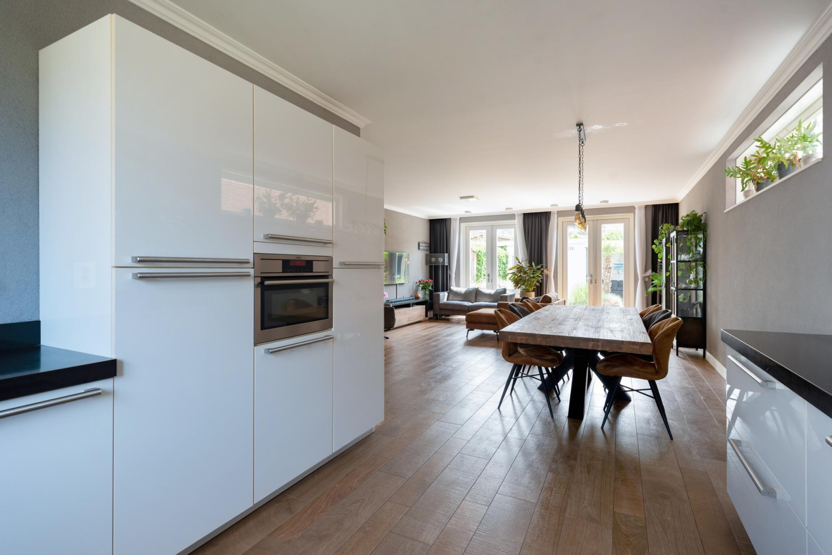 Bij binnenkomst betreed je de ruime entree, waar de garderobe, de meterkast en een moderne toiletruimte zich bevinden. De royale woonkamer is heerlijk licht en biedt volop leefruimte. Dankzij de praktische trapkast is er extra bergruimte, en de twee dubbele openslaande deuren zorgen voor een mooie verbinding met de fraai aangelegde achtertuin. Aan de voorzijde van de woning bevindt zich de luxe open keuken, compleet uitgerust met hoogwaardige inbouwapparatuur, waaronder een hoge koelkast, een combimagnetron met ovenfunctie, een vriezer, vaatwasser, inductiekookplaat en een roestvrijstalen afzuigkap. De gehele begane grond is afgewerkt met comfortabele vloerverwarming en een keramische tegelvloer, wat bijdraagt aan een aangenaam woonklimaat het hele jaar door.